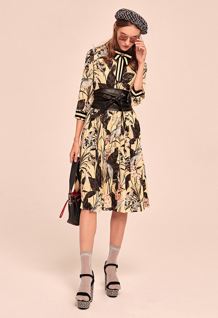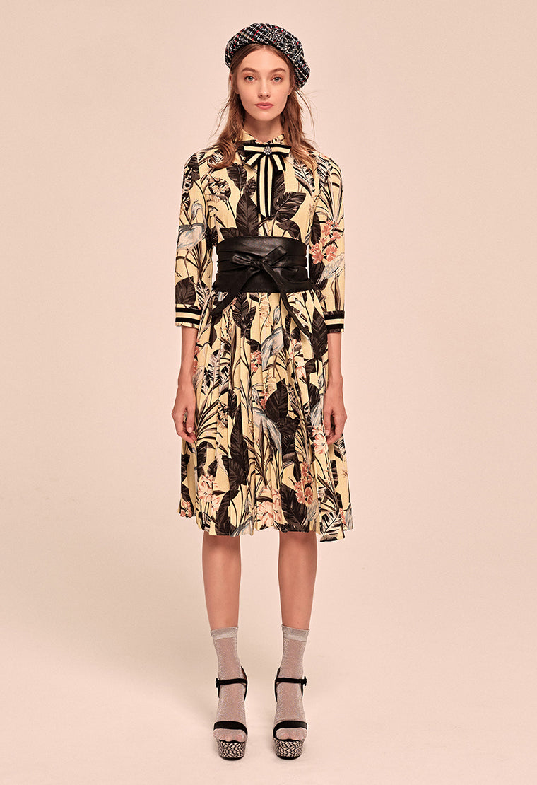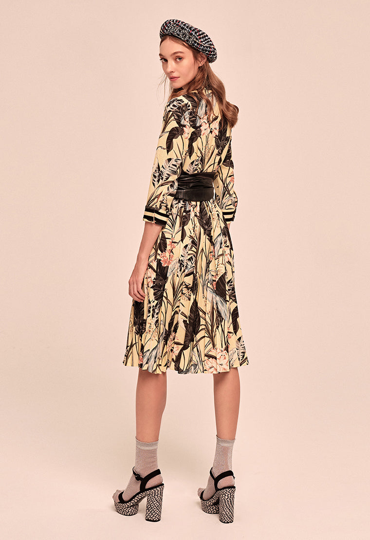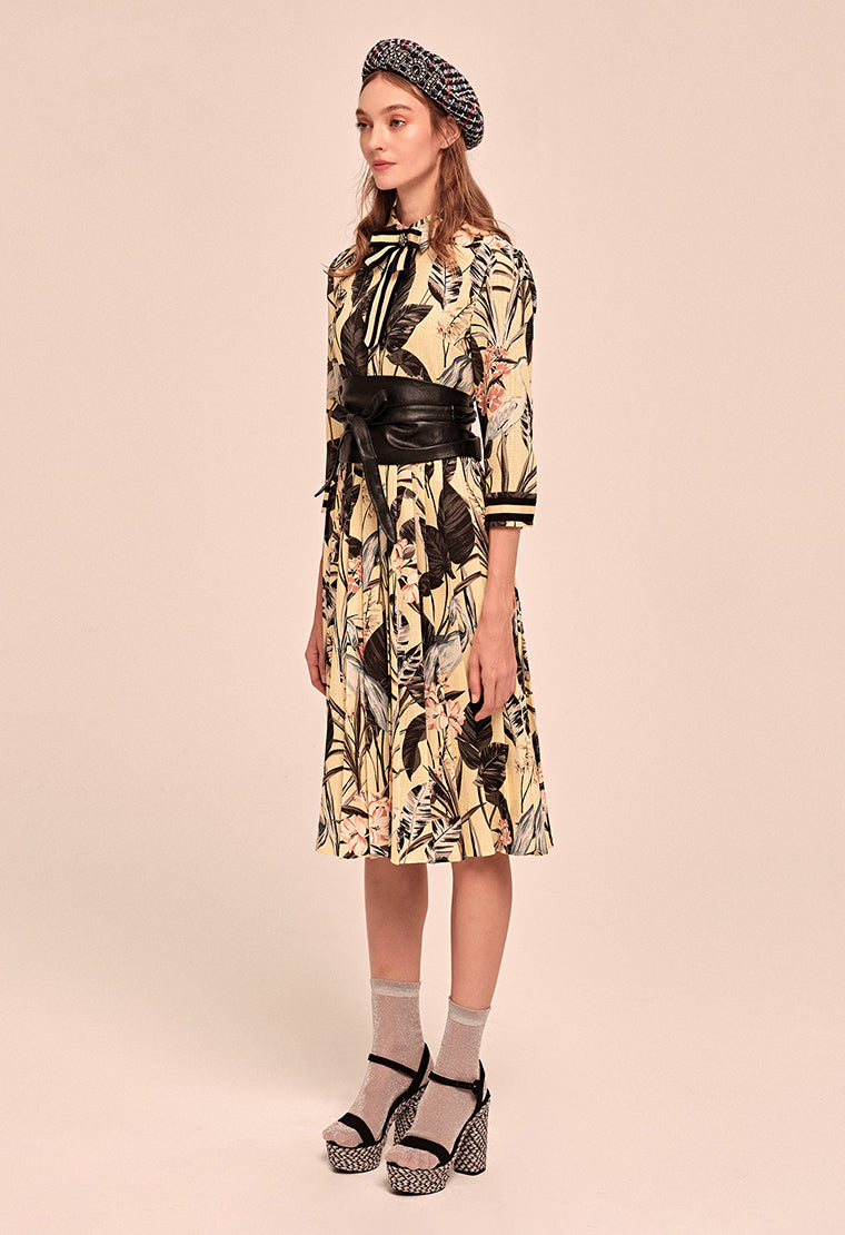 This floaty chiffon dress is printed with plant patterns. Black trimmed with a retro, "Paris" feel to it.