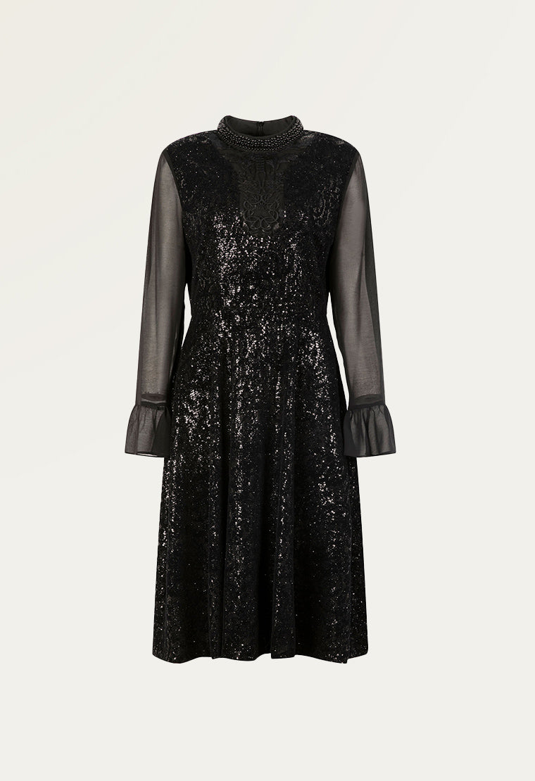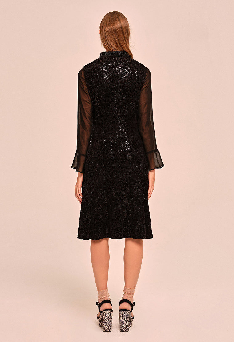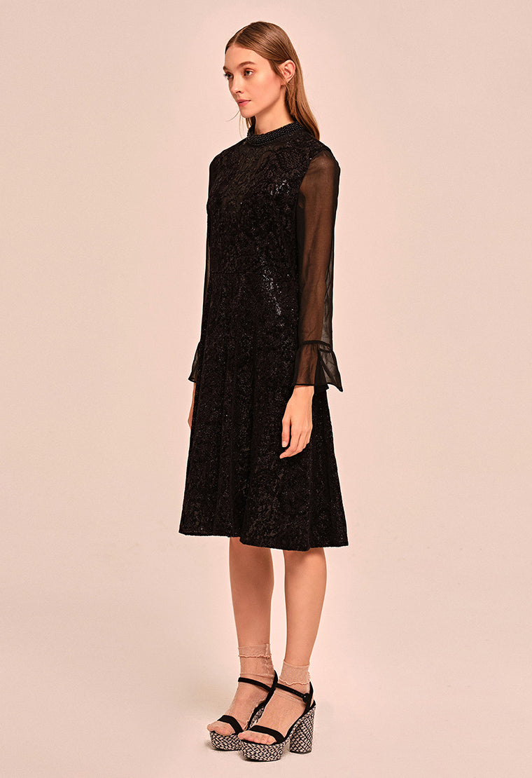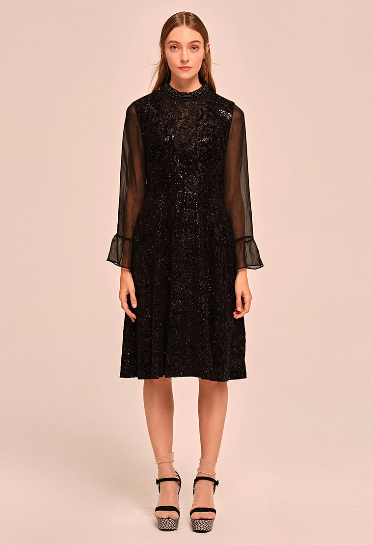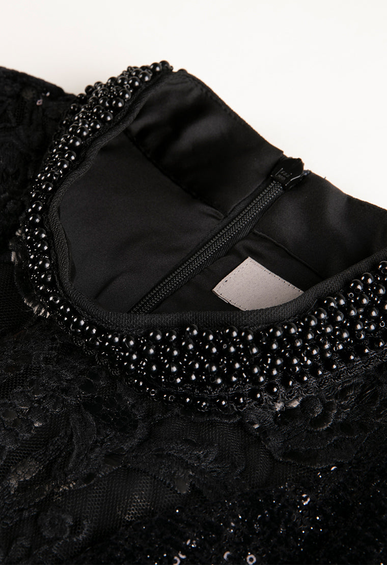 This evening dress is embroidered with floral patterns on the mesh fabric and its embroidery threads are mainly in black, white and gold. The embroidery is simple and tailored to add layering to the evening dress, seen to be an ingenious design.