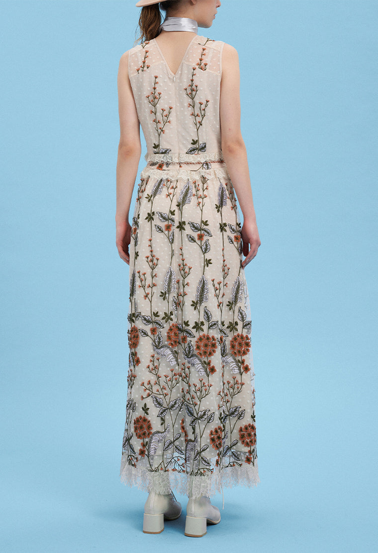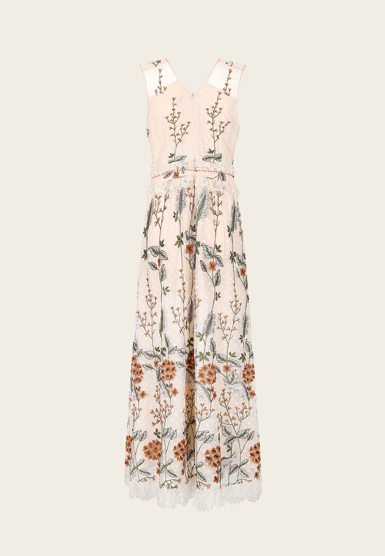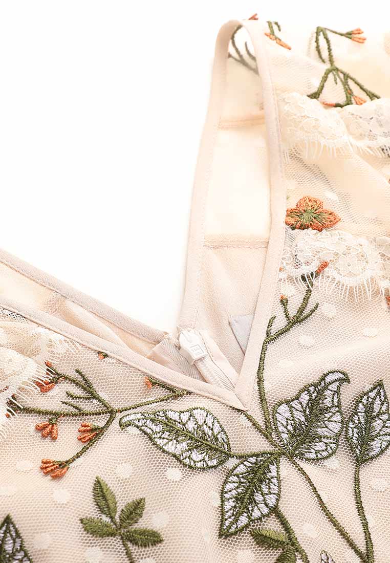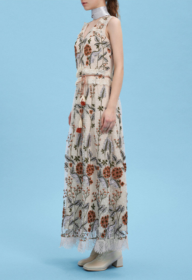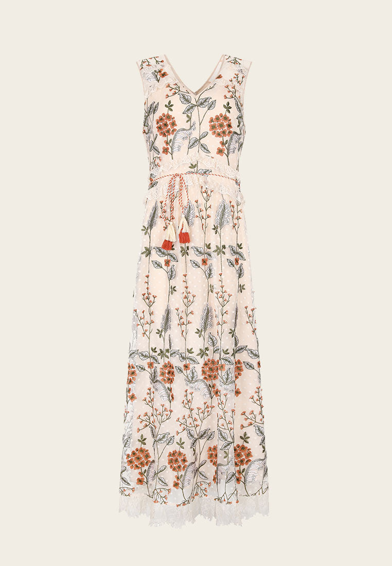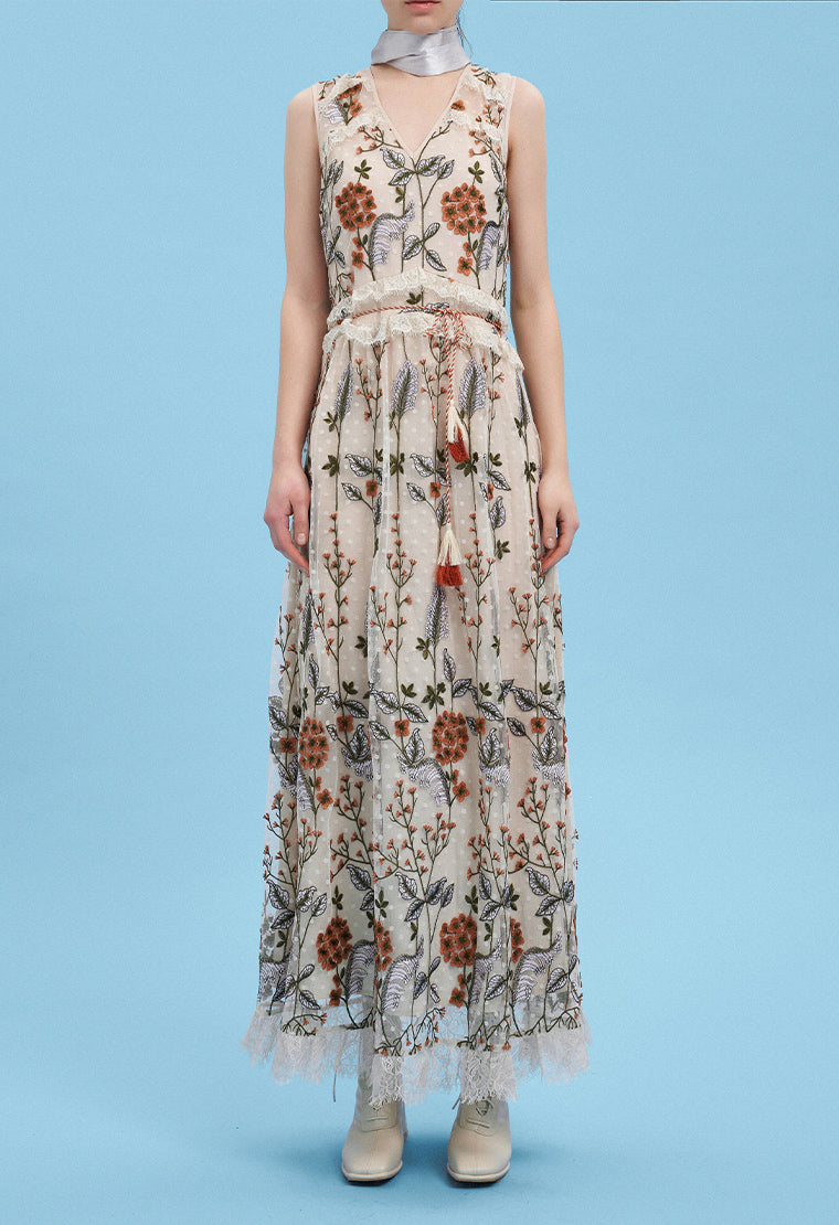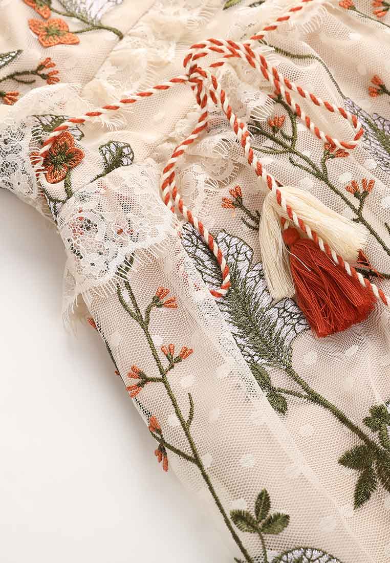 Delicate and lifelike flower embroidery, like wearing a piece of aquarelle art, extraordinarily noble and full of artistic flavor. The waist is decorated with lace and tassels, exuding a light and graceful posture.
