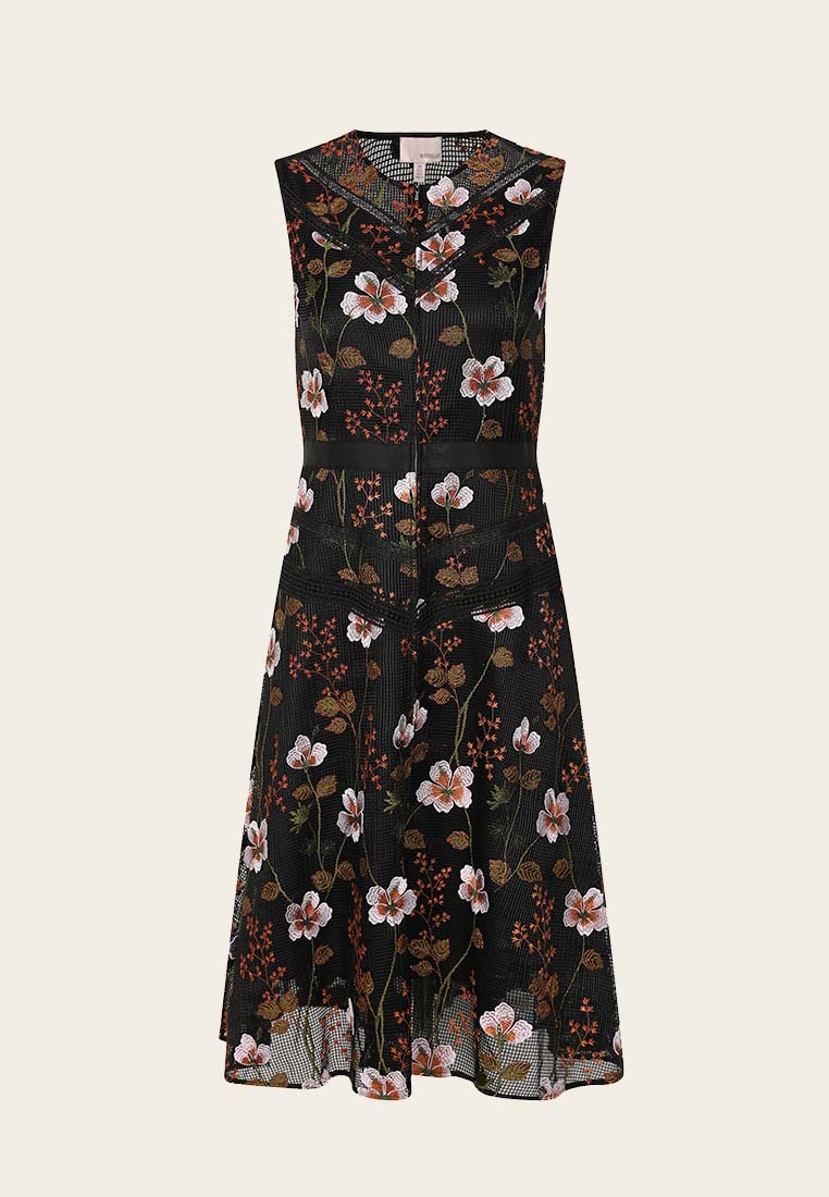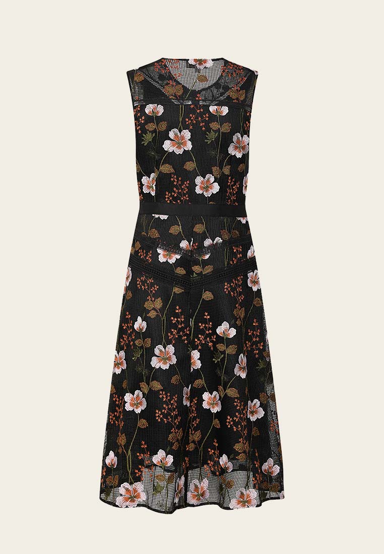 Part of the Resort '22 collection, Floral Embroidered Sleeveless Midi Dress is the perfect dress for every special occasion. A garden of embroidered flowers elegantly blooms on a fit-and-flare dress with some lace details for extra allure. Wear it with classic pumps.