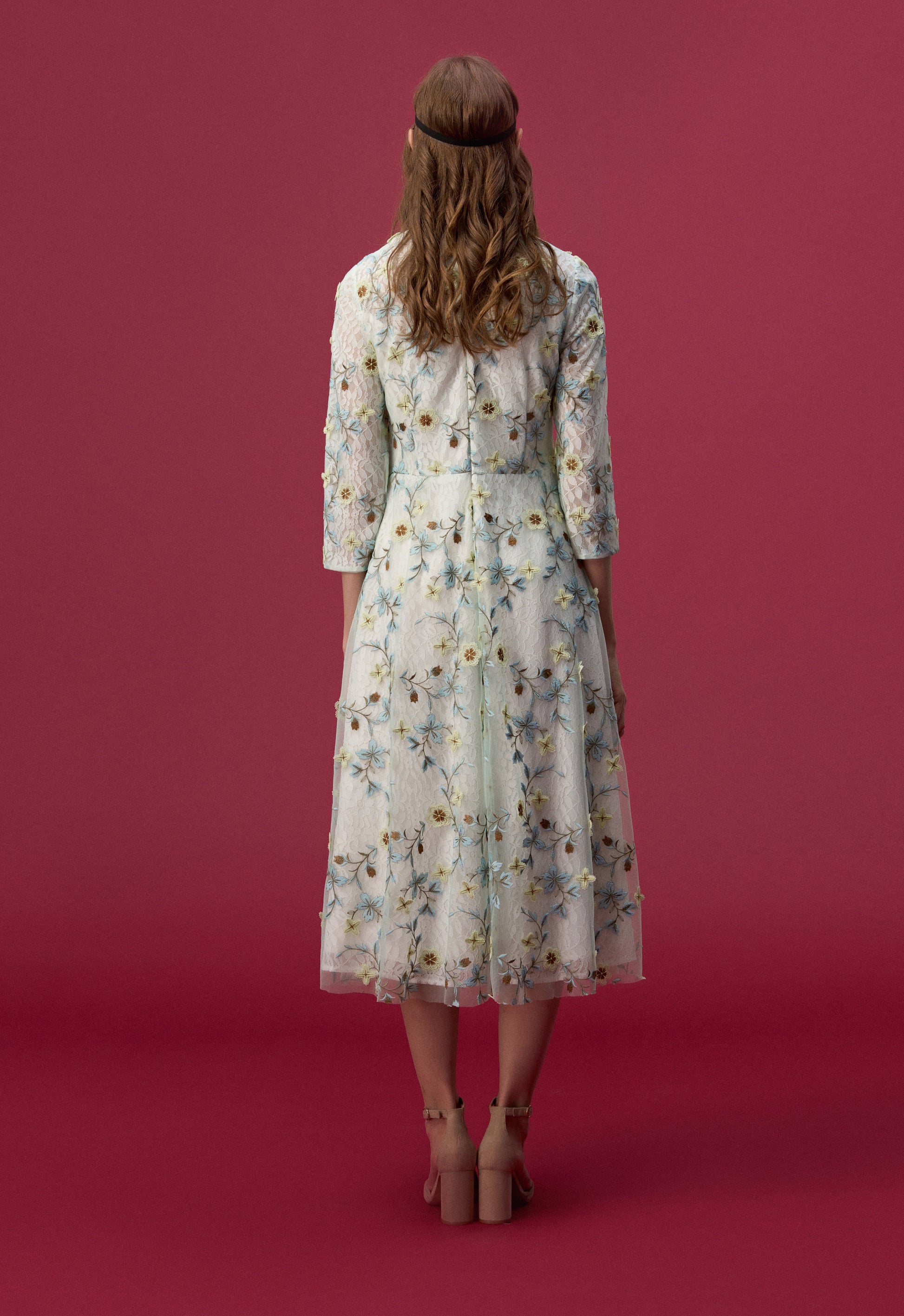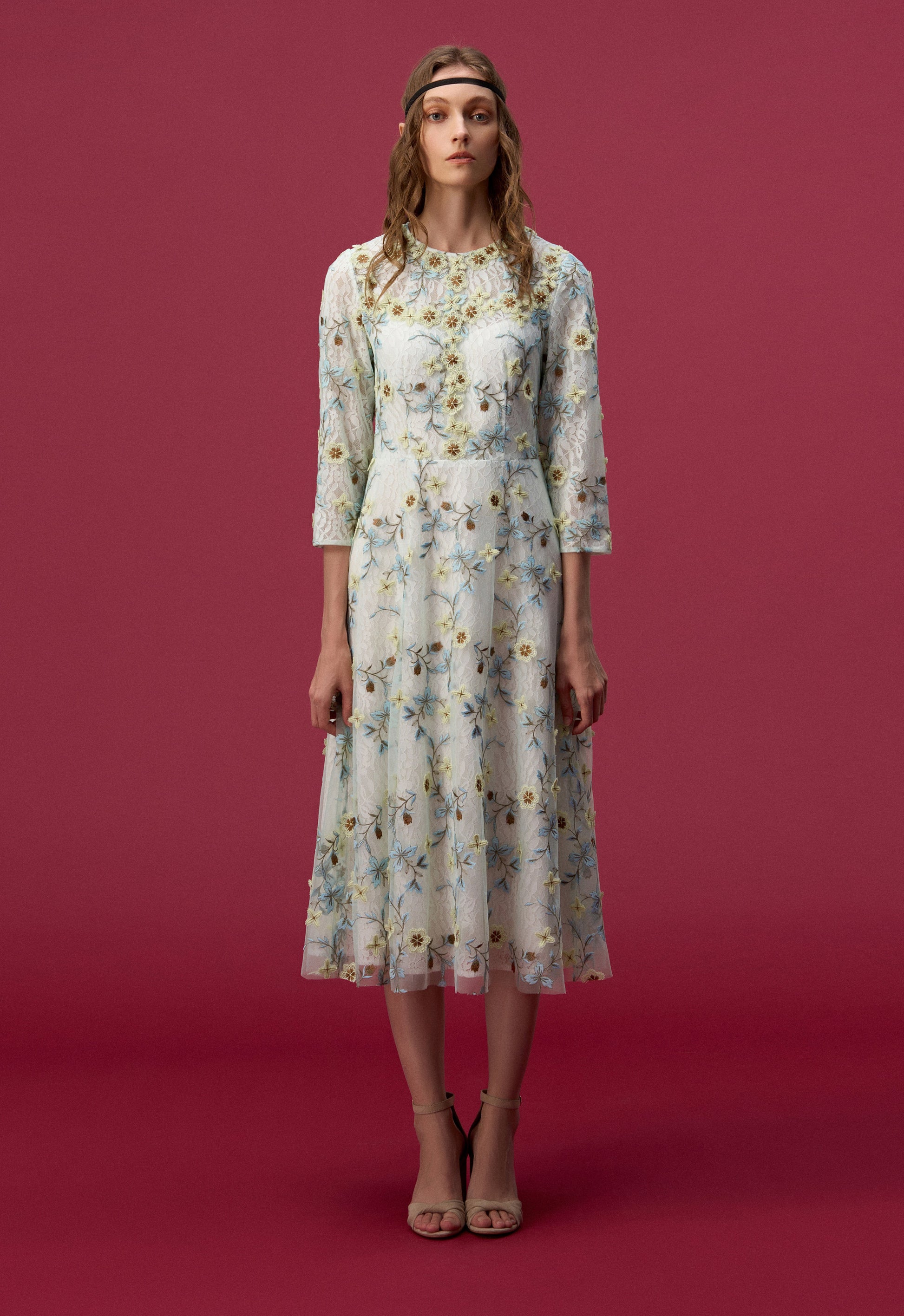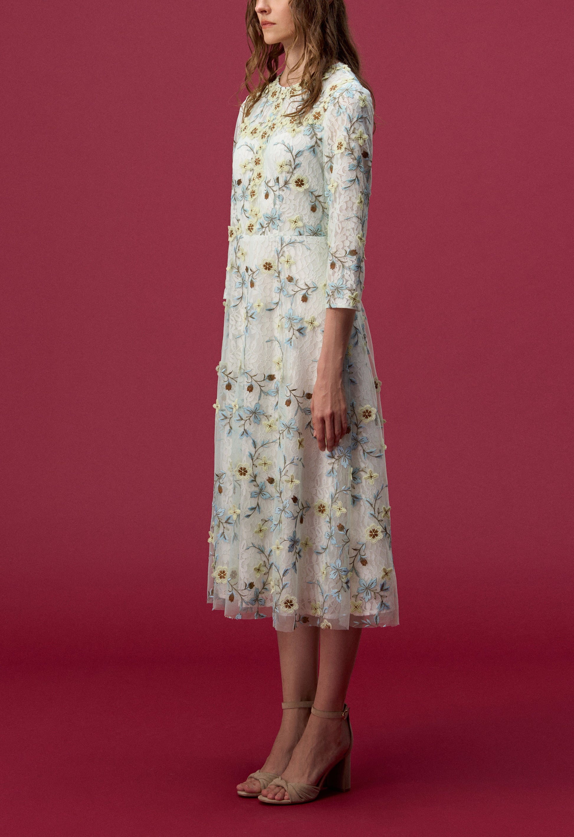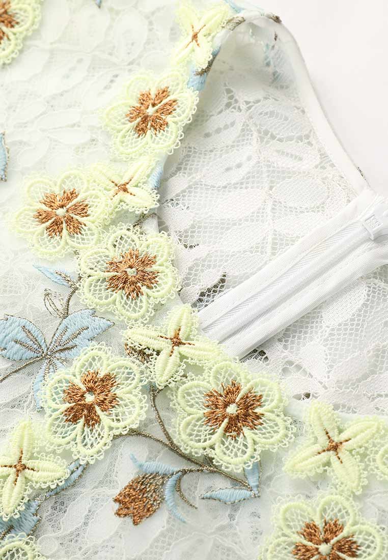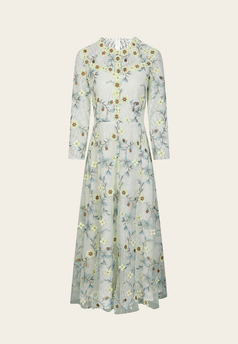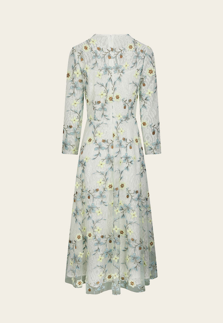 Floral jacquard white lace, embellished with impactful Color combination floral patterns. Light green flowers with brown stamens stand out on dull blue vine. The silhouette of the piece reminds the understated feminine charisma of south-east asian styling.