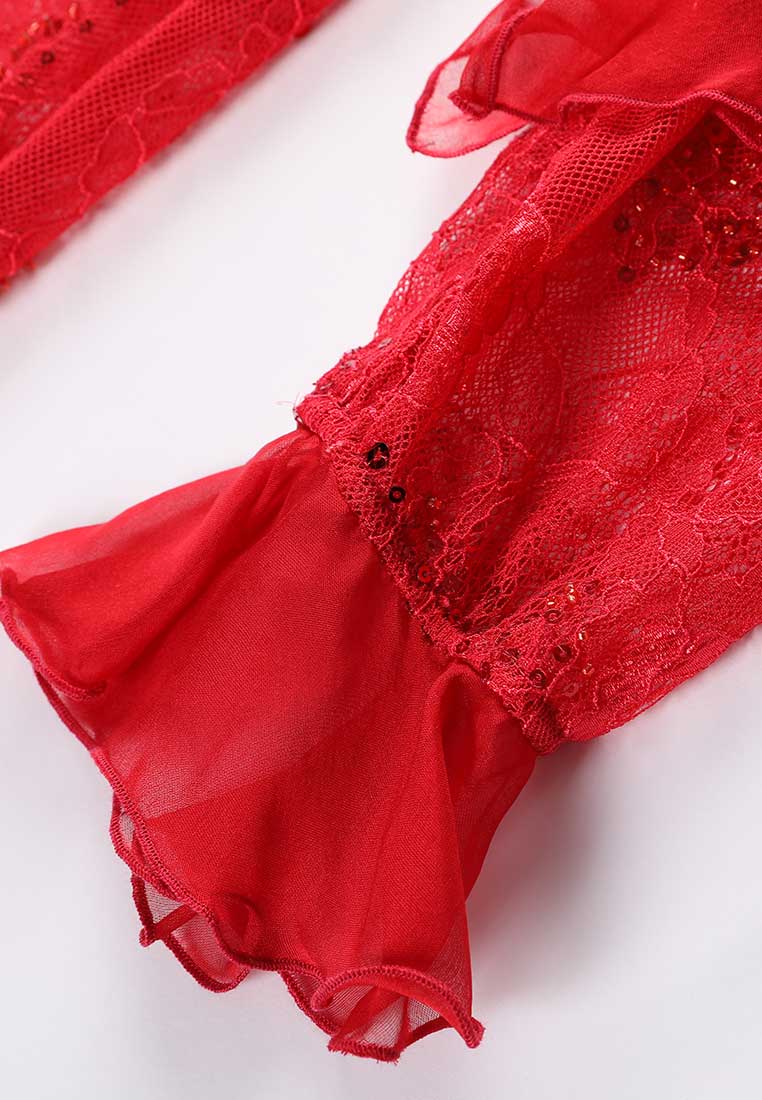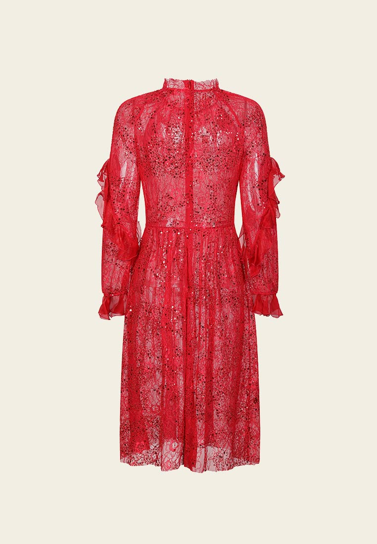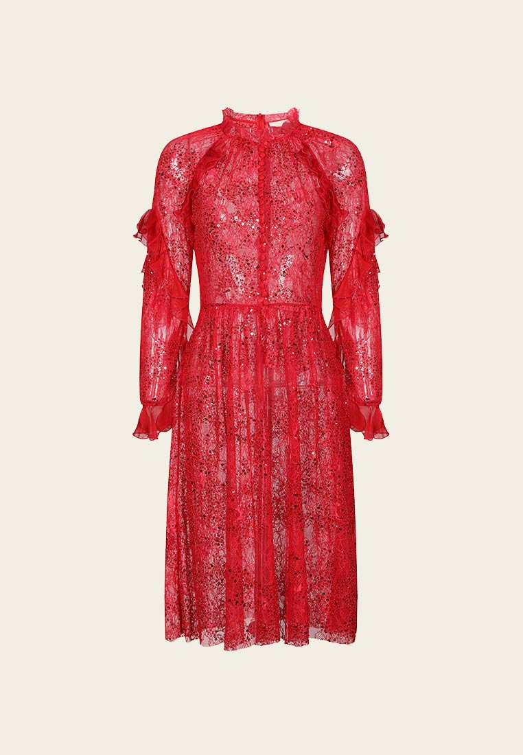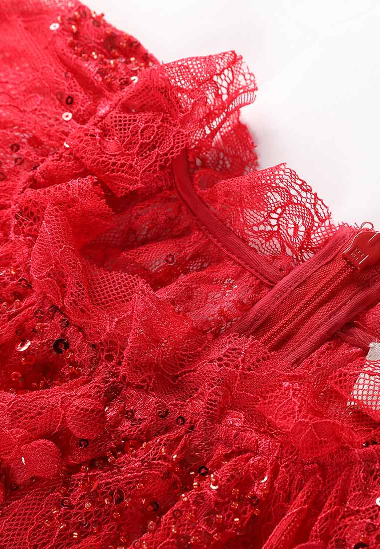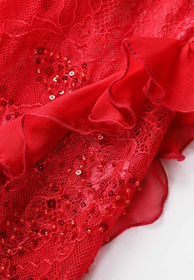 This stunning dress is cut from flower-embellished lace in light red hue and decorated with sequins to give a sexy and glamorous vibe. It has a gypsy hem and emphasises the waistline that will catch the camera's flashes. It is perfect to wear with high heels for a night party.