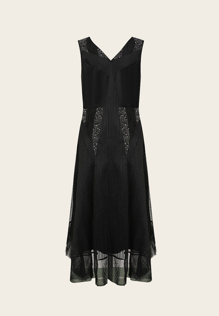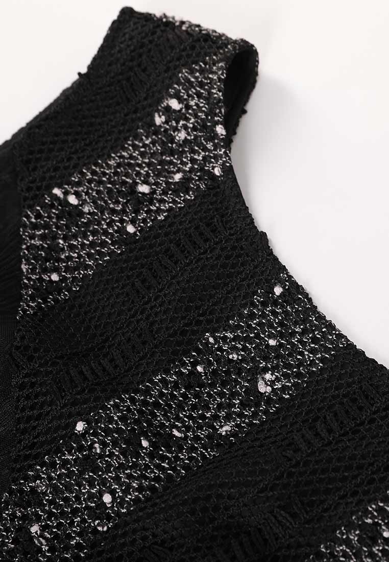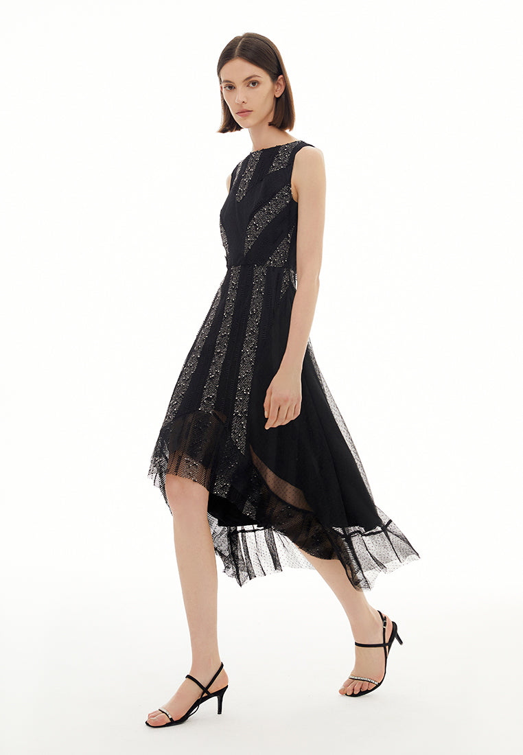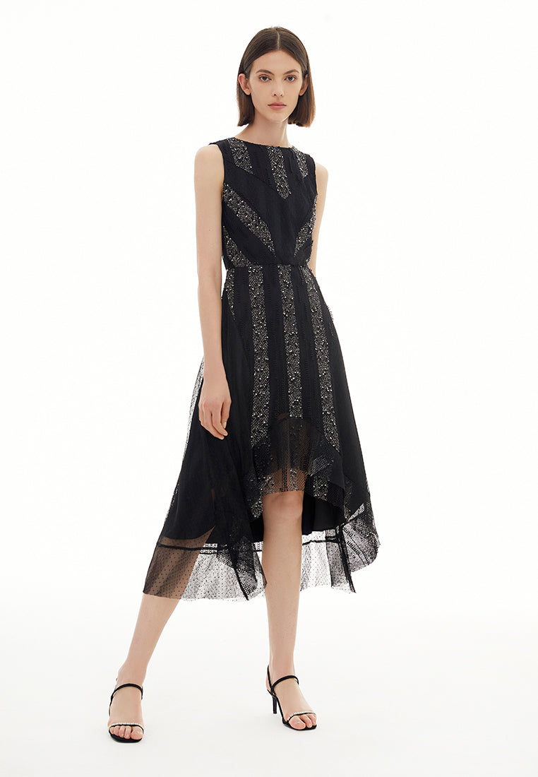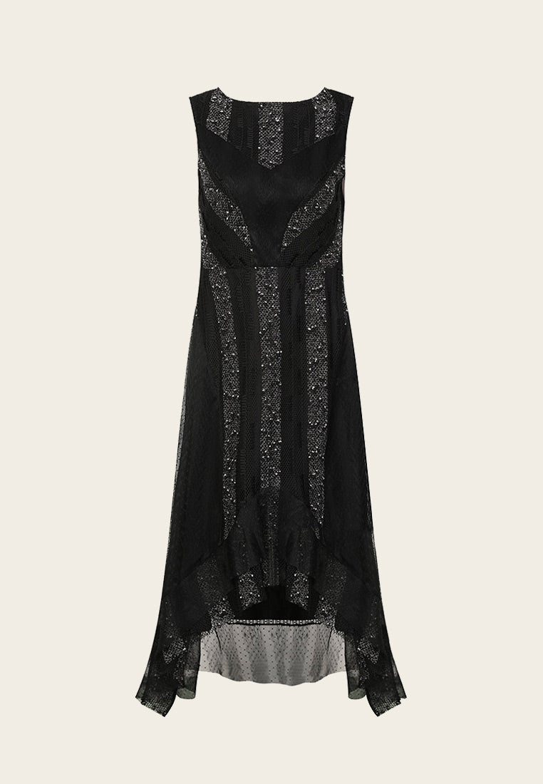 Black Sequins Stripe Detail Lace Sleeveless Cocktail Dress