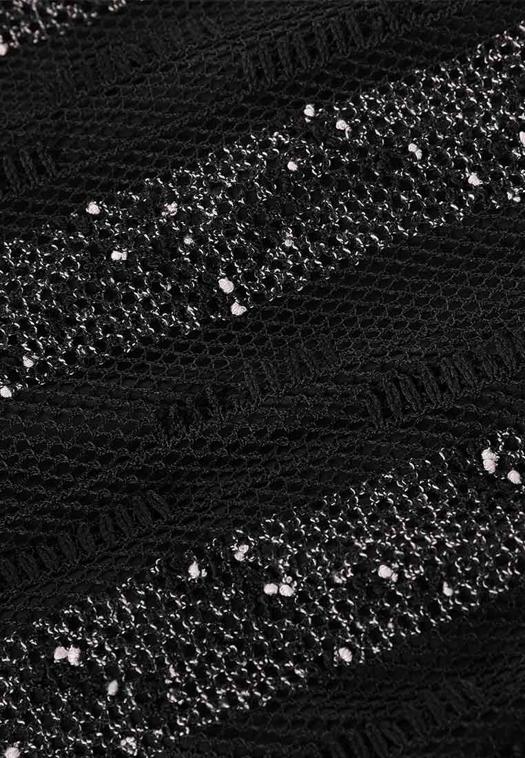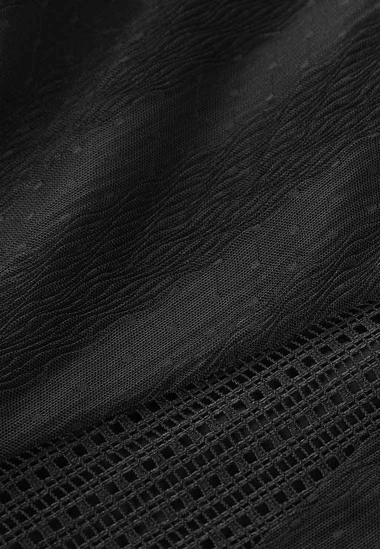 A statement piece in black, with low-key colorway details that draws attention. Contrasting lace lined up accordingly, delightfully accentuate your curvy shape. Interwoven white thread and knots generate a glimmering illusion. Wear yours in black or silver accessories.