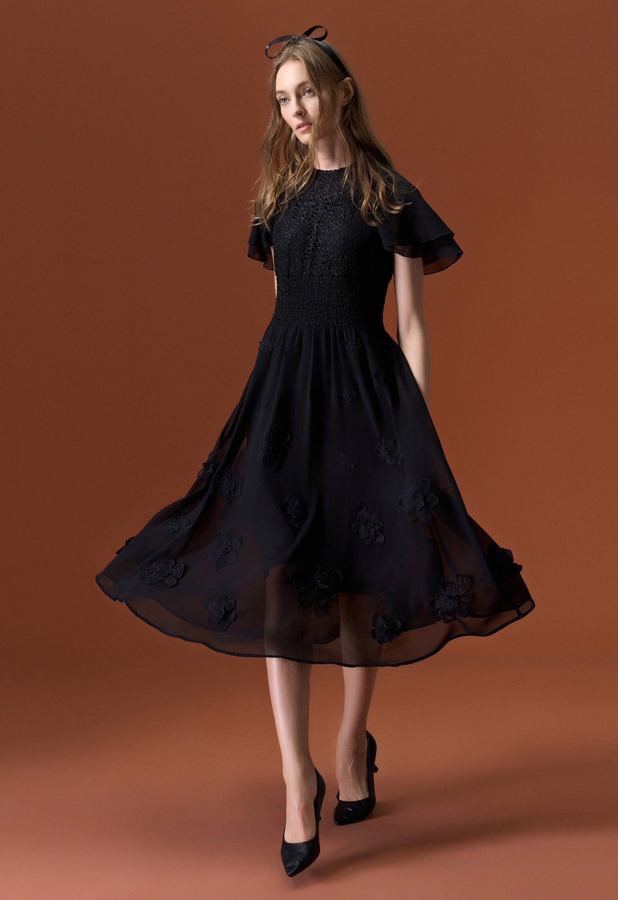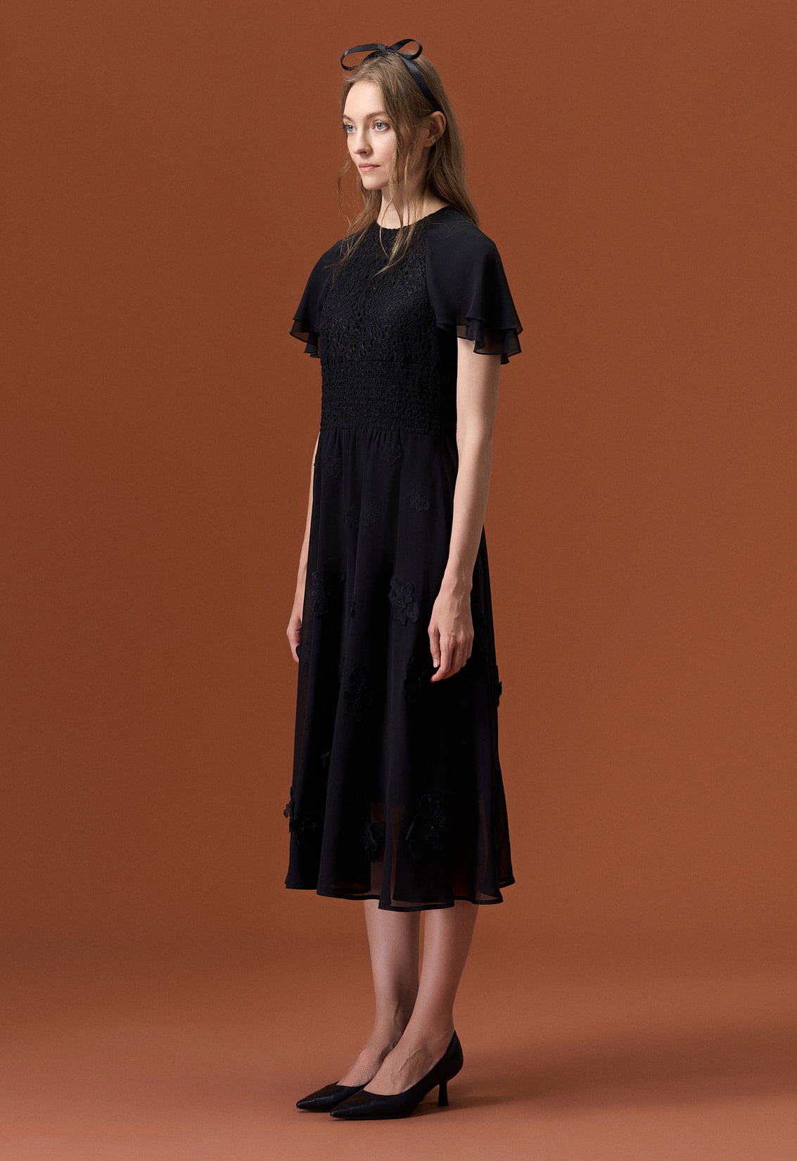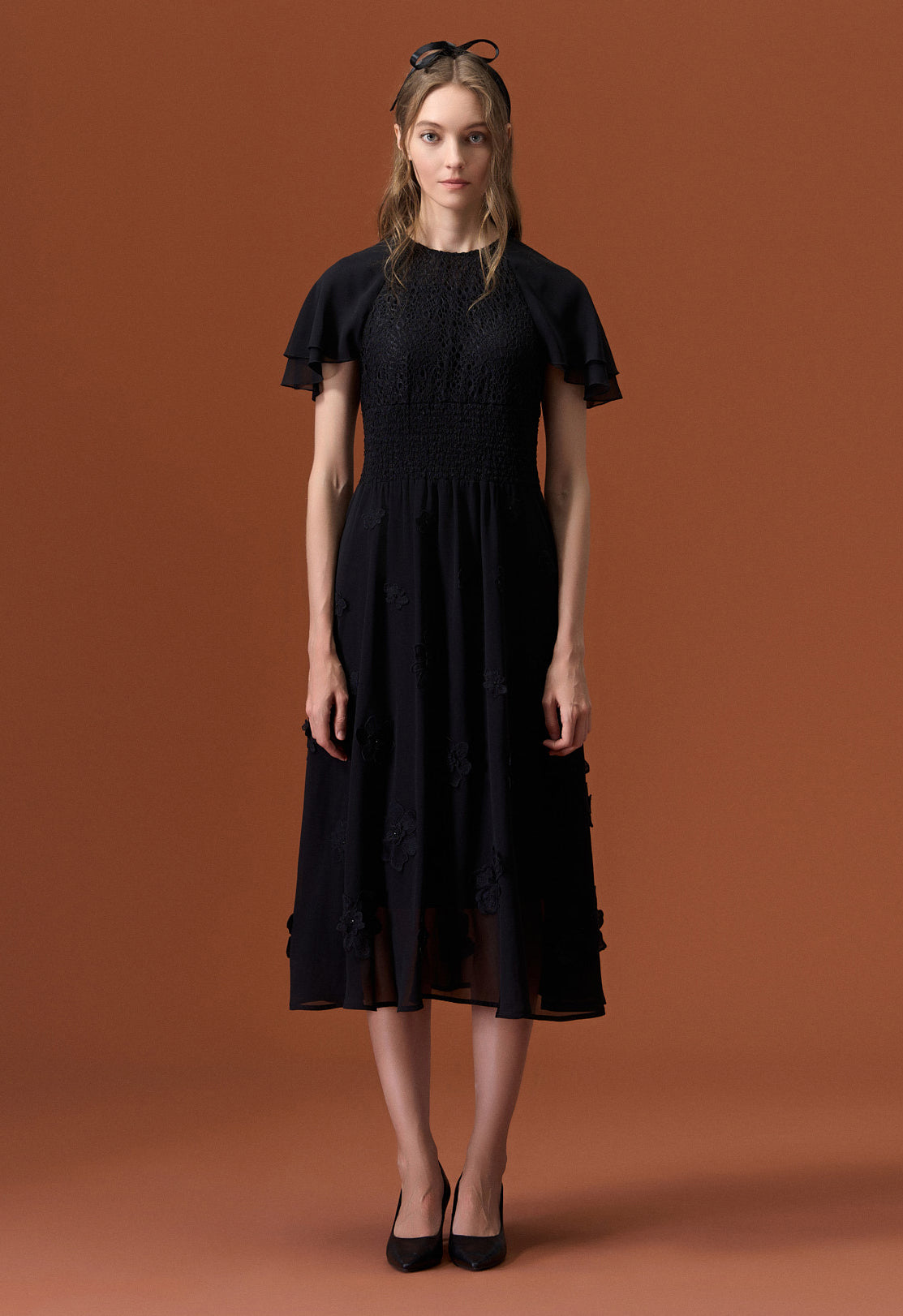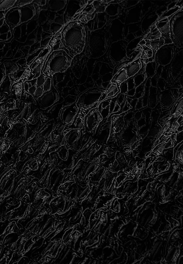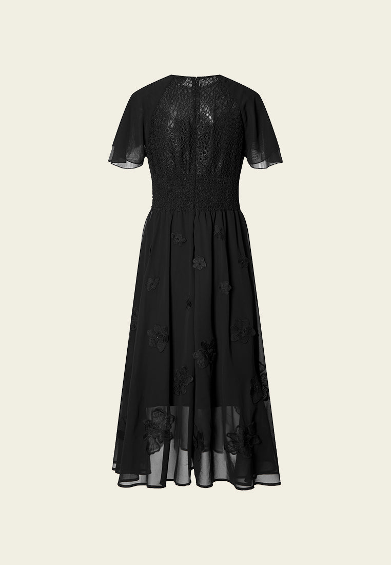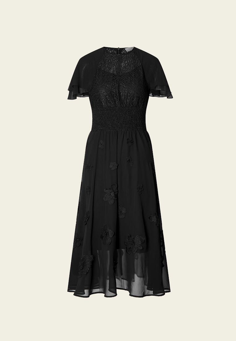 A subtle black cocktail dress rich in low-key details. Jacquard lace top patchwork with chiffon sleeves and bottom. Same colorway lace flowers embellish below the waist. Best for evening events, cocktail events and commercial dinners.
