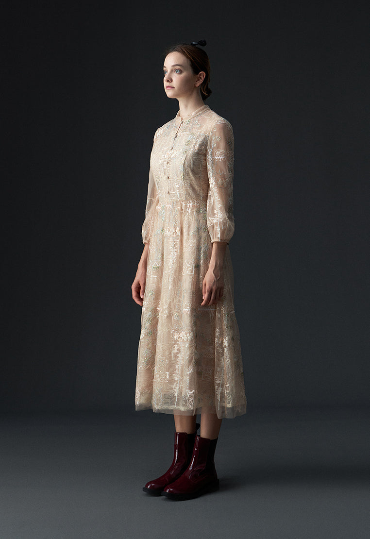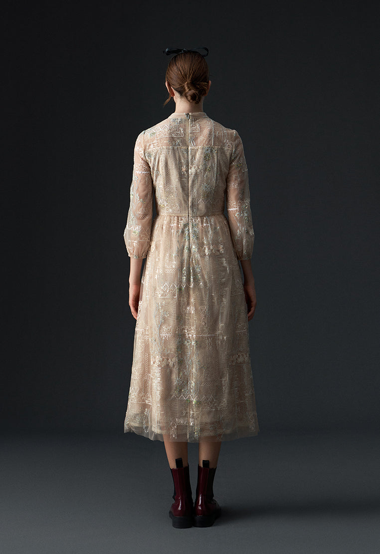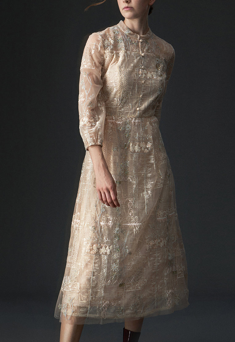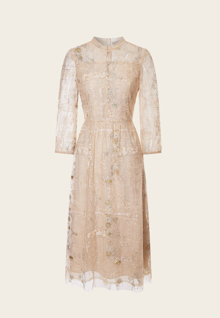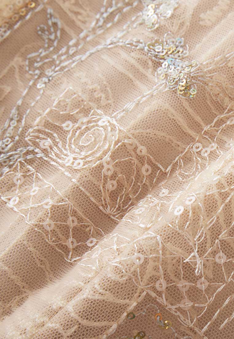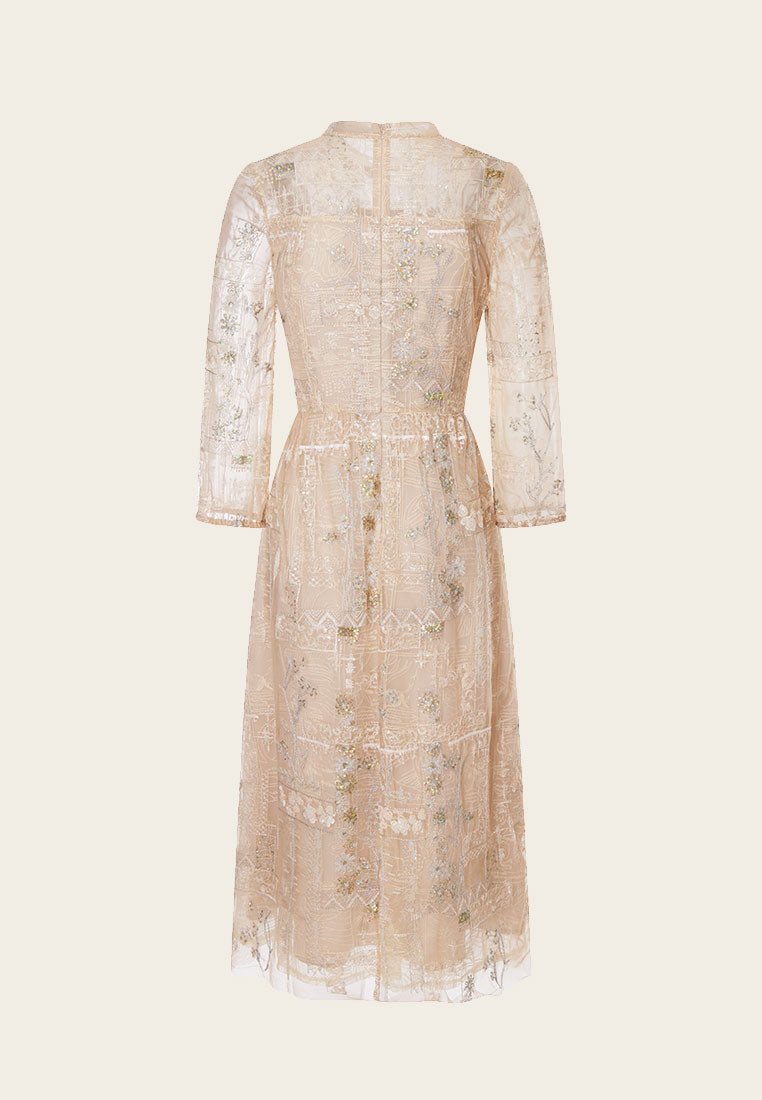 Beige Embroidered Sequin-detailing Mesh Dinner Dress