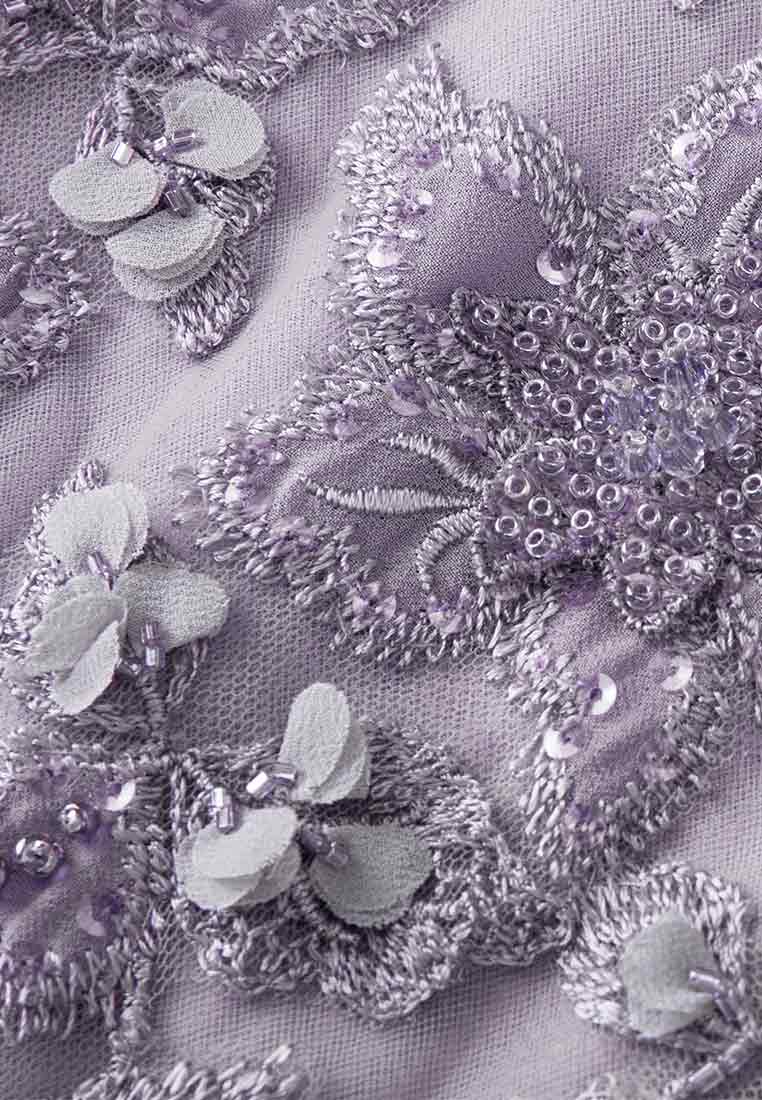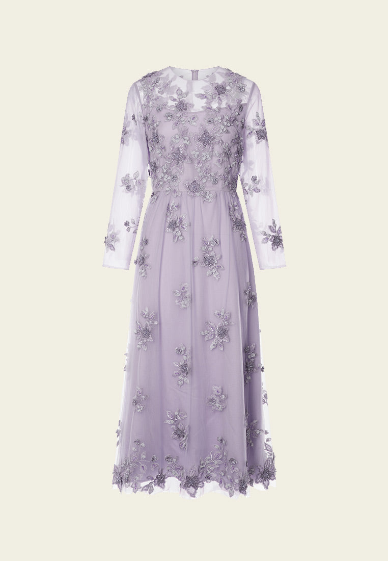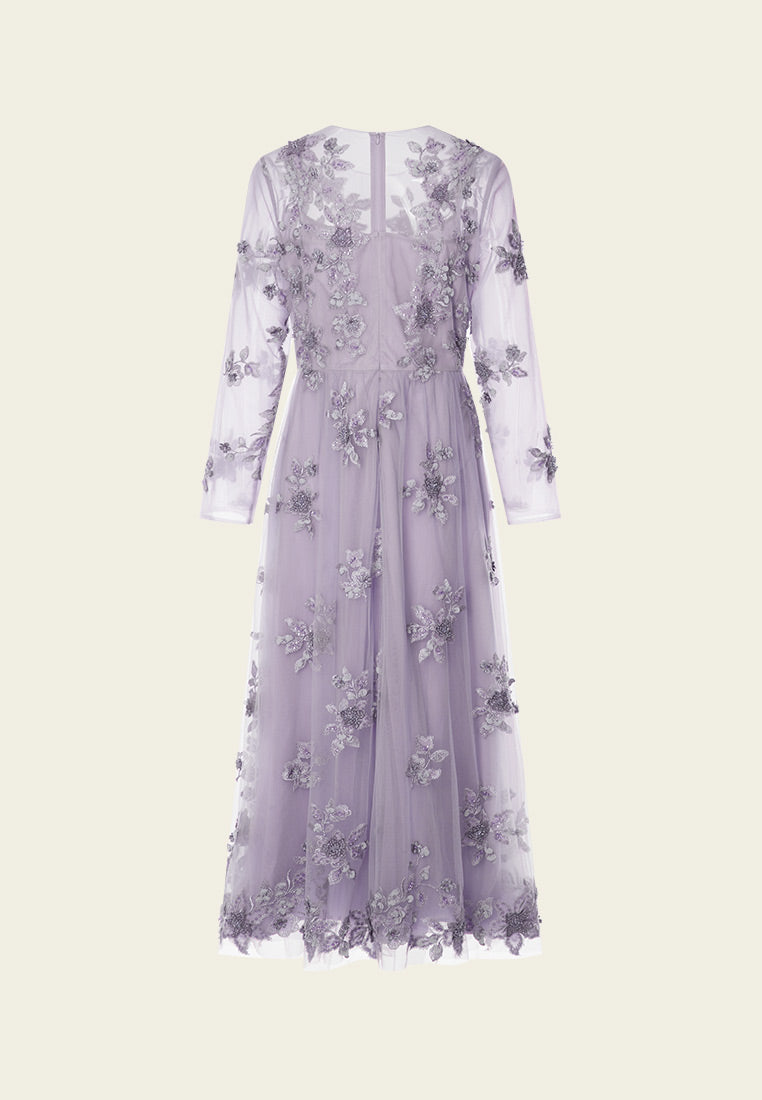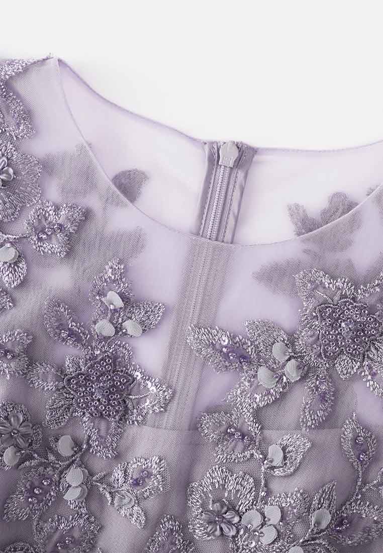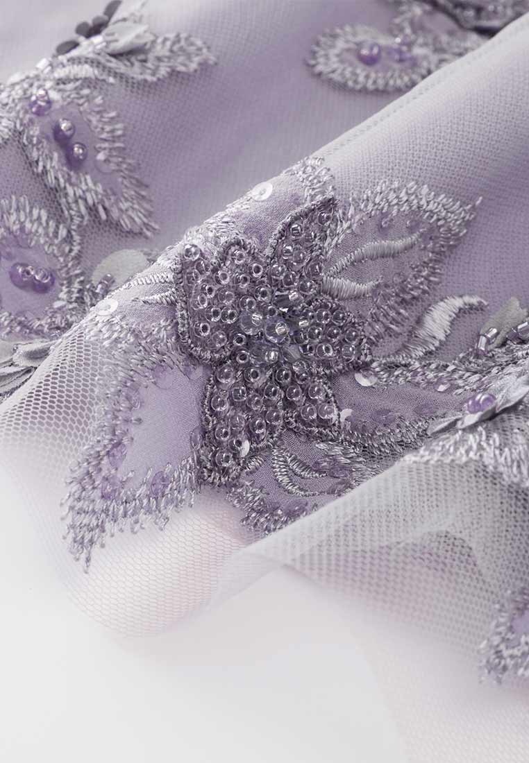 Make your lavender fantasy comes true with this latest item. Light lavender lithe mesh on your skin, naturally evokes your refined charisma. Intricately embellished with sequins, embroidery flowers gracefully falls on the dress. A perfect dress for dinners and cocktail parties.