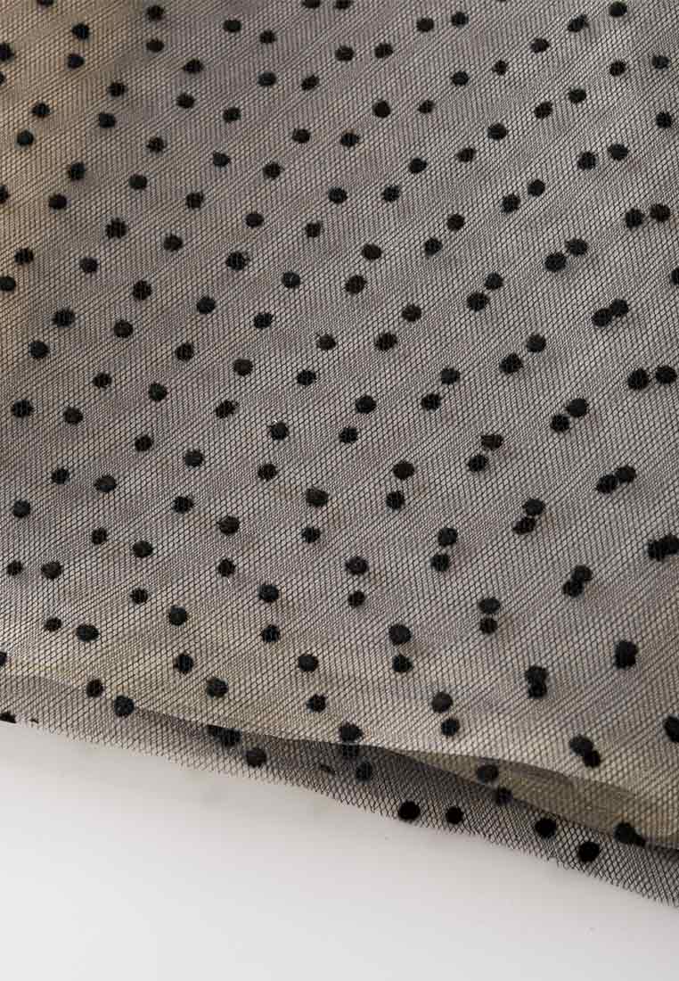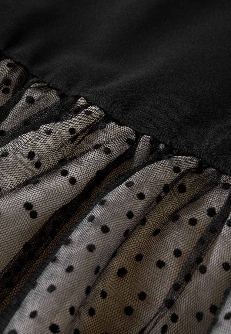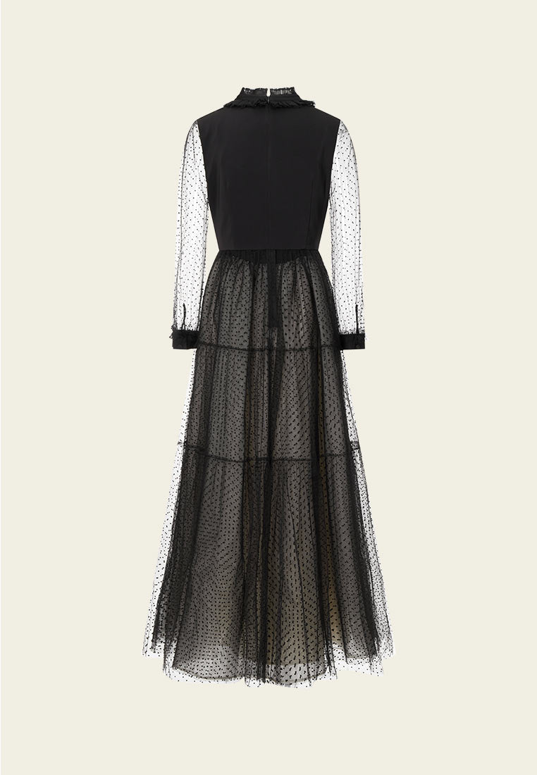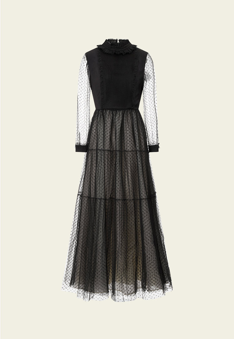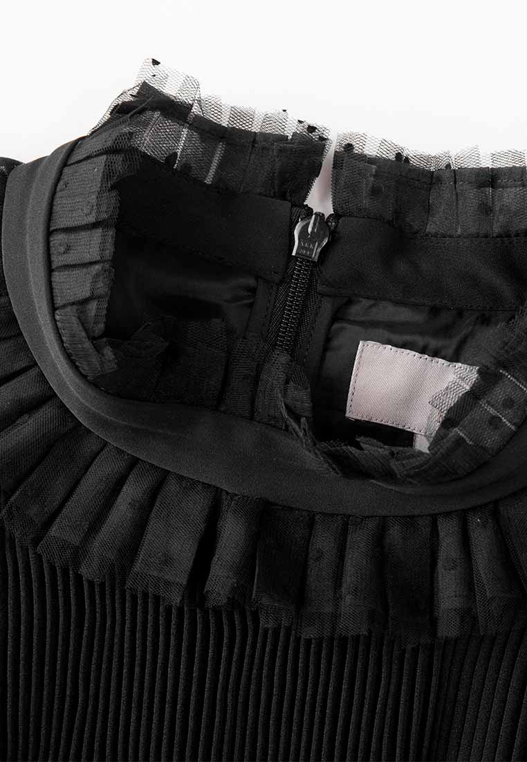Refined whole-black dress with opulent ruffle, pleated and dotted details. Ruffle embellished stand collar, surrounding pleated details at the bust. Mesh Sleeves and below the bust in dotted pattern. Rich details in same color tone infuses subtle rhythm and volume into the piece. Ideal for cocktail party and commercial dining.