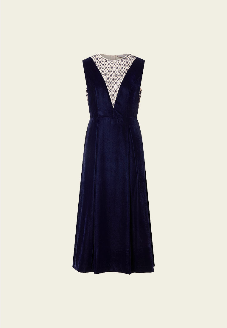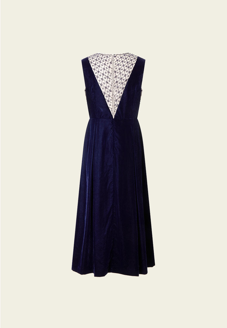 A sophisticated piece, timeless, classic. Sleeveless sapphire blue velvet dress, ankle length, highlighting V-shape cutting with delicate patterns intricately embedded with crystals and beads from collarbone to the waist. Ideal for cocktail party and evening dining.