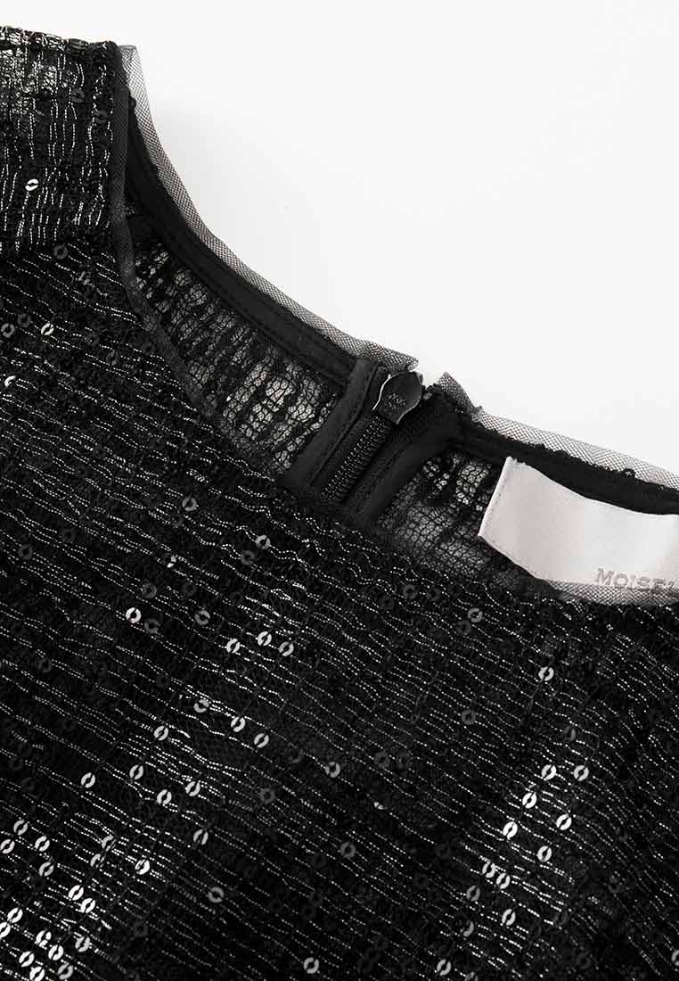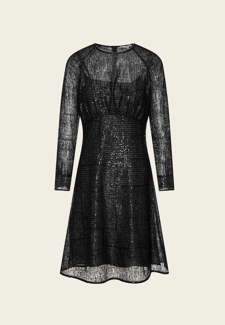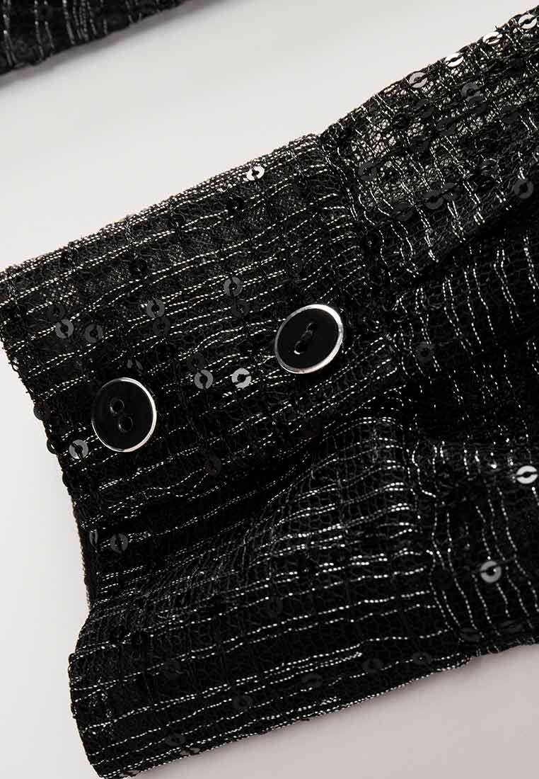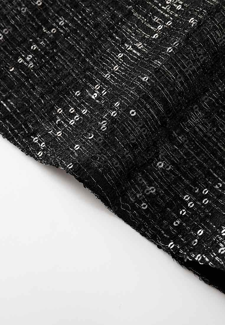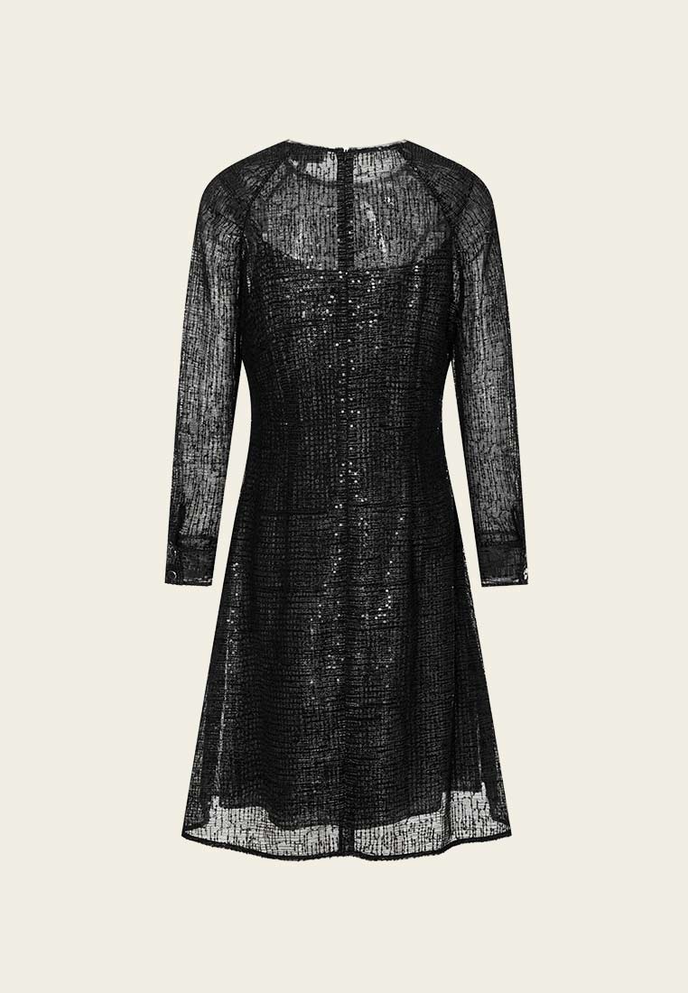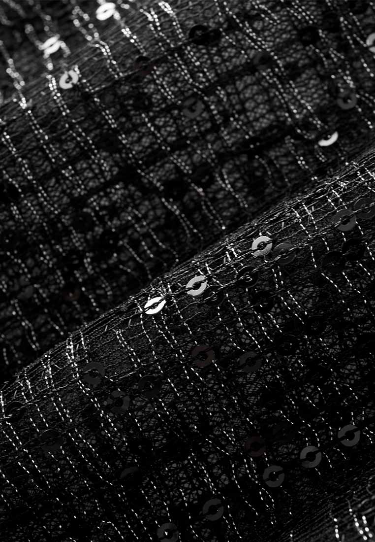 Jacquard organza dress intricately interwoven with shimmering silver thread and sequins, contrasting with black organza. The silhouette boasting the bust and waistline. Embedded inner makes the piece an understated and ready-to-go. Best for cocktail parties and evening dining events.