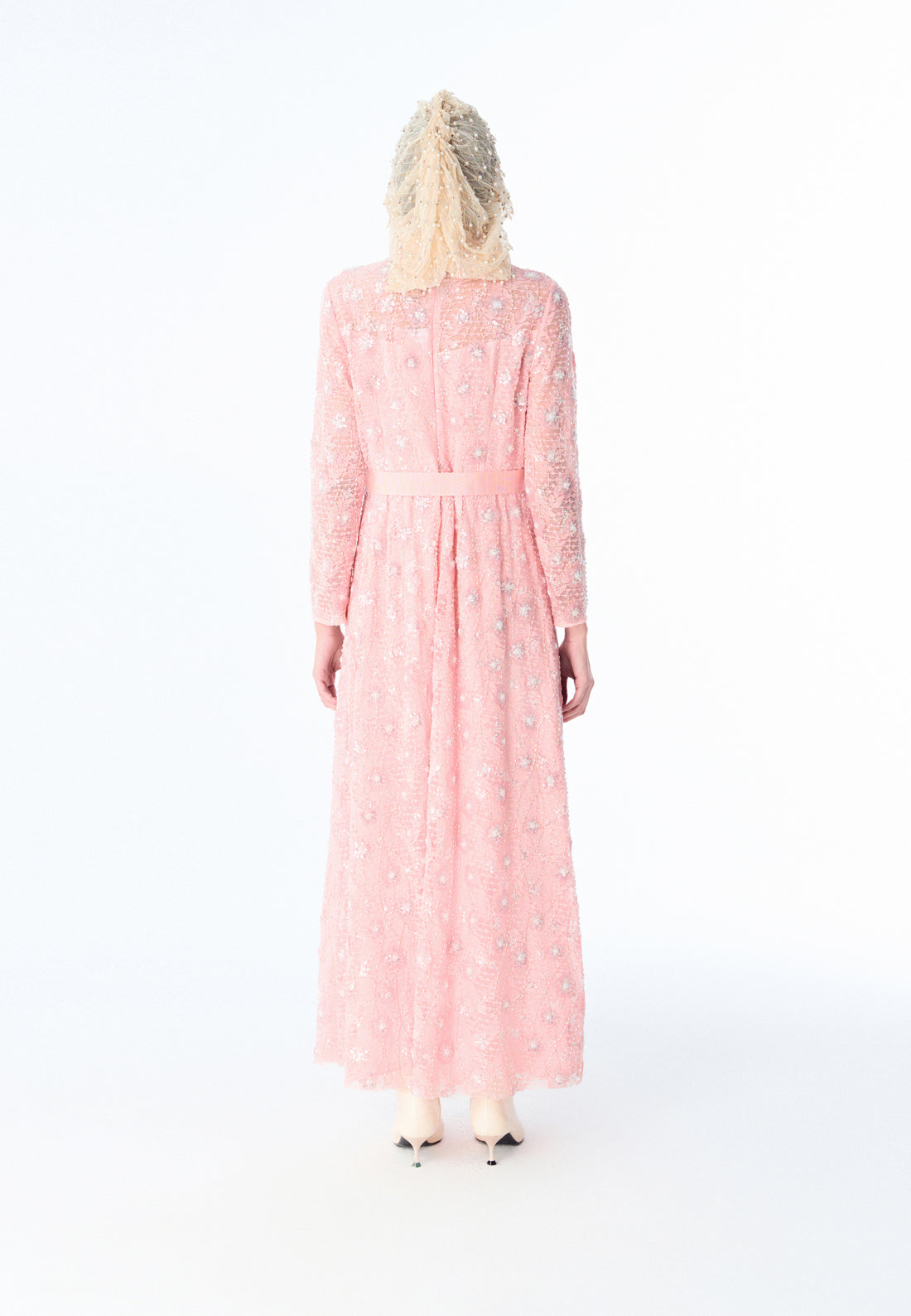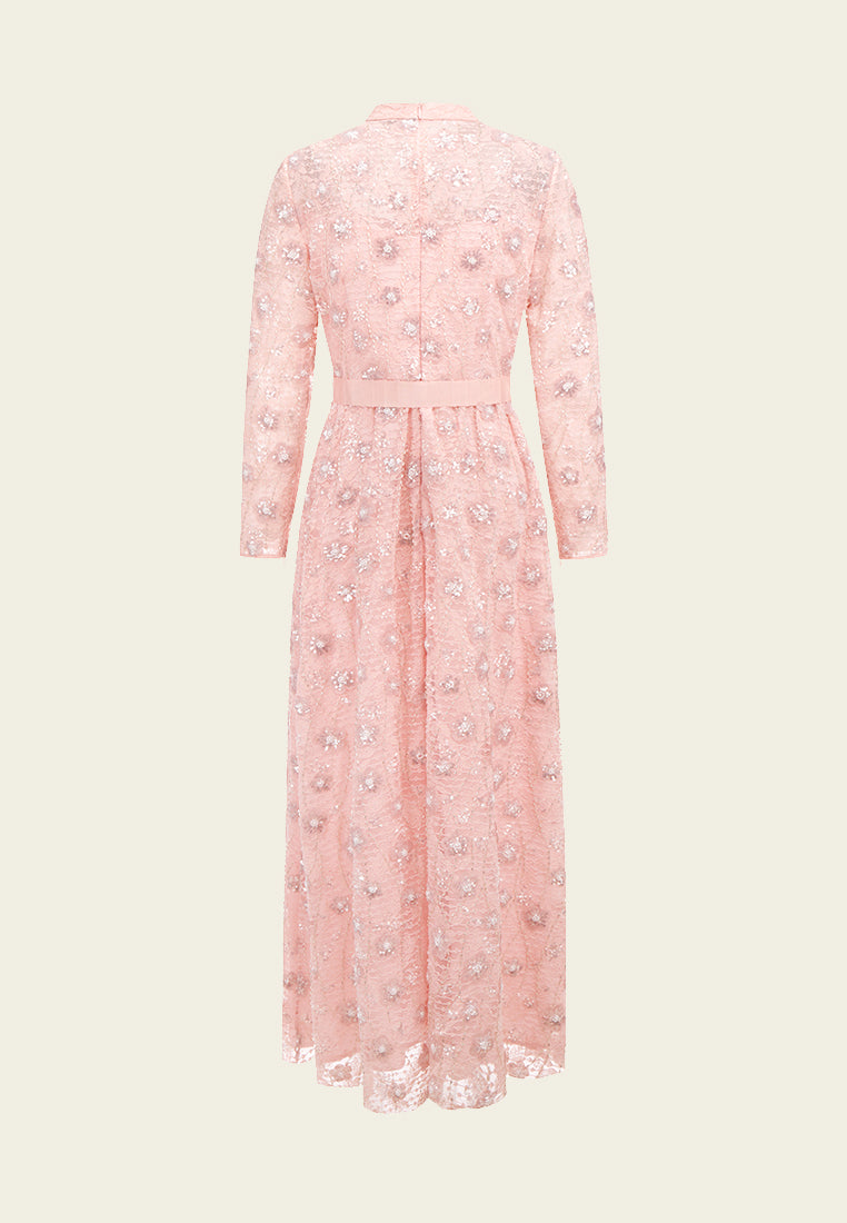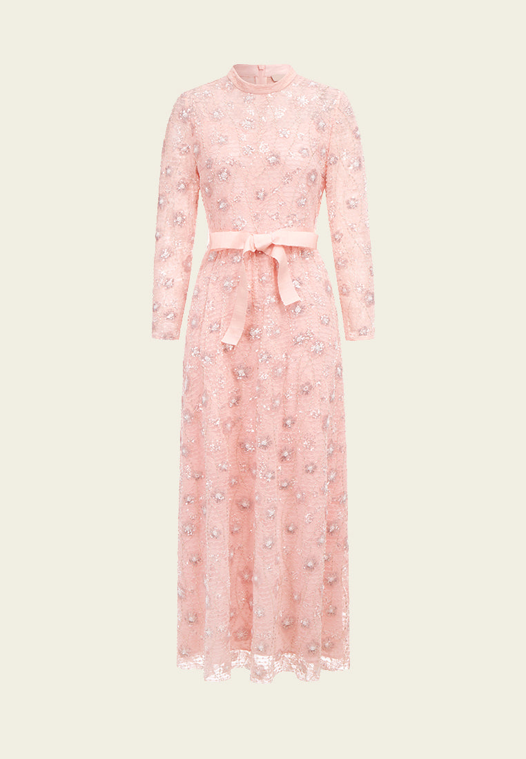 Pink Embroidered Lace Long-sleeved Dinner Dress