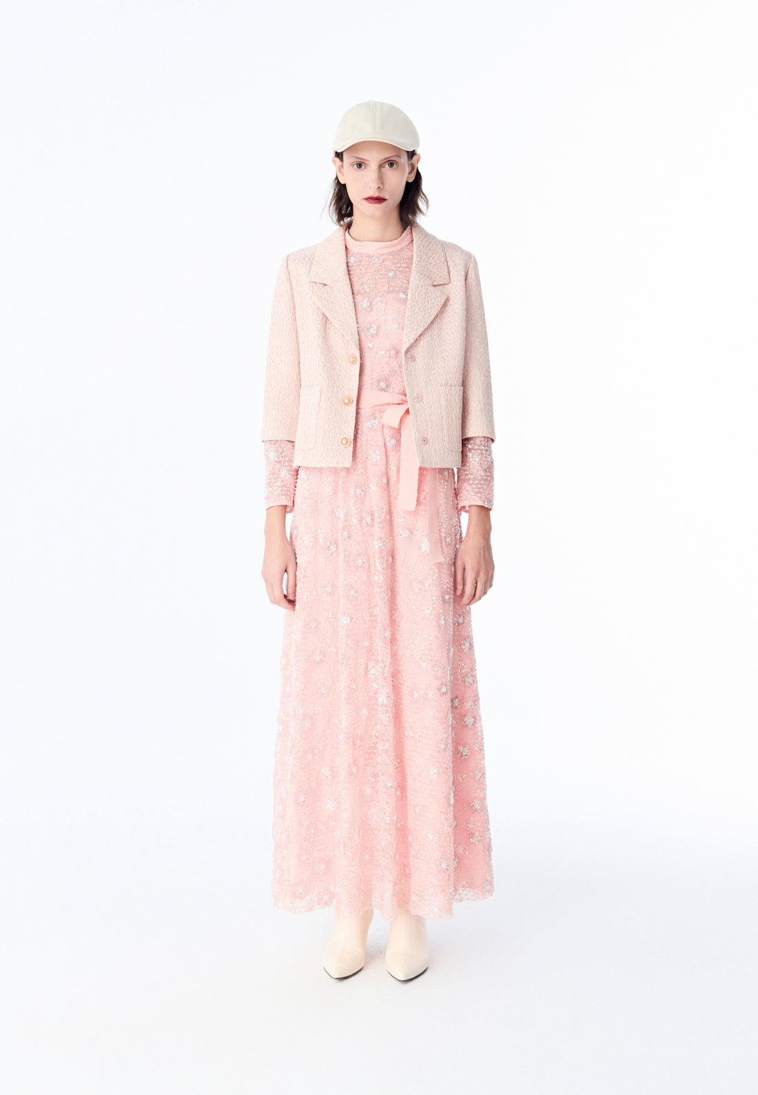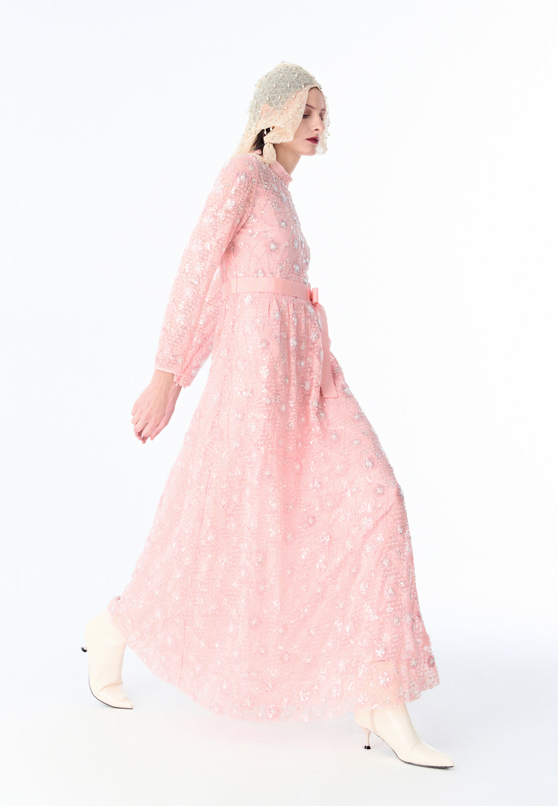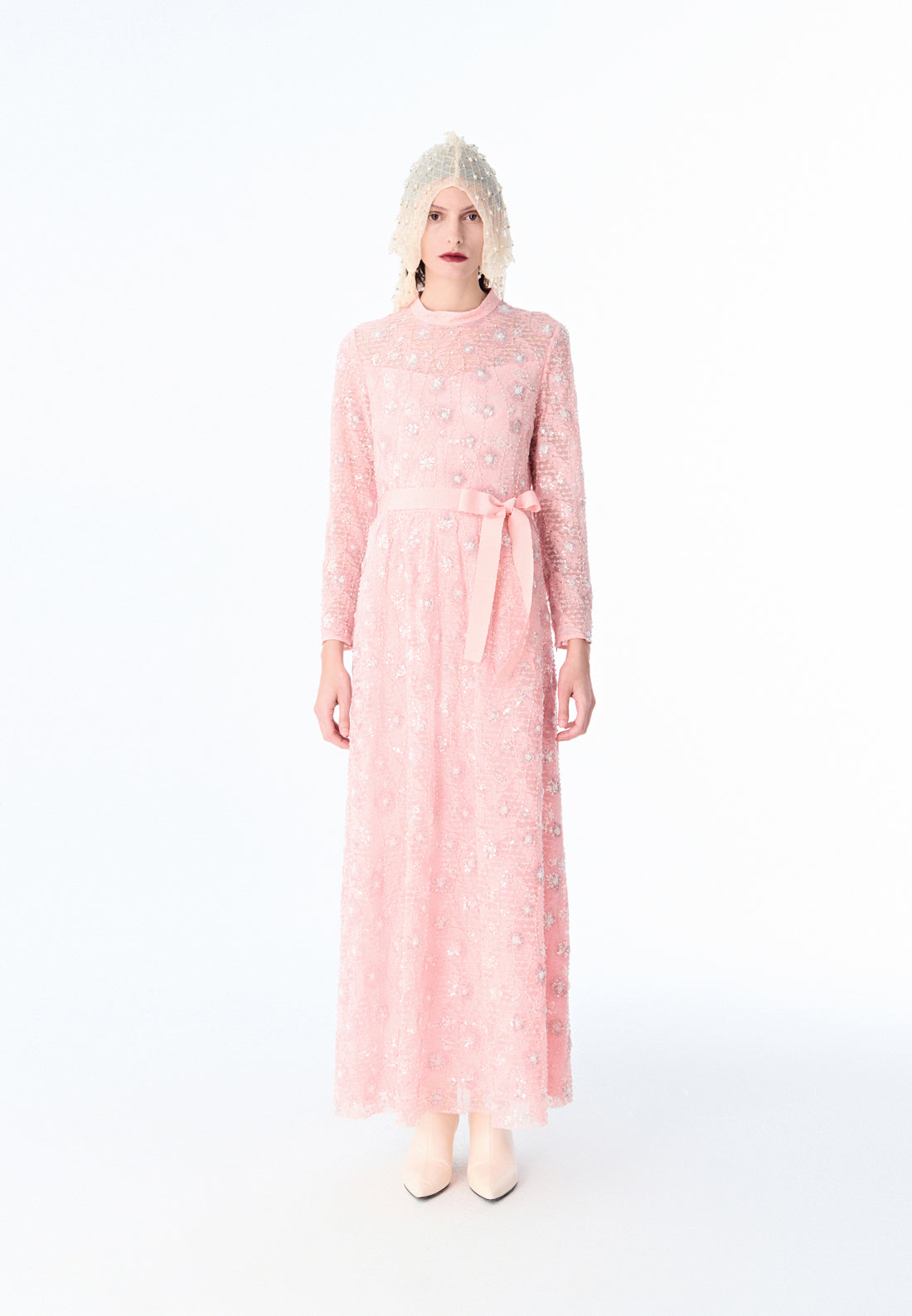 Pink Embroidered Lace Long-sleeved Dinner Dress