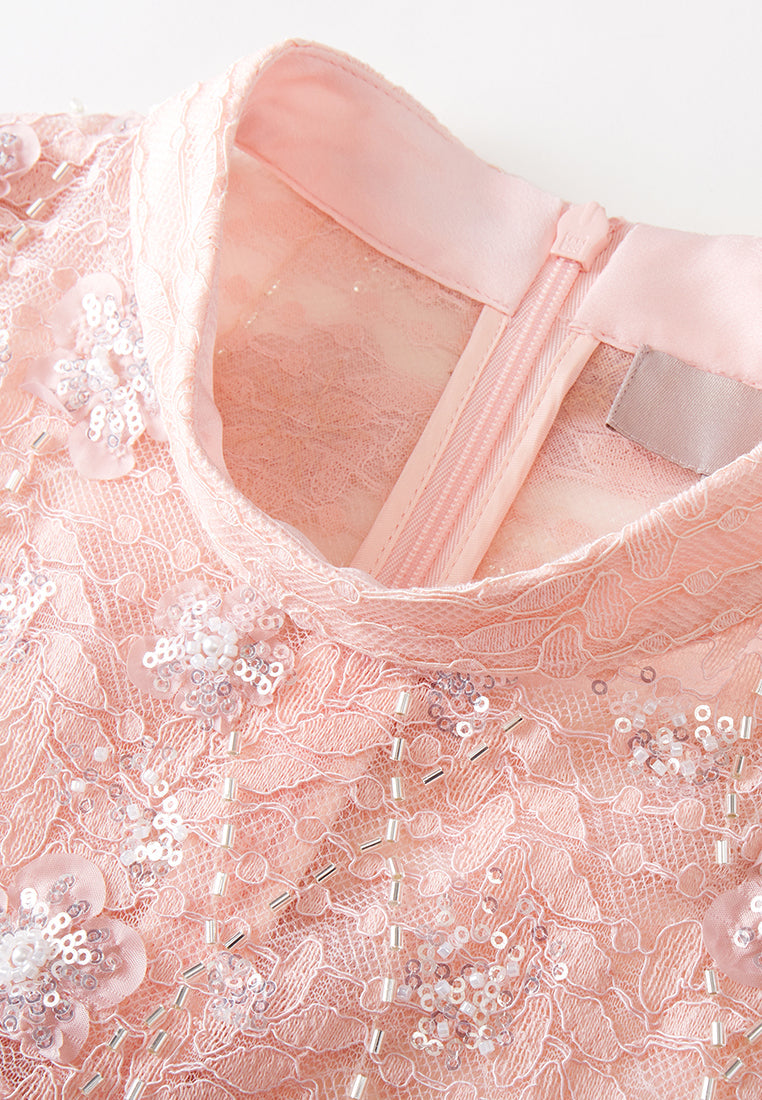A refined dress is opulent in a variety of details. Lace in floral patterns delightfully embellished with sequins and beads. The light pink colorway creates a decent image and evokes your feminine charisma. An elegant item you don't want to miss.