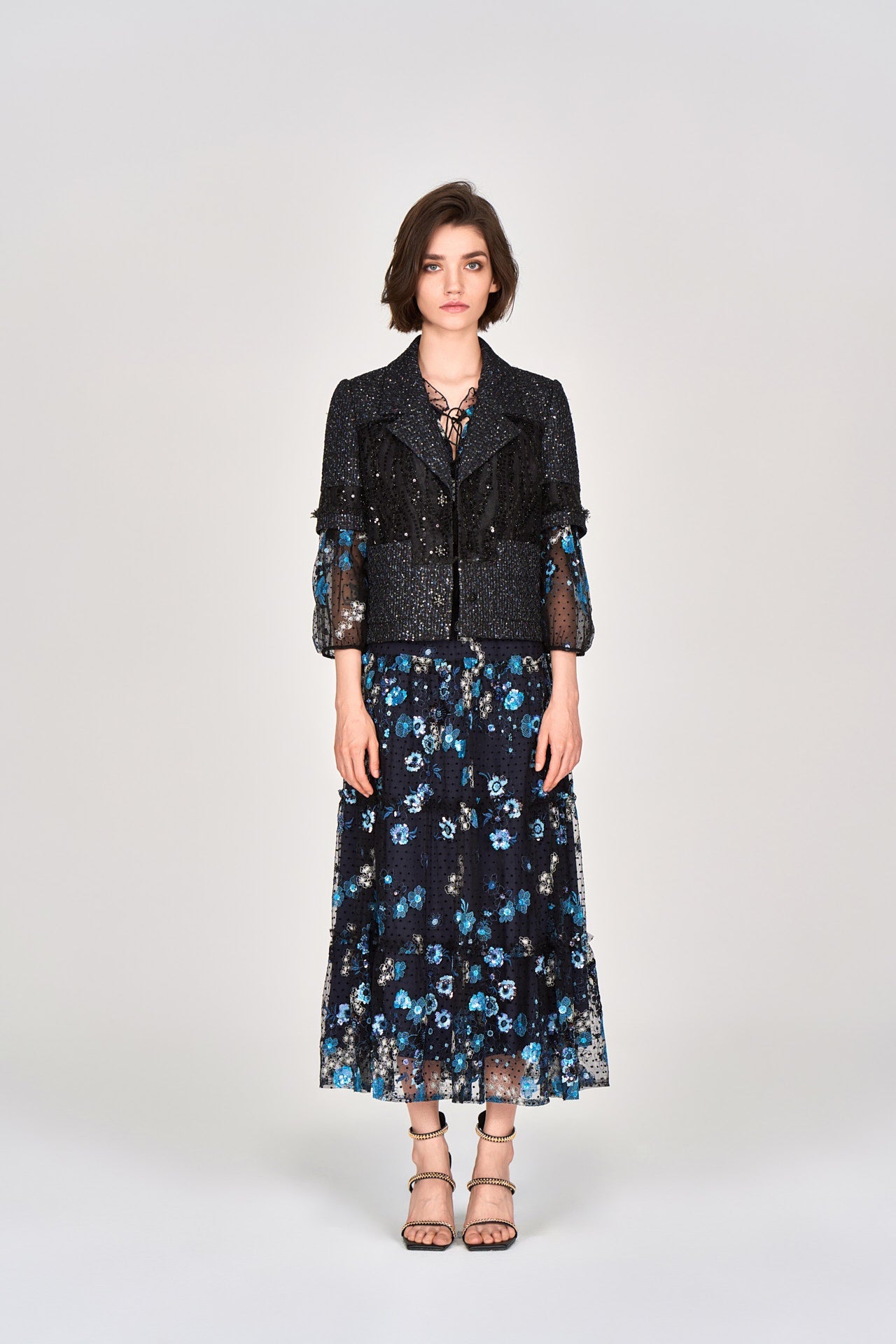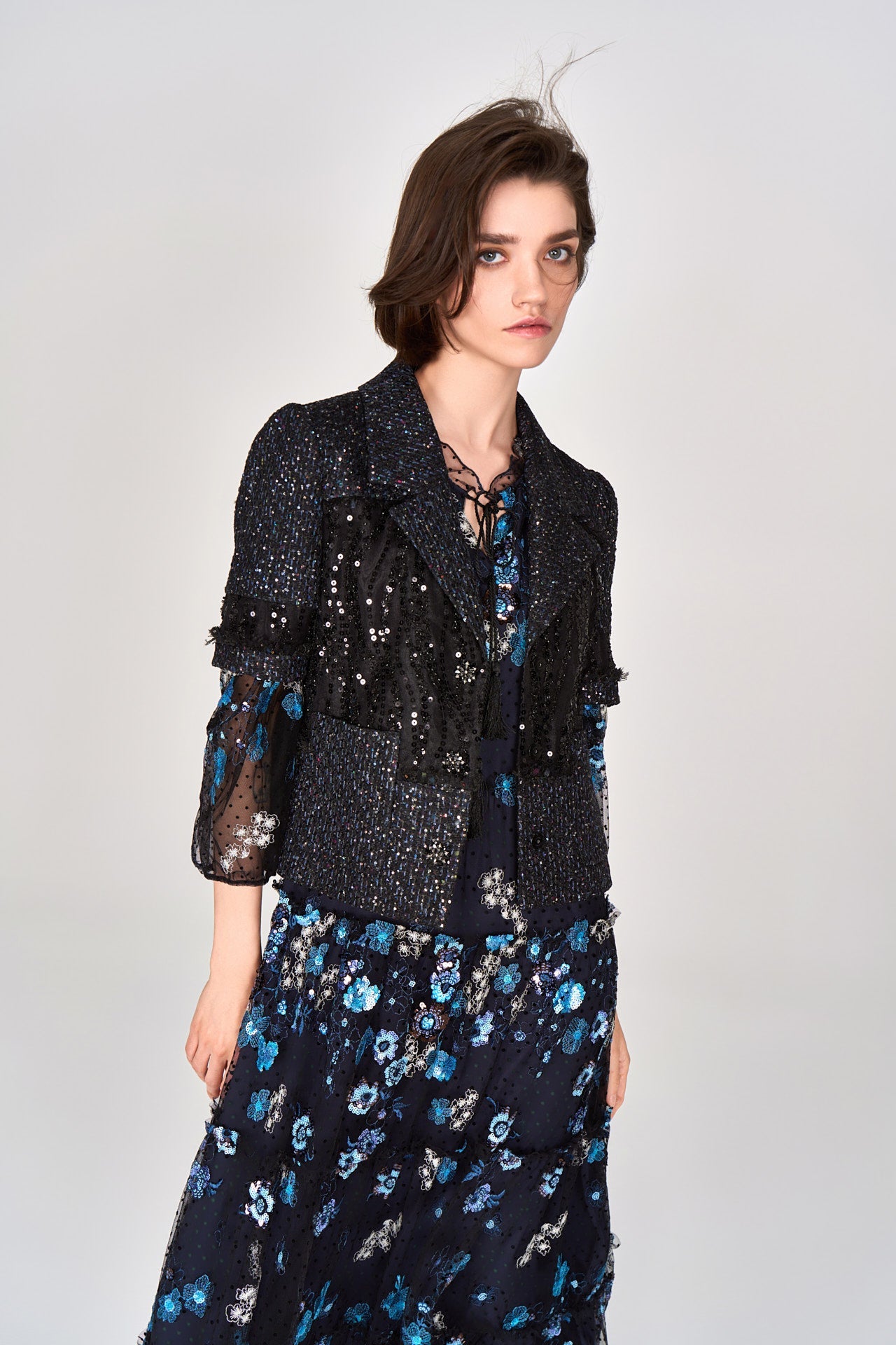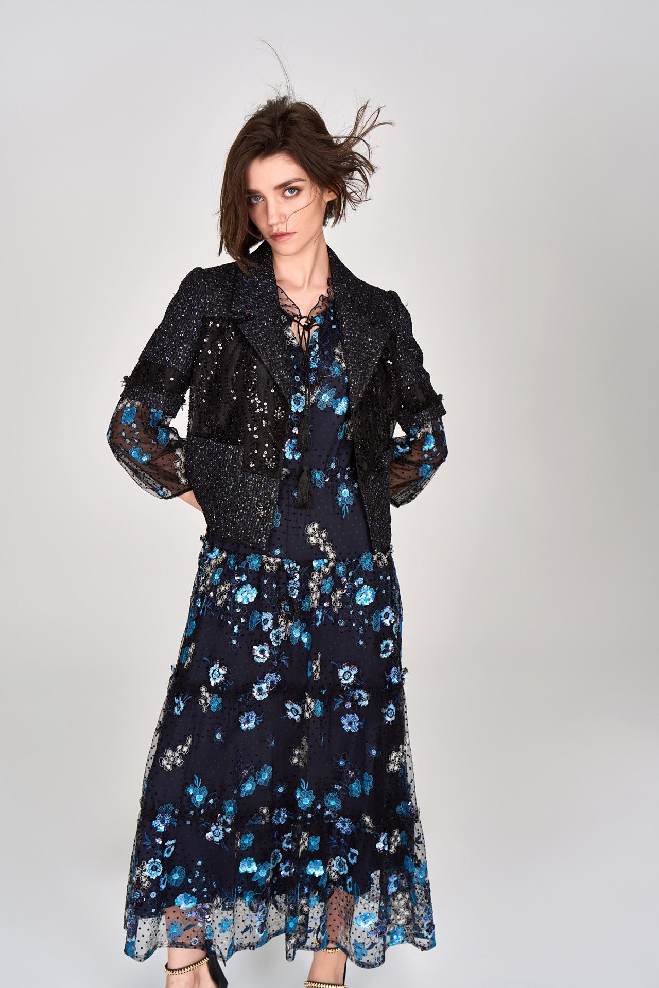 A decent ready-to-go item for nighttime social occasions. Light blue and silver floral embroidery and sequins on black mesh, gracefully encrust on dark blue dress. Reminiscent of a night time garden. Arm and shoulder skin lurks through black mesh.