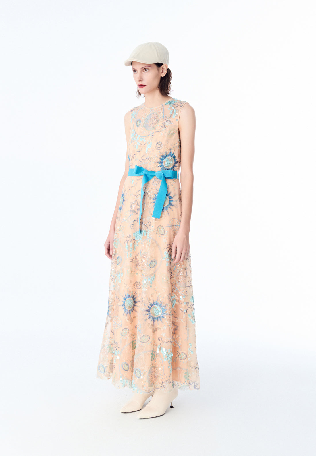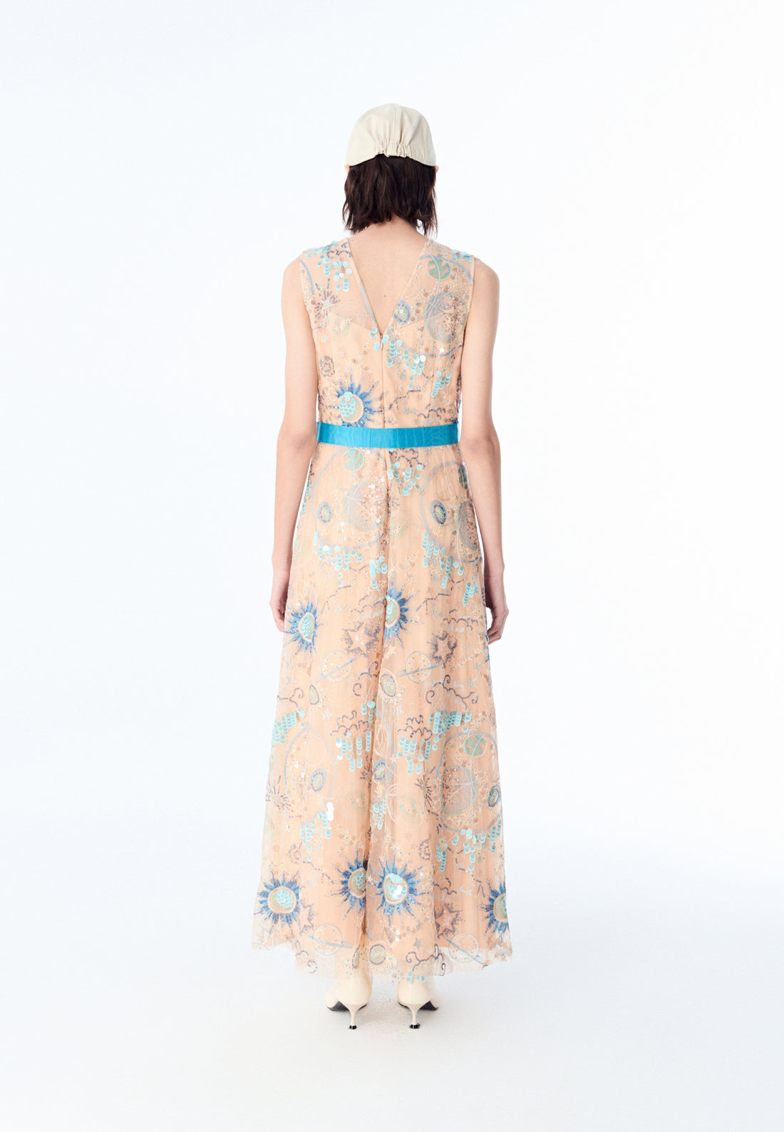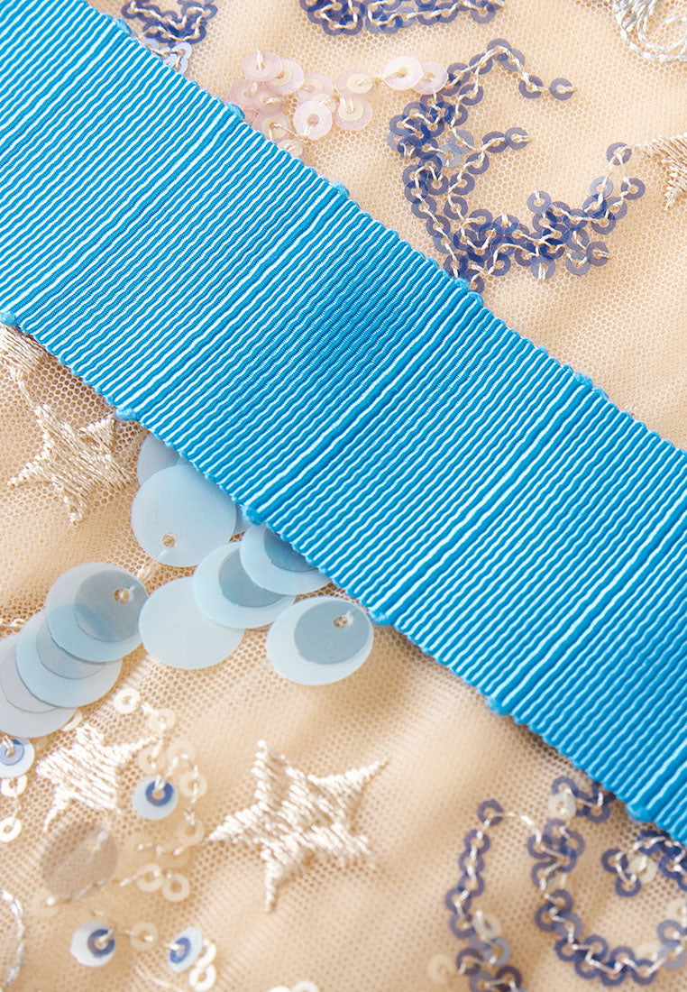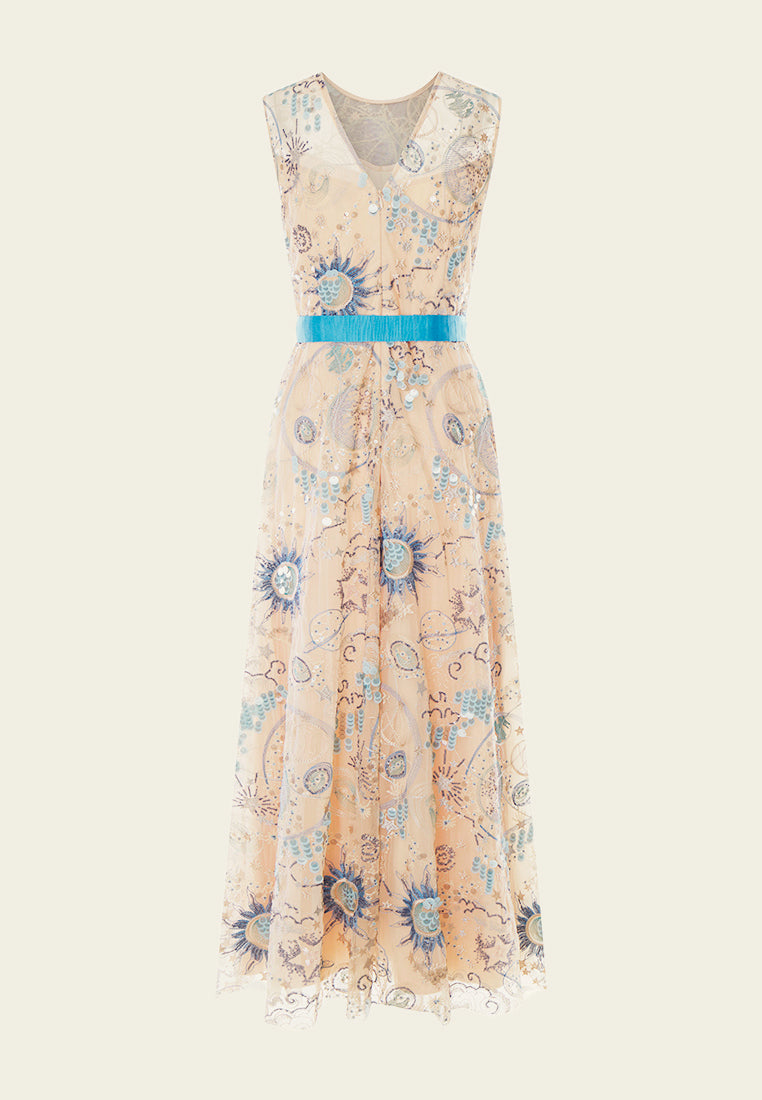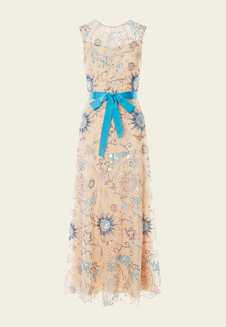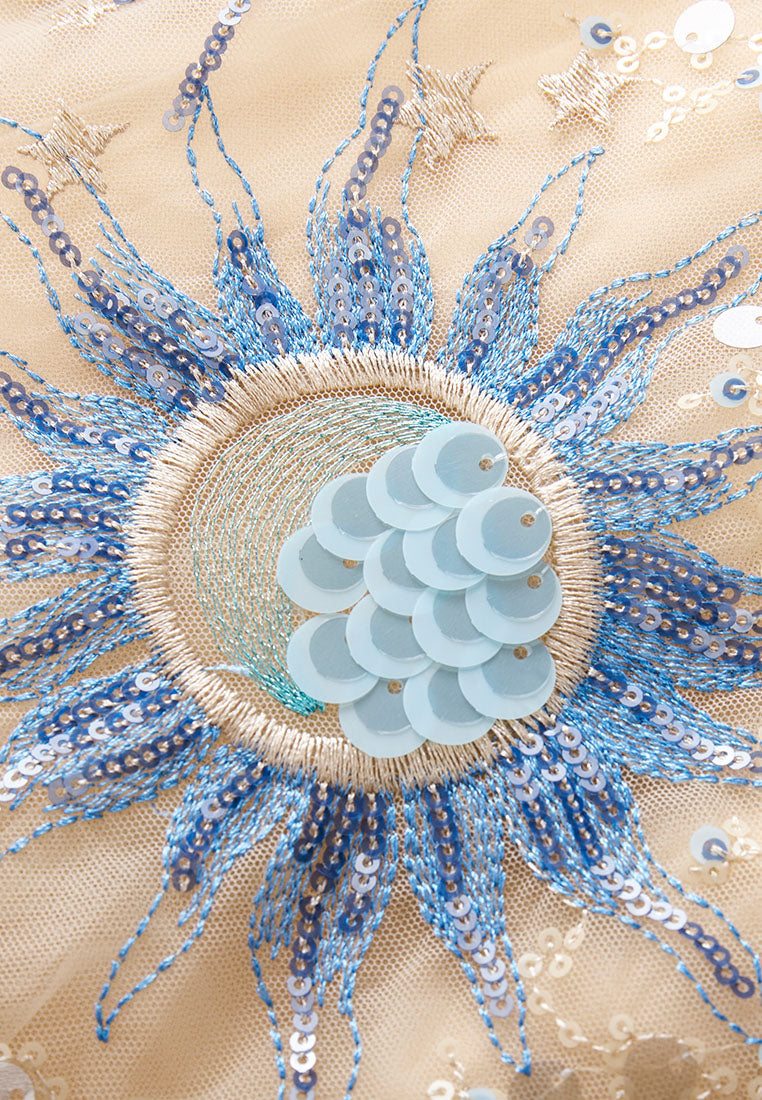 An ethereal dress that will surely make heads turn at nighttime parties and gatherings. The beige mesh dress delightfully harmonized with blue tone sequins and embroidery embellishment. Intricate patterns of the sun, stars, and planets are reminiscent of tarot and the universe.