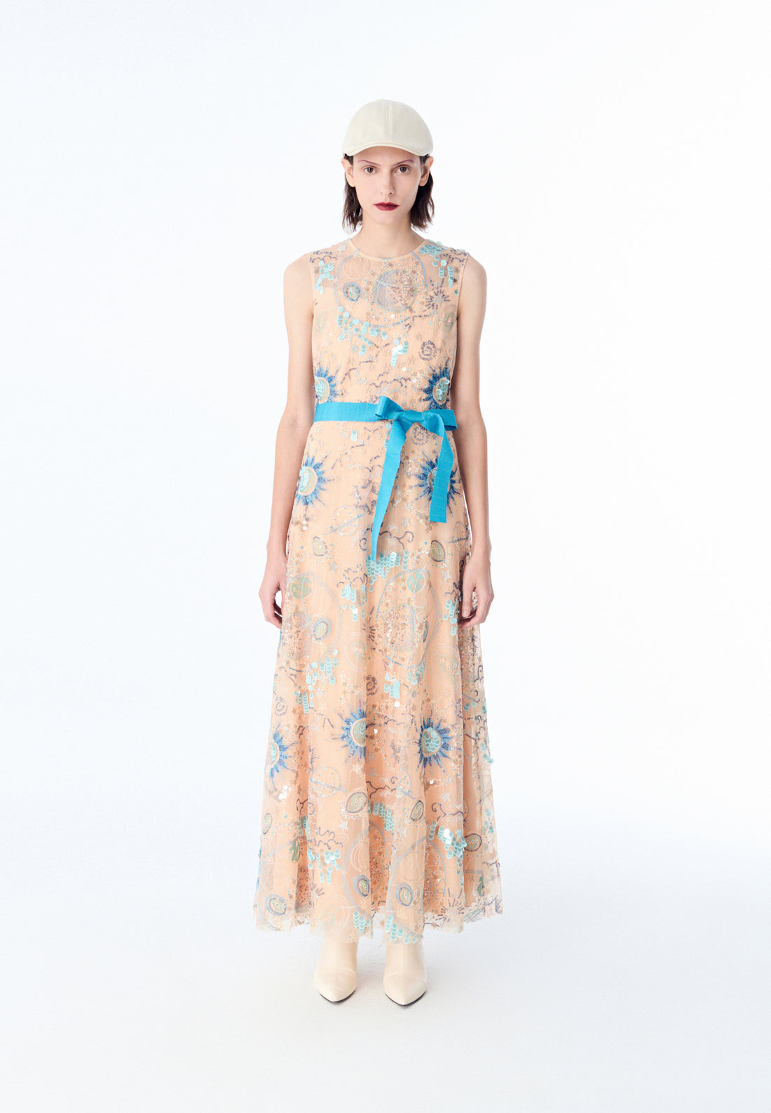 Beige Embroidered Sleeveless with Blue Ribbon Dress