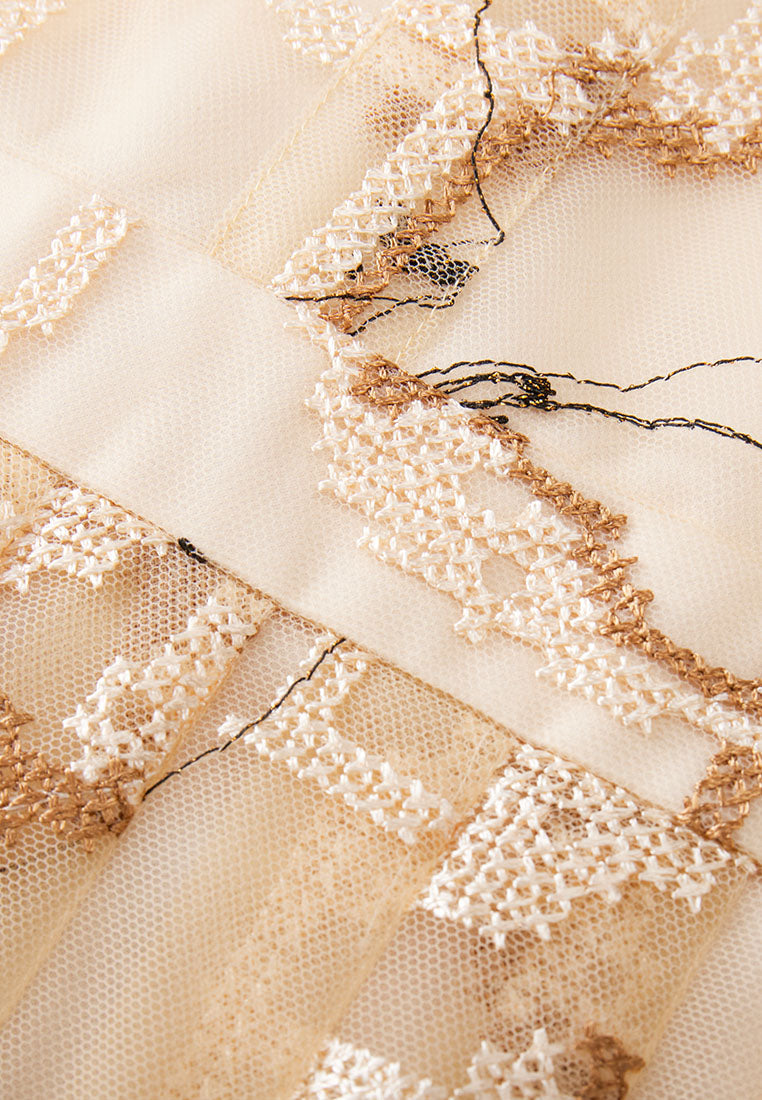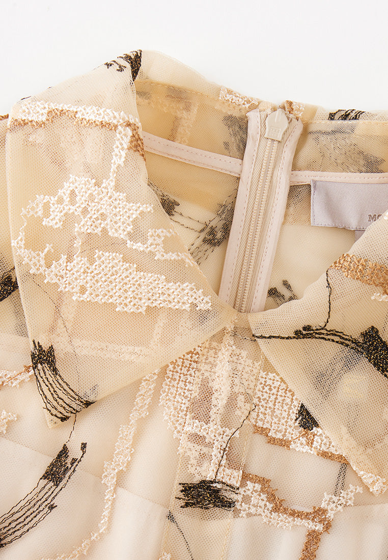 Elegant, understated, and decent is the best description of this item. Beige mesh encrusted with abstract pattern cross-stitch, finish up with black lurex. Skin lurks through long sleeves, and evokes understated sexiness. Stand collar. A delightfully elegant piece you do not want to miss.