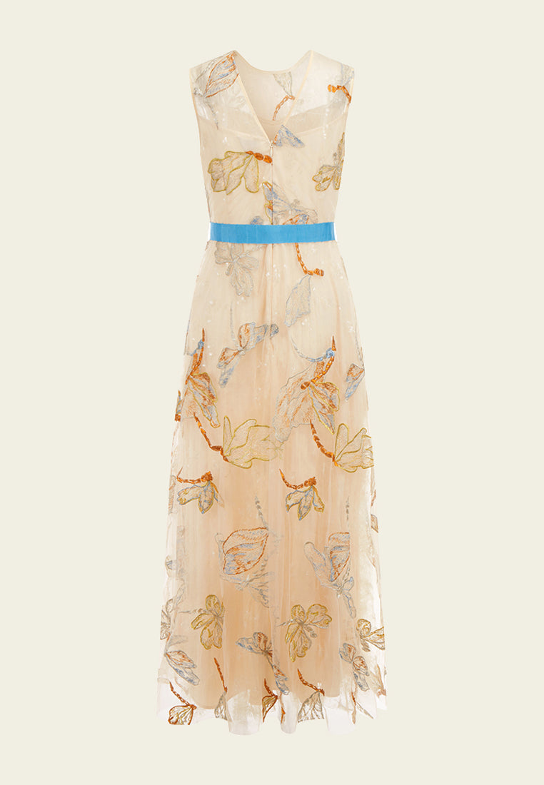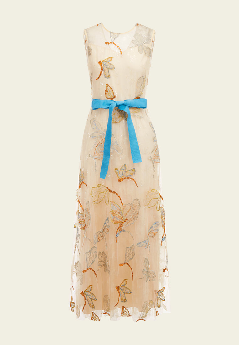 Beige Floral Sleeveless with Blue Ribbon Dress