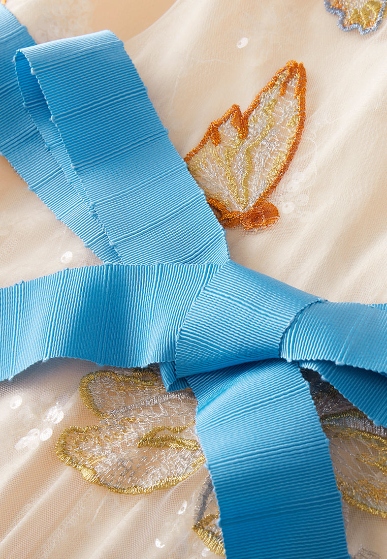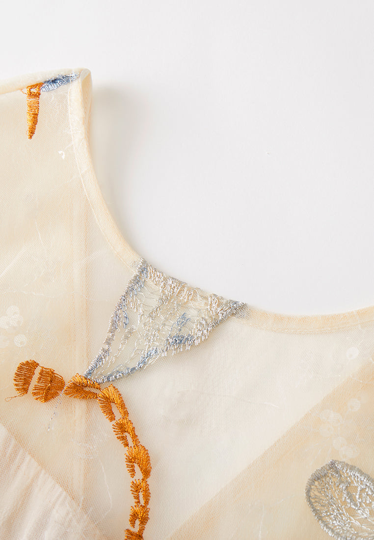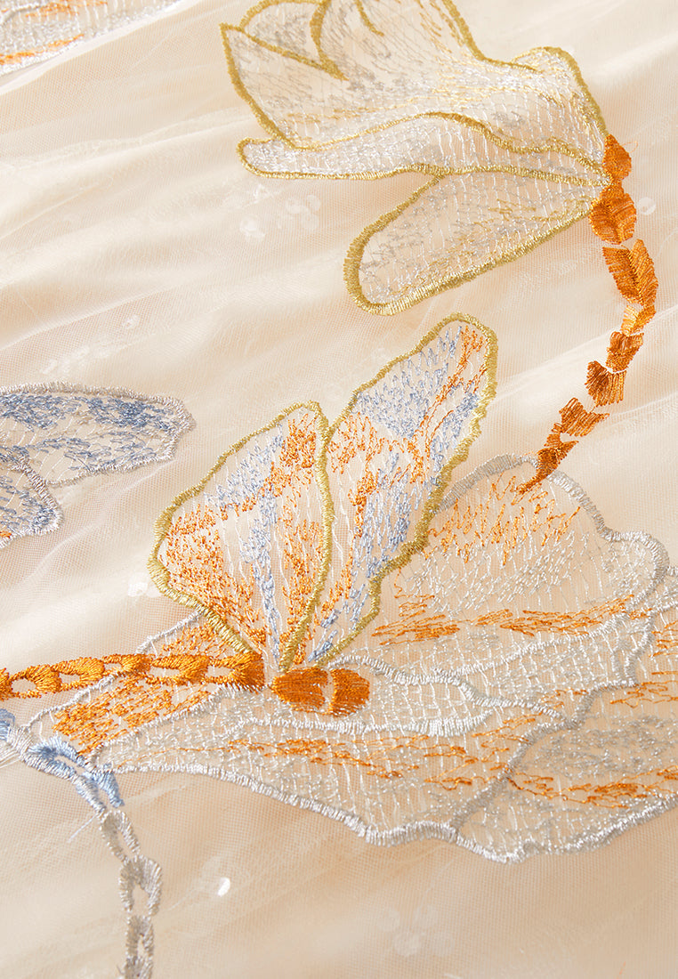 This item iterates a spring morning, embellished with dragonflies roam over the sky. Beige and light blue colorway makes a delightful contrast. Gold and silver threads delightfully iterate the scene, harmonizes with the dress. The refined outcome reminiscent of royal princess wear in real life.