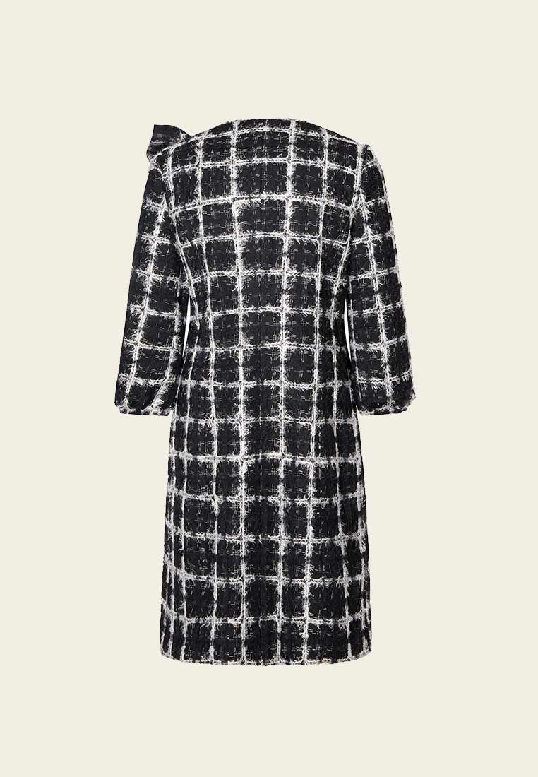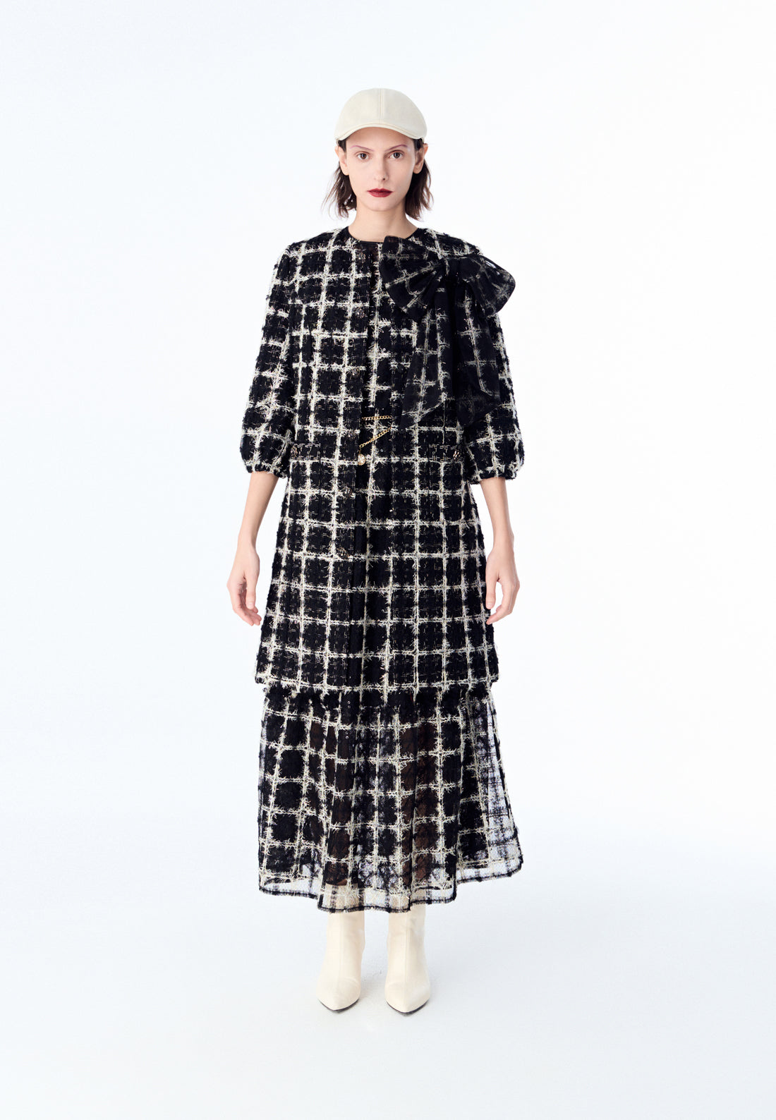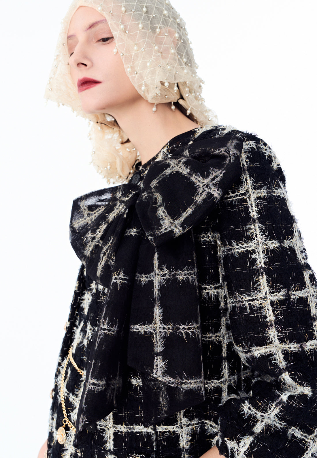 Unique fabric intricately woven with mesh, tweed and lurex. Contrasting black and white plaid opulent in texture. The item boasts a bow embellishment at the upper left bust. Finish up with delicate floral shaped buttons, A refined ready-to-go item for commercial occasions, also dignified occasions applicable.