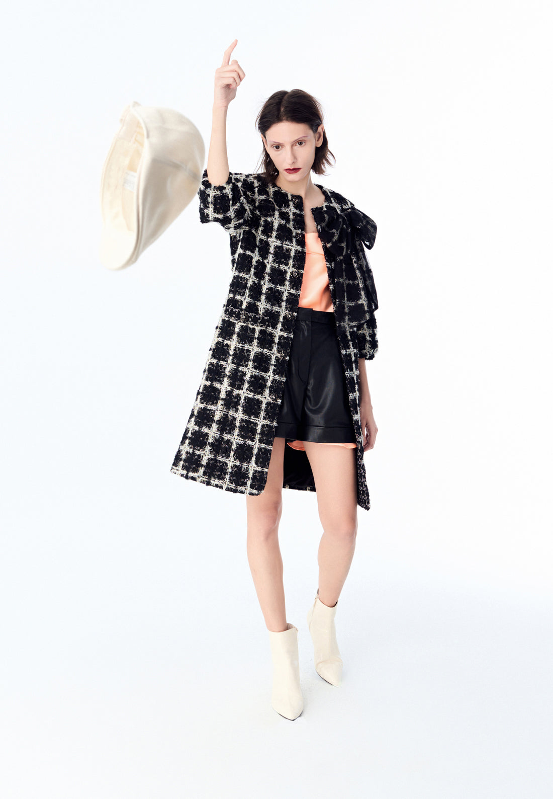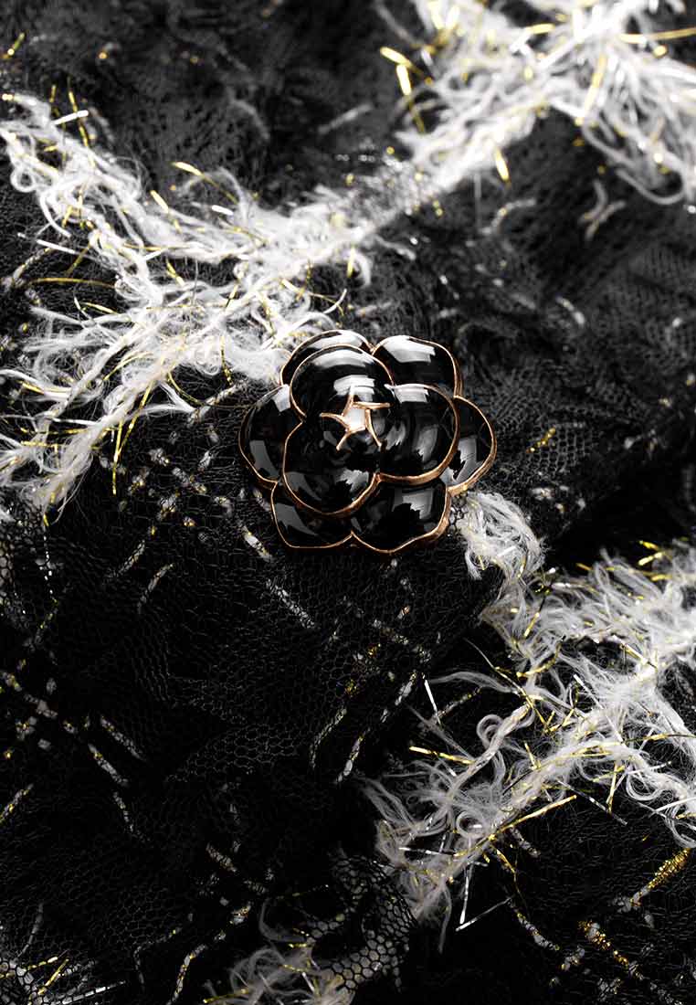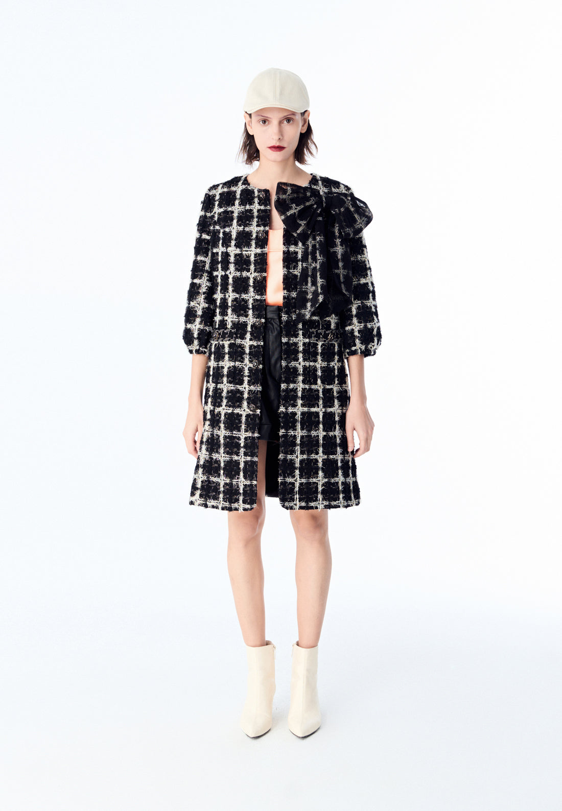 Unique fabric intricately woven with mesh, tweed and lurex. Contrasting black and white plaid opulent in texture. The item boasts a bow embellishment at the upper left bust. Finish up with delicate floral shaped buttons, A refined ready-to-go item for commercial occasions, also dignified occasions applicable.