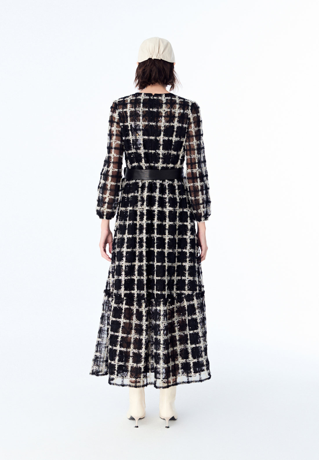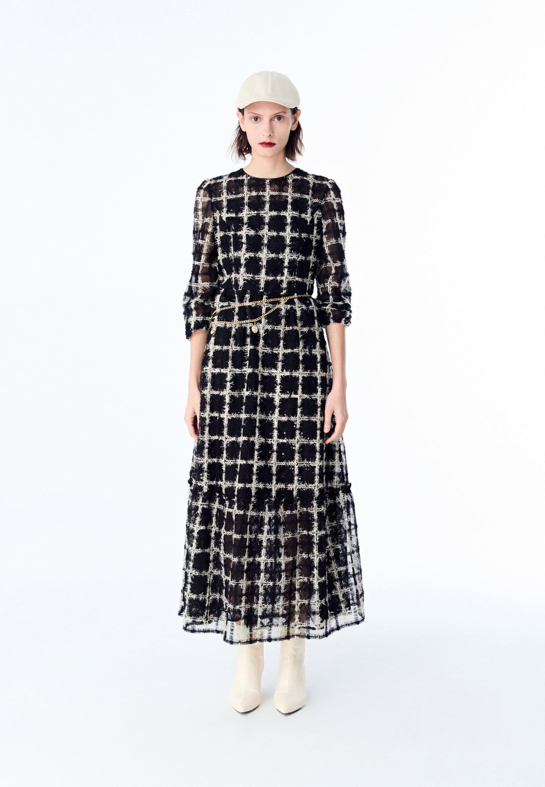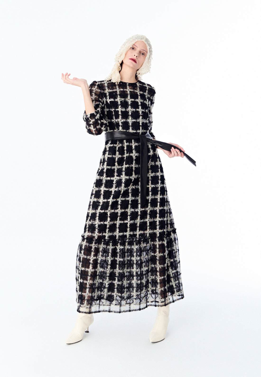 Unique fabric intricately woven with mesh, tweed and lurex. Contrasting black and white plaid opulent in texture. The item boasts translucent mesh sleeves. Lurking arm skin, evokes understated sexyness. waistline accentuating cutting and fishtail bottom boasts your body shape. A refined ready-to-go item for commercial occasions, also dignified occasions applicable.