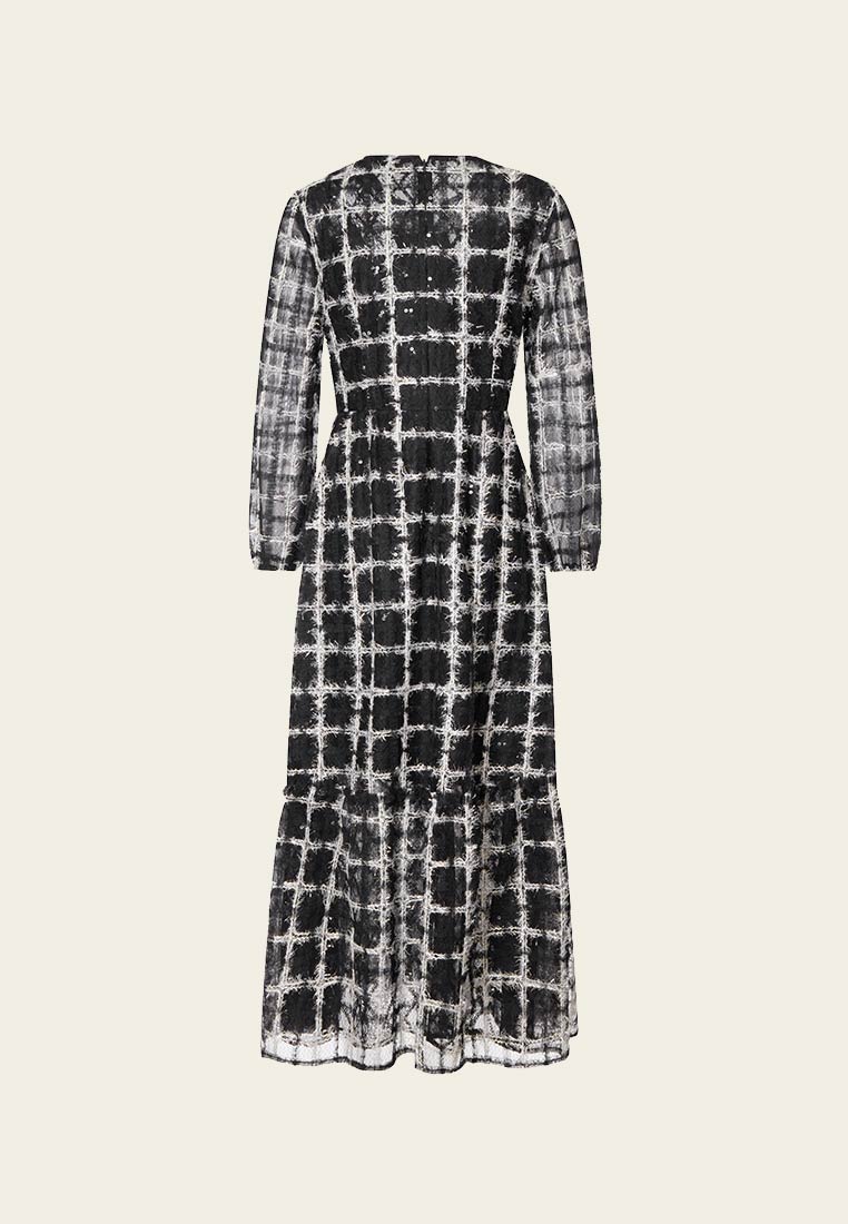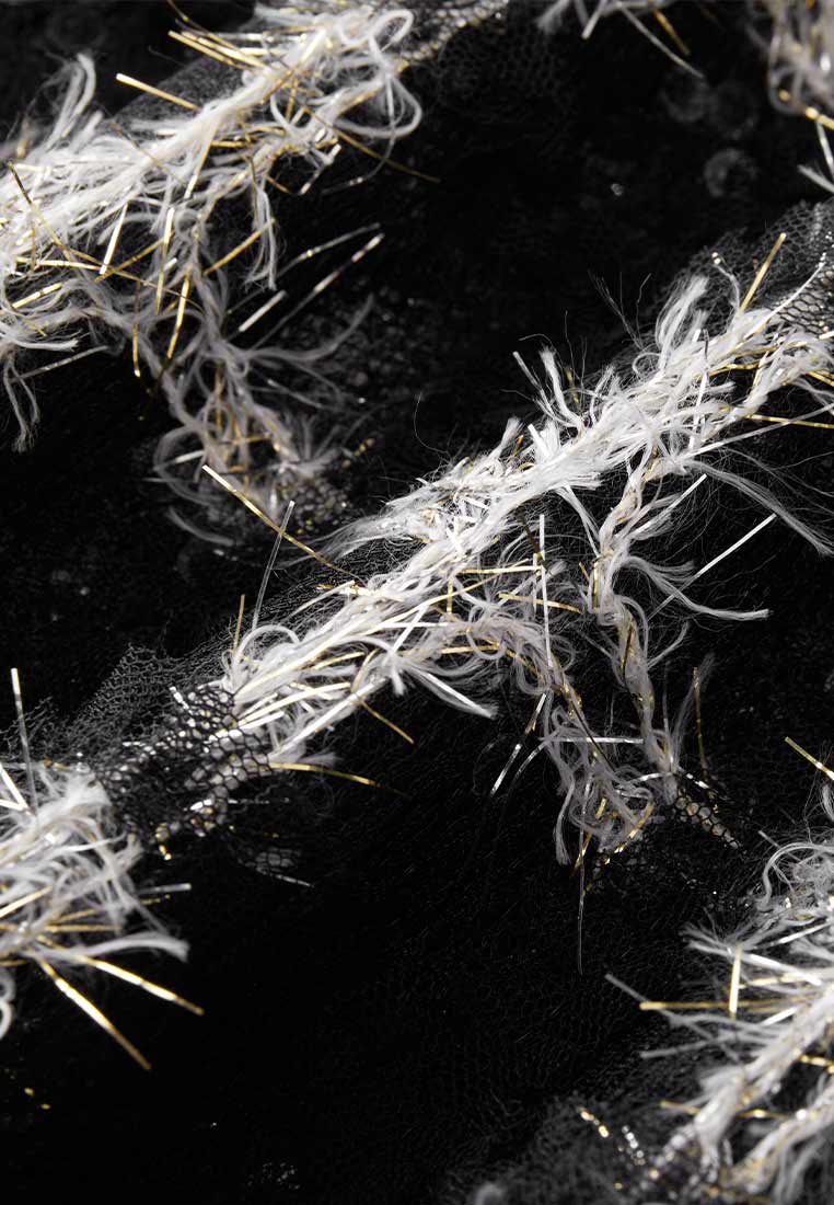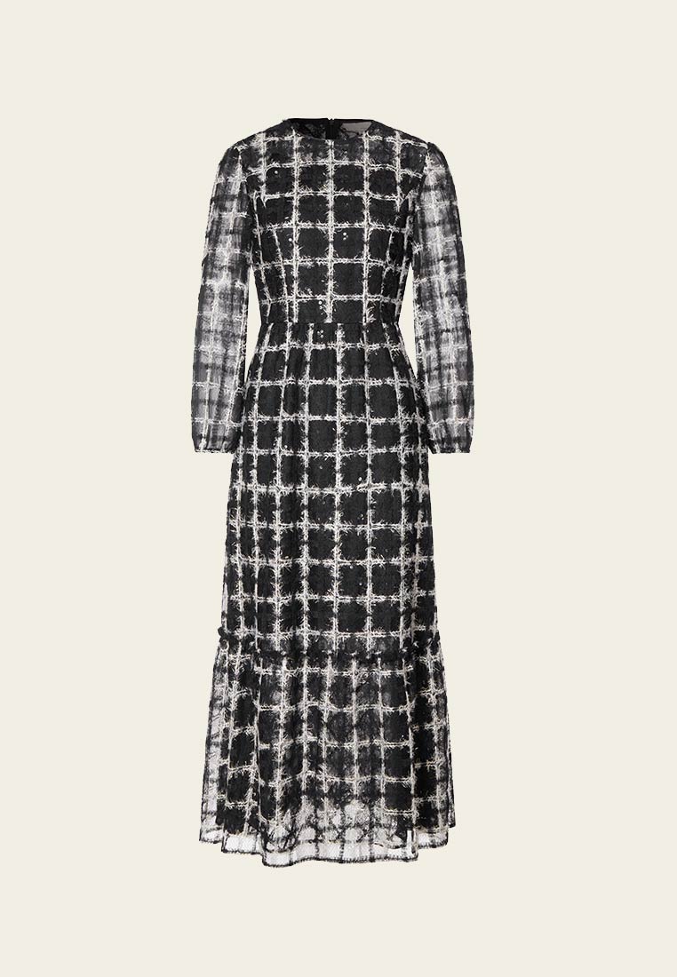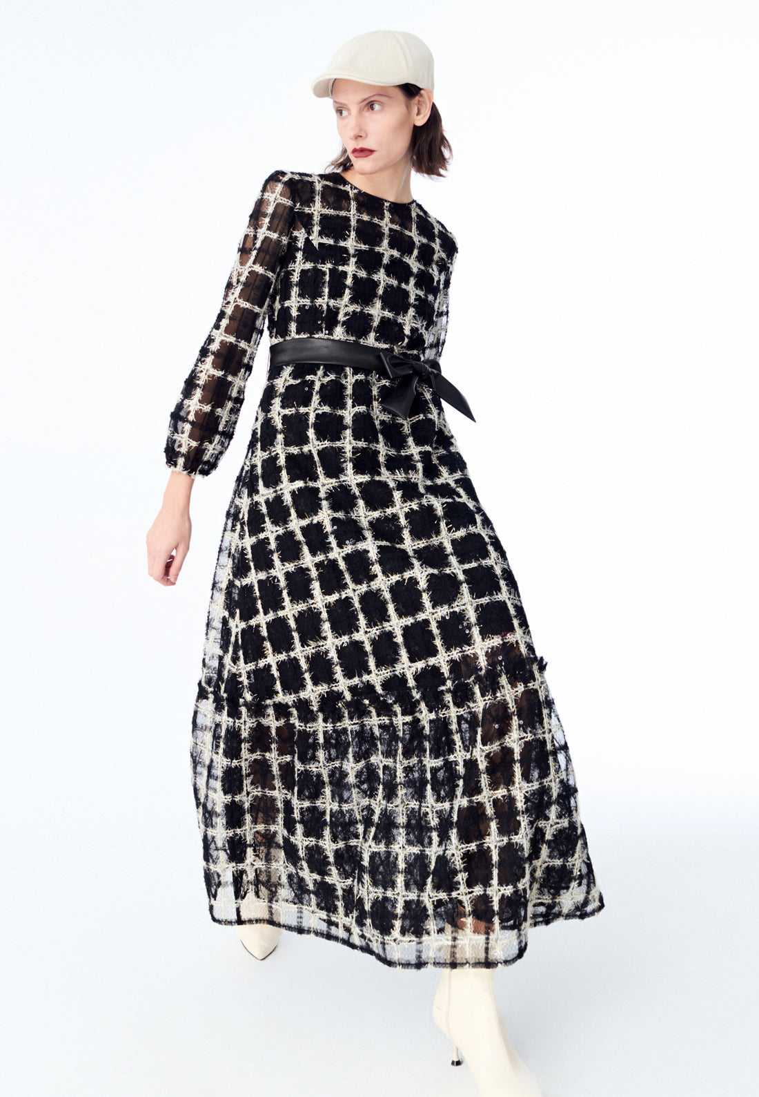 Unique fabric intricately woven with mesh, tweed and lurex. Contrasting black and white plaid opulent in texture. The item boasts translucent mesh sleeves. Lurking arm skin, evokes understated sexyness. waistline accentuating cutting and fishtail bottom boasts your body shape. A refined ready-to-go item for commercial occasions, also dignified occasions applicable.