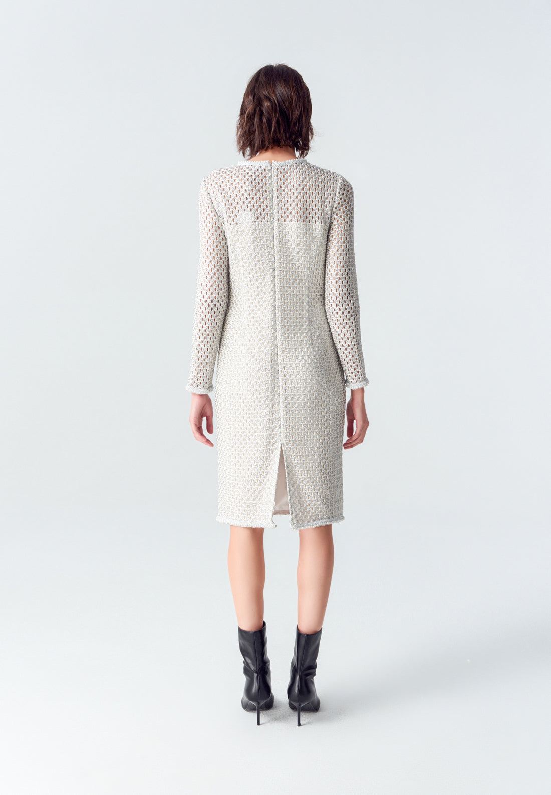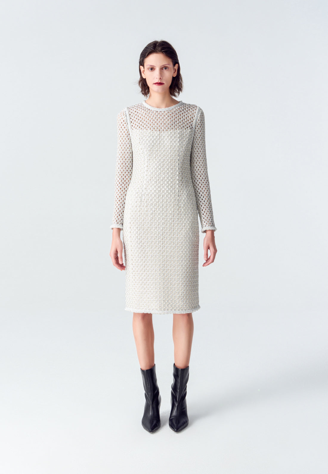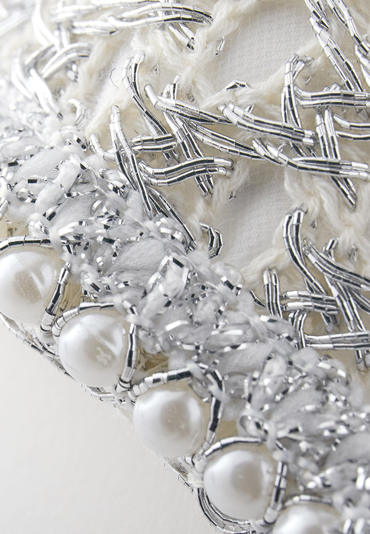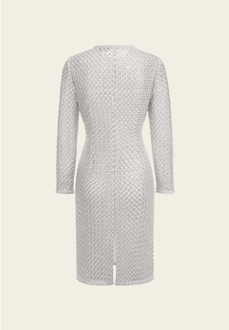 A piece that looks simple but overflow delicately. Encrusted with a layer of silver lace intricately formed with white threads, finish up with pearl and lurex embellished hems. Grand and luxurious. A midi dress for important events and gathering. The pearl and lurex details offer a timeless yet fashion-forward look, perfect for any special occasion.