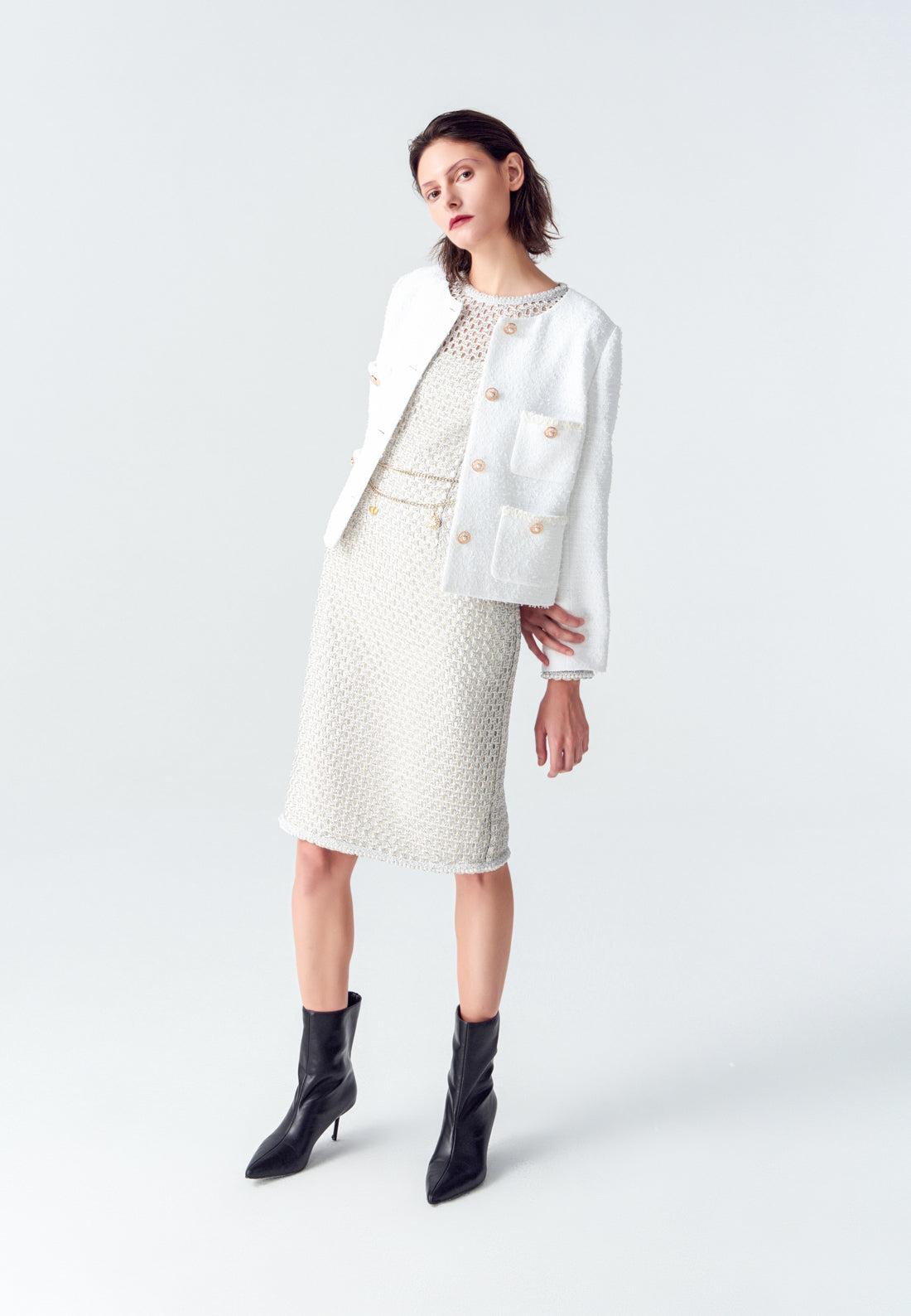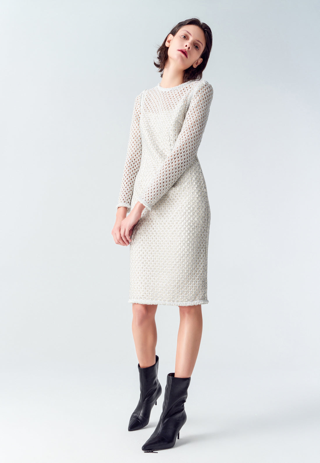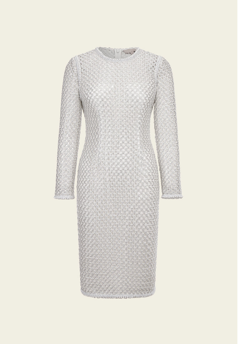 A piece that looks simple but overflow delicately. Encrusted with a layer of silver lace intricately formed with white threads, finish up with pearl and lurex embellished hems. Grand and luxurious. A midi dress for important events and gathering. The pearl and lurex details offer a timeless yet fashion-forward look, perfect for any special occasion.