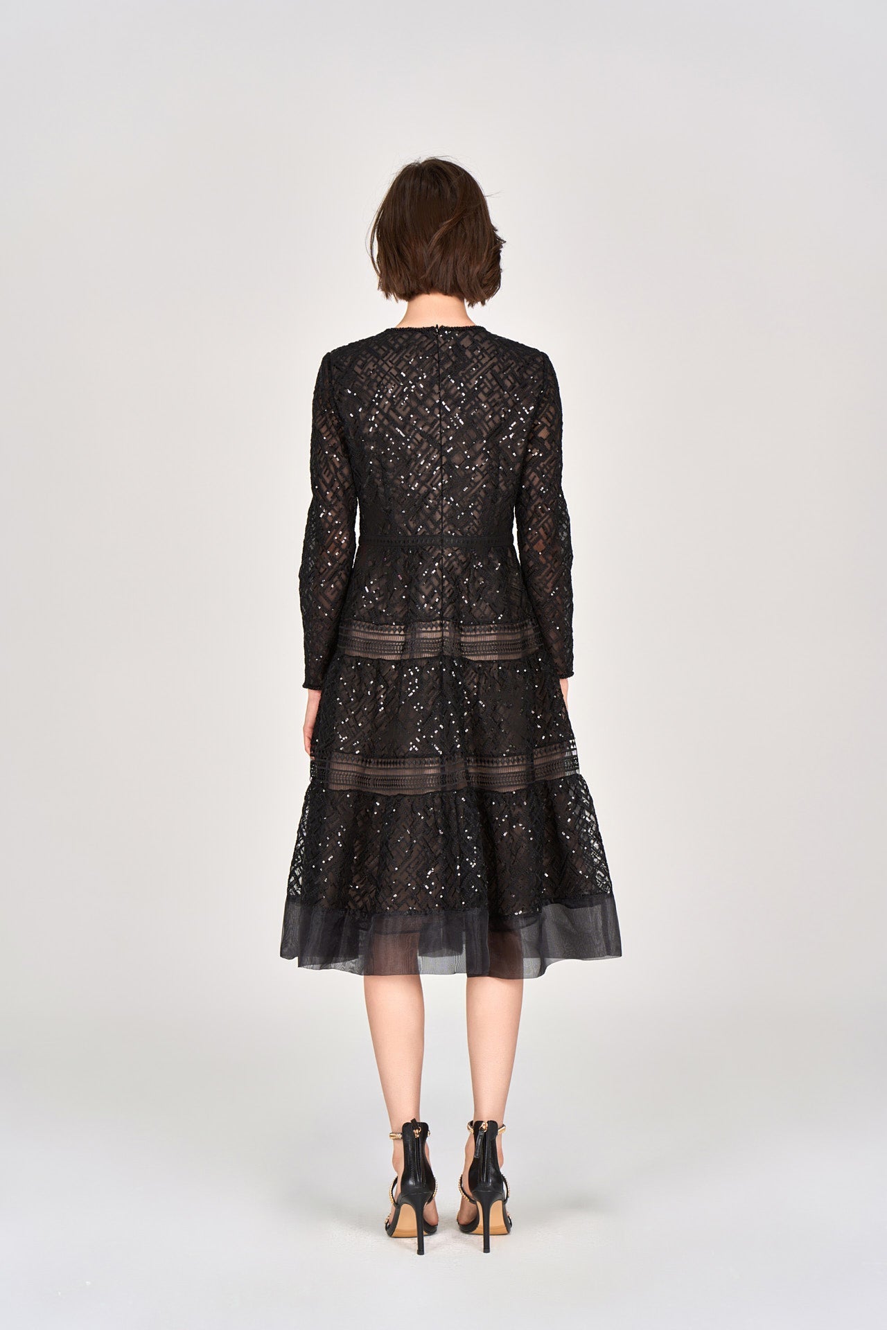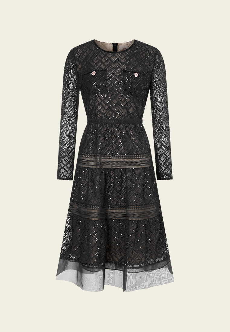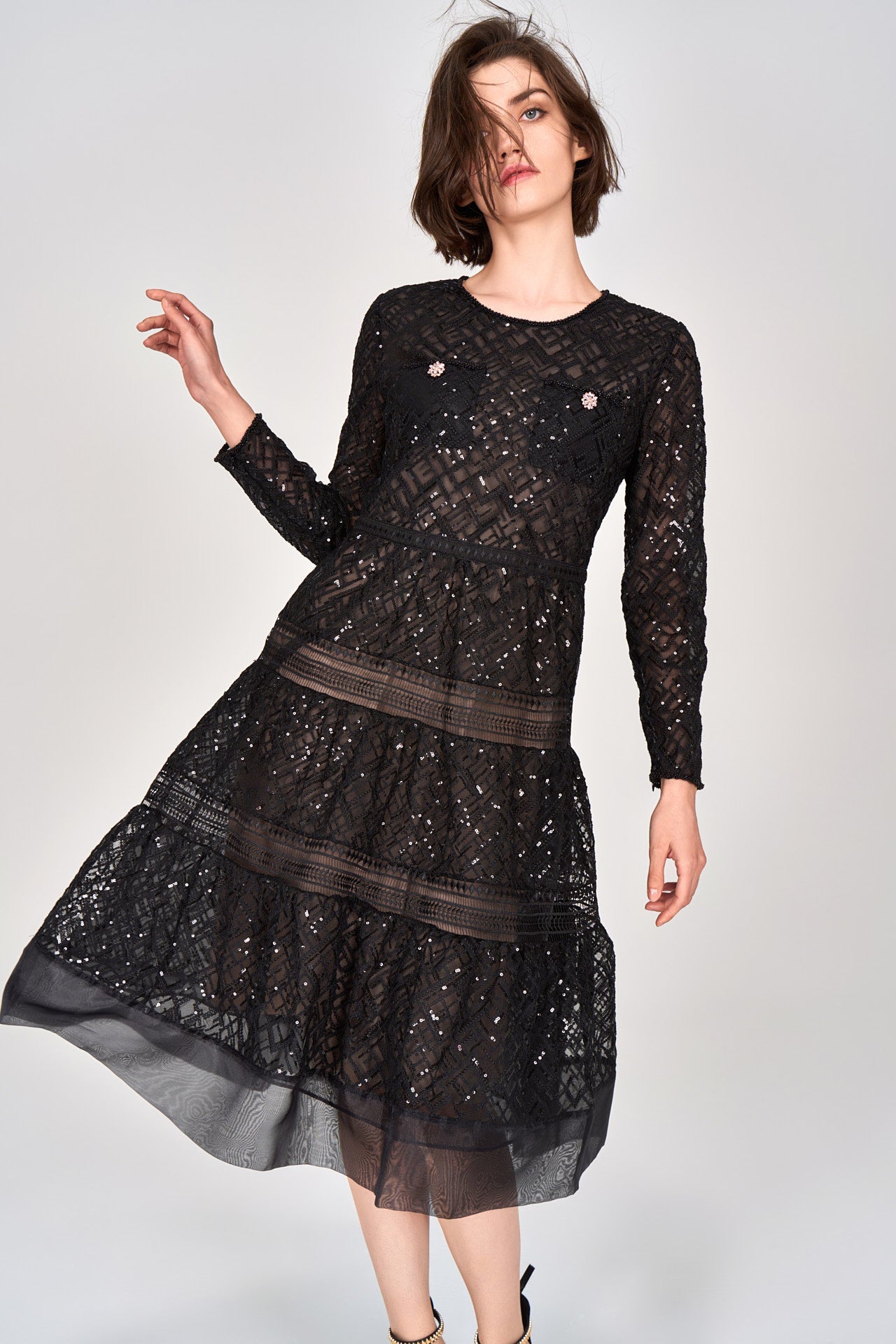 Be irresistibly charming in this luxe black dress, adorned with an opulent combination of intricate and vibrant sequin and embroidery designs. Aglow with gleaming adornments, dignified diagonal lines and delicate lace accents, this elegant midi-length confection is truly a sight to behold and will make you the focus of any night-time gathering.