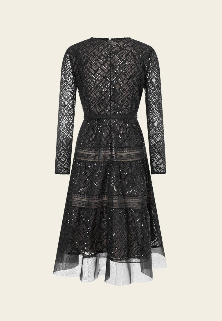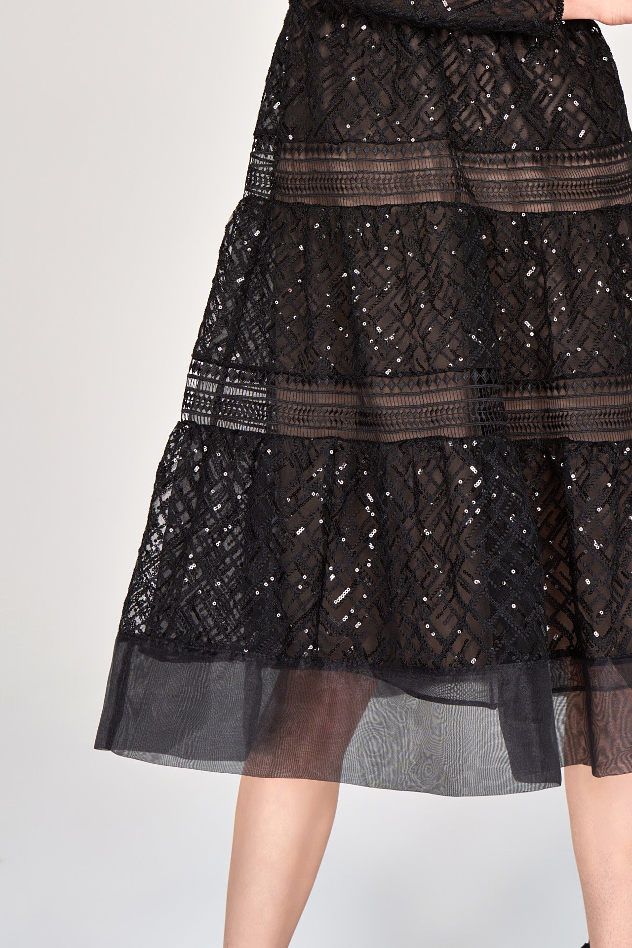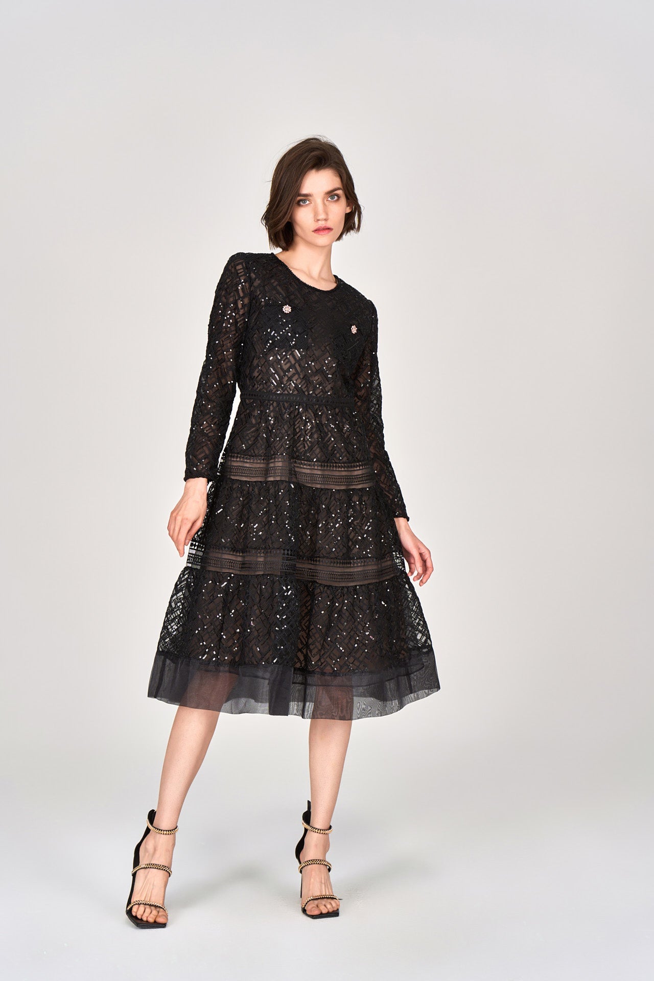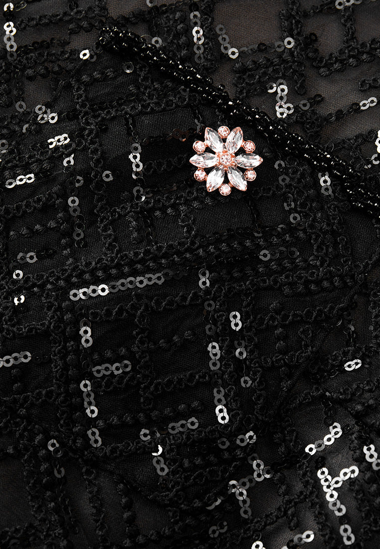 Be irresistibly charming in this luxe black dress, adorned with an opulent combination of intricate and vibrant sequin and embroidery designs. Aglow with gleaming adornments, dignified diagonal lines and delicate lace accents, this elegant midi-length confection is truly a sight to behold and will make you the focus of any night-time gathering.