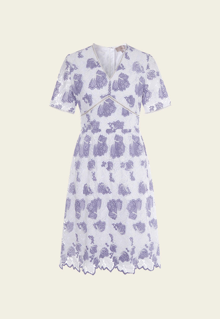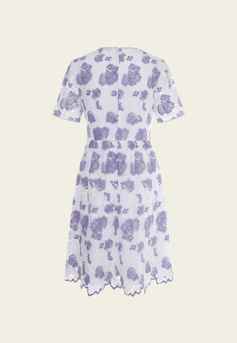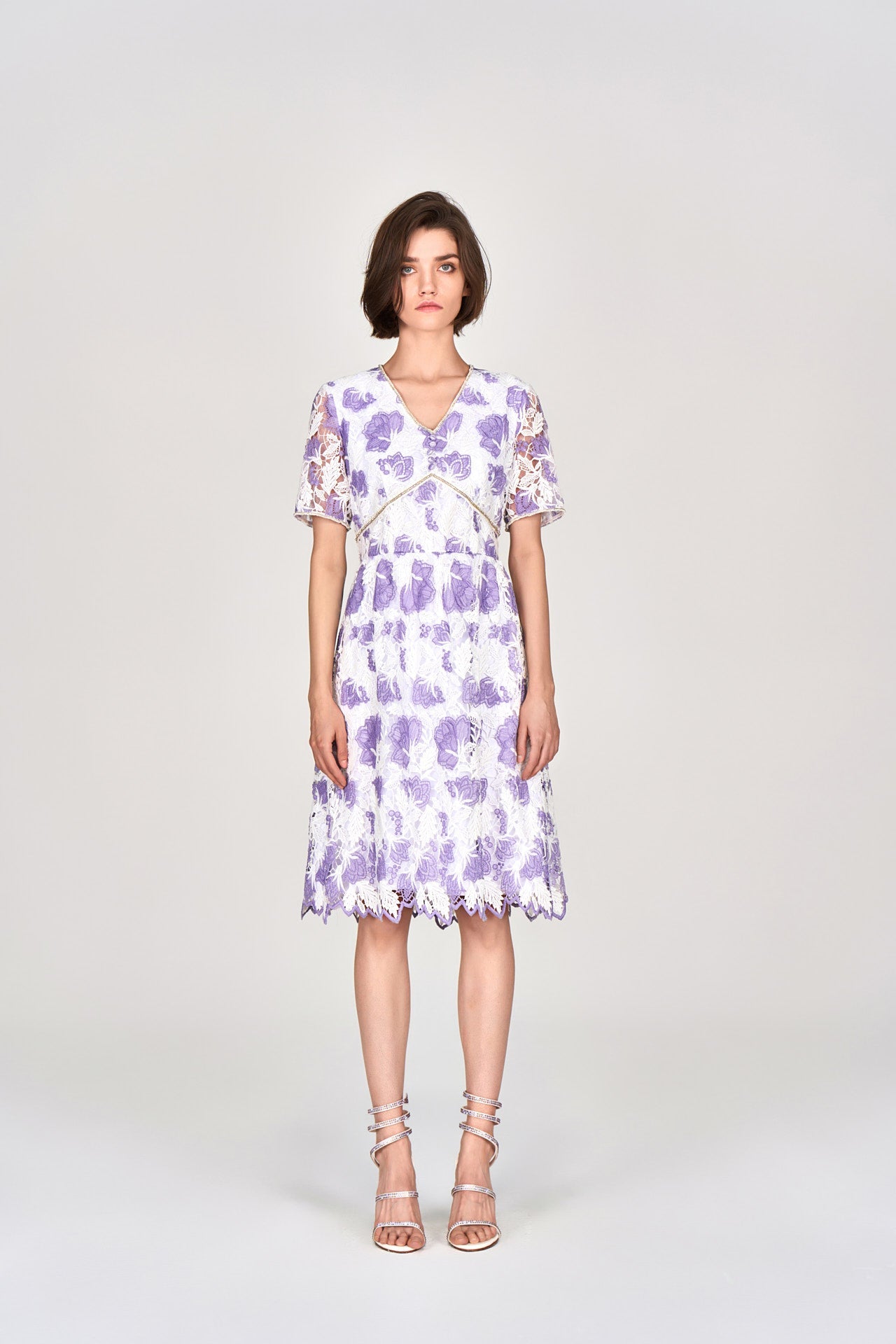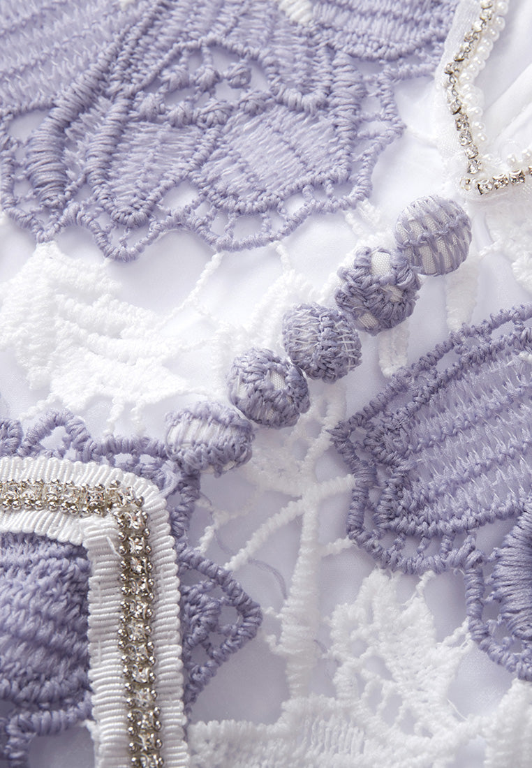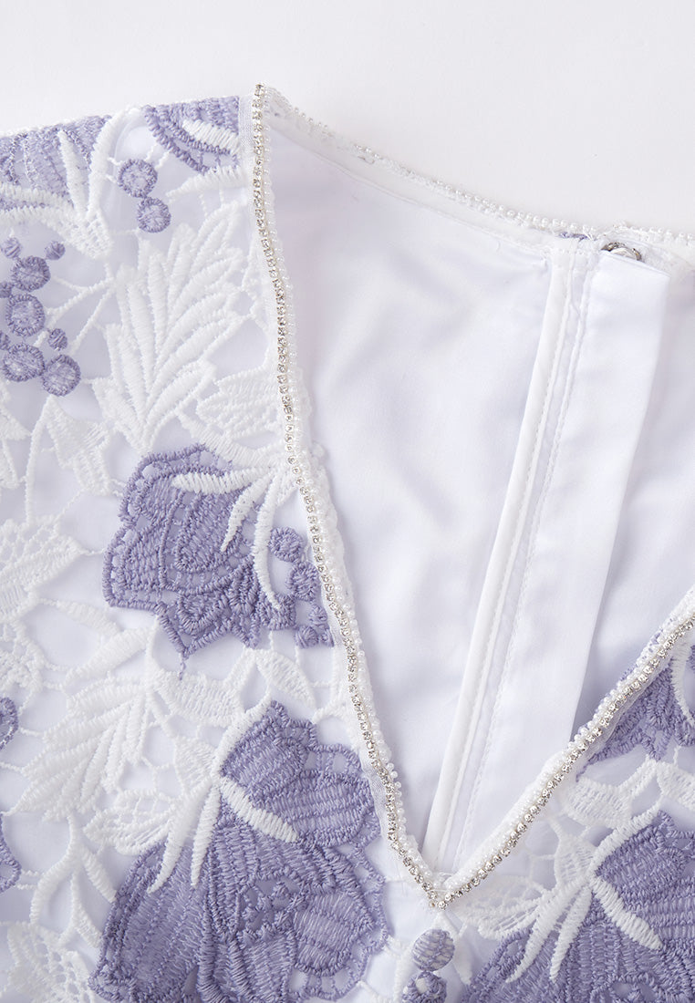 One lithe and graceful spring/summer item you do not want to miss. Overlaid in white lace with purple flowers, the piece evokes your feminine charisma. Finish up with beaded and rhinestone trimming highlighting waistline, v neck and cuffs.