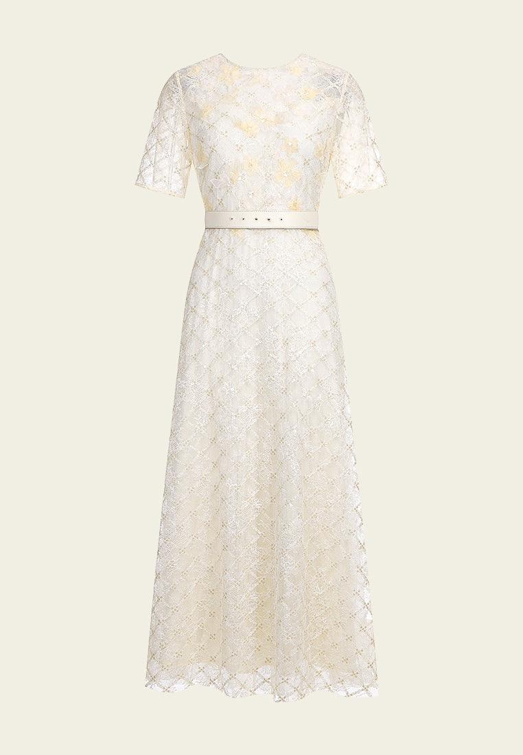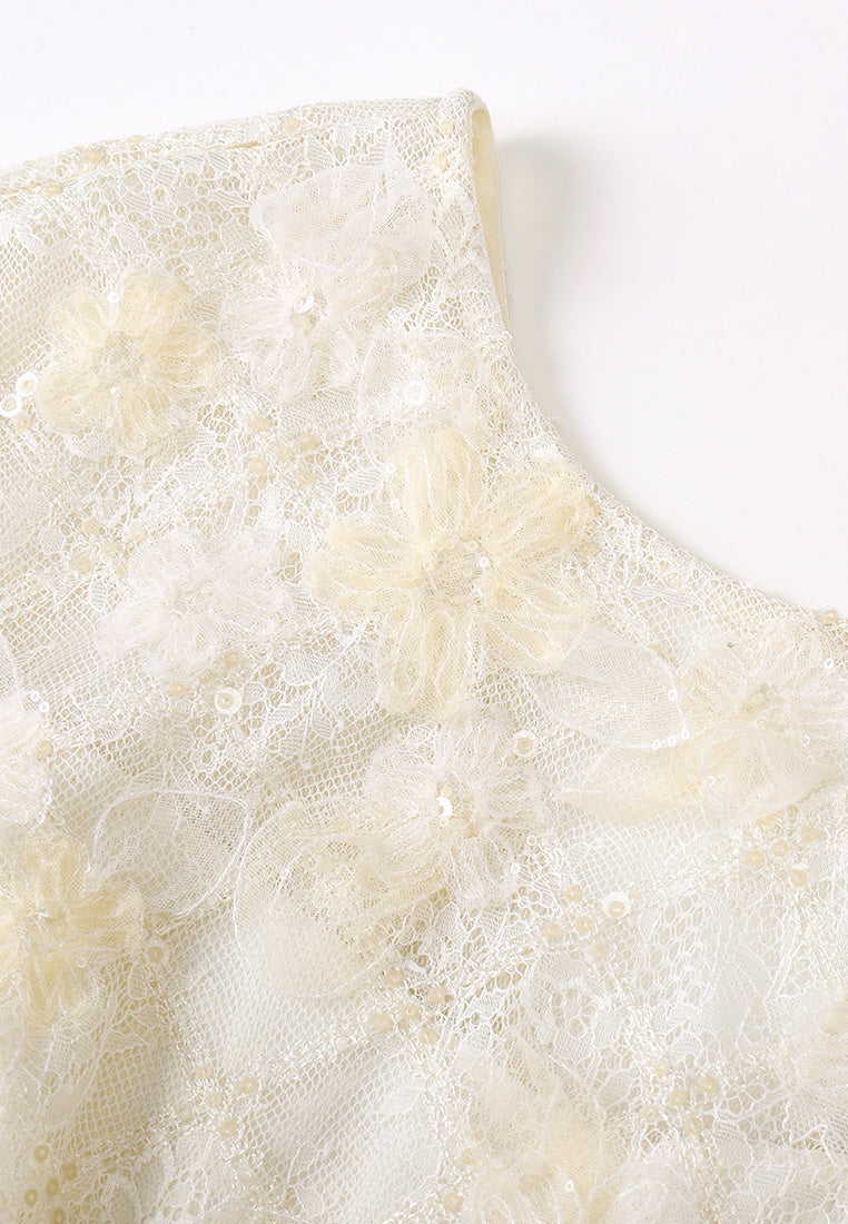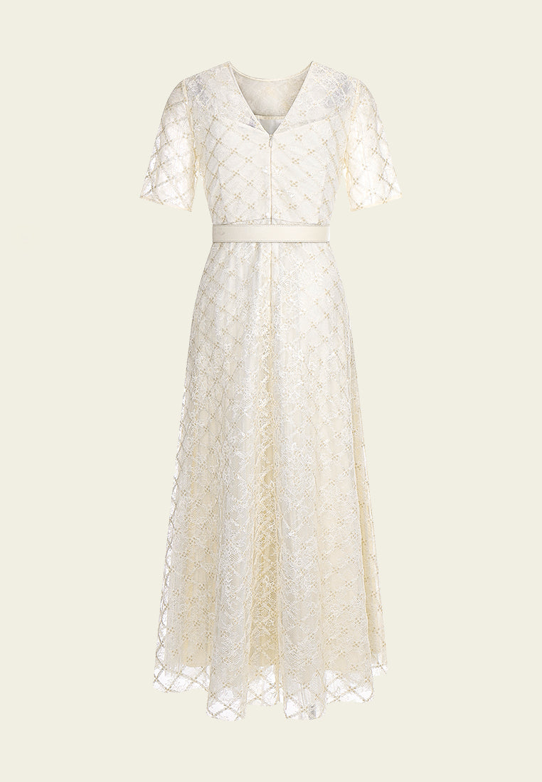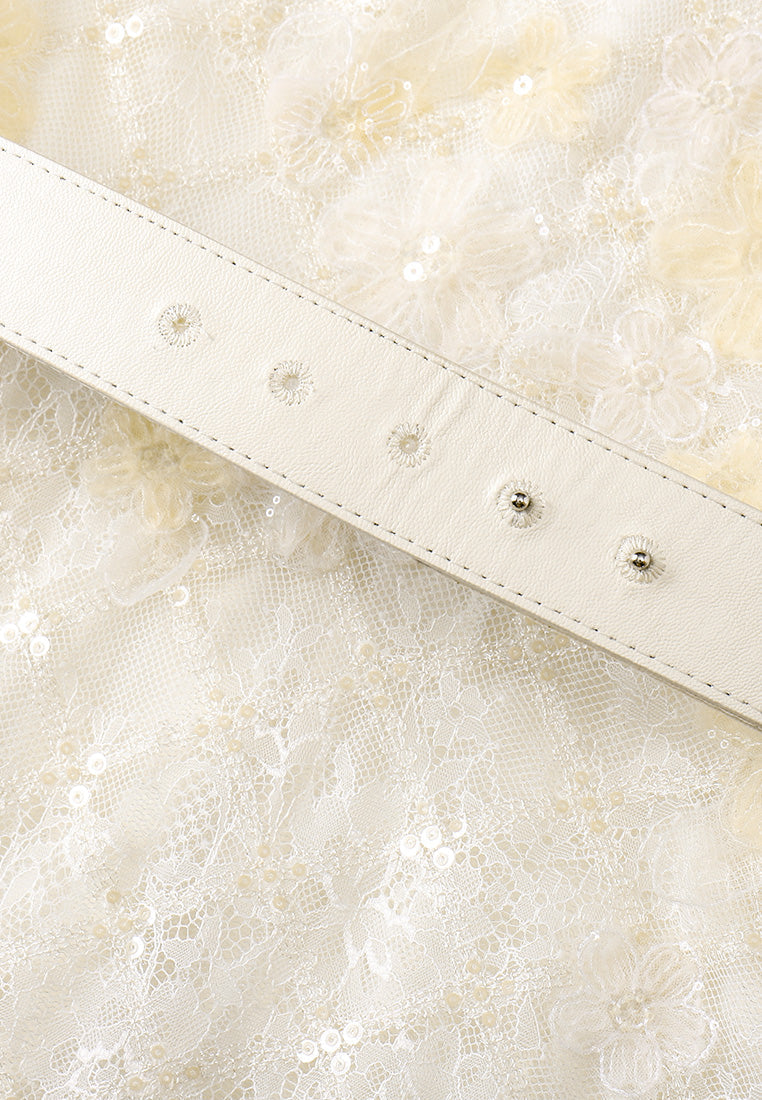 An evening dress evokes an airy, yet friendly charisma. Checked lace in sophisticated beige colorway, understatedly highlighted with same tone sequins. Boasting 3D floral embellishment and leather belt. Wear it to evening gatherings and cocktail parties to make people come to you.