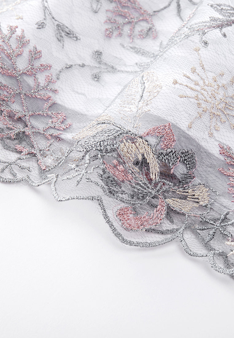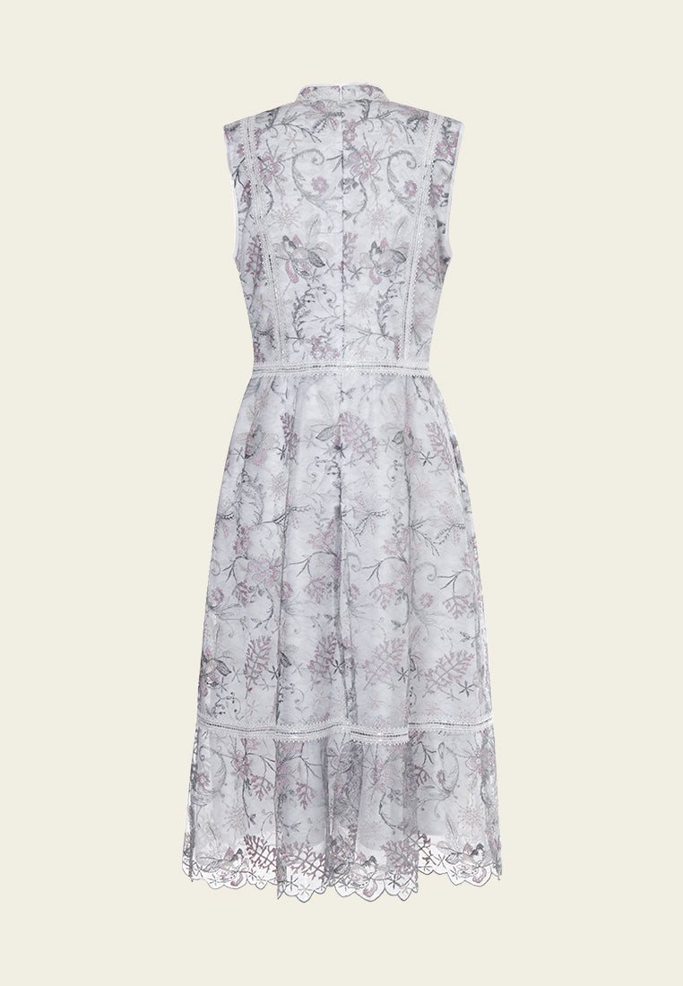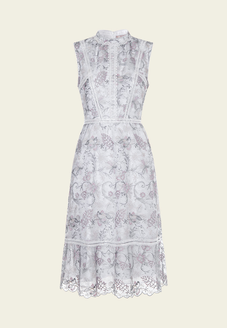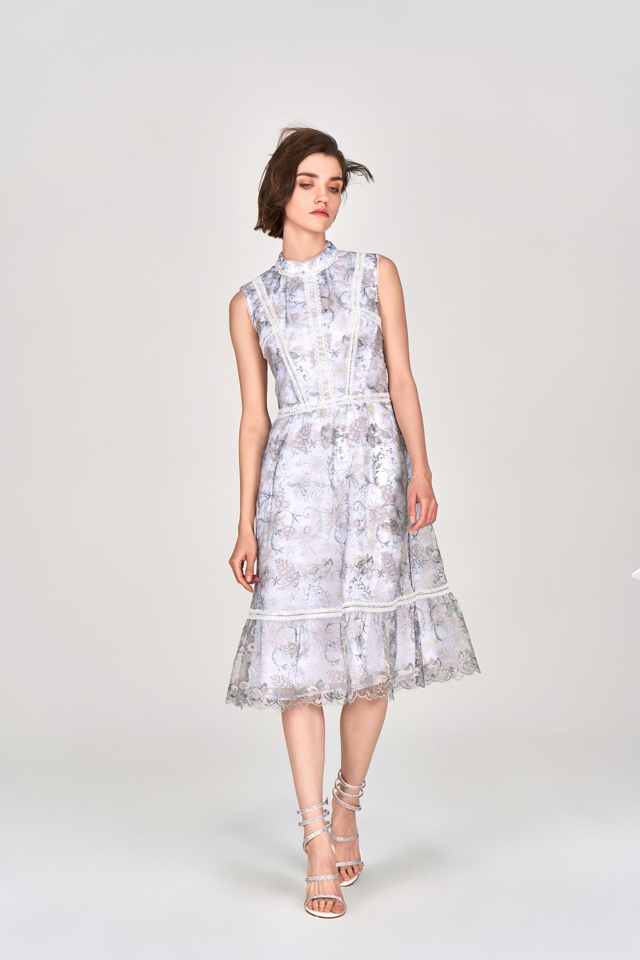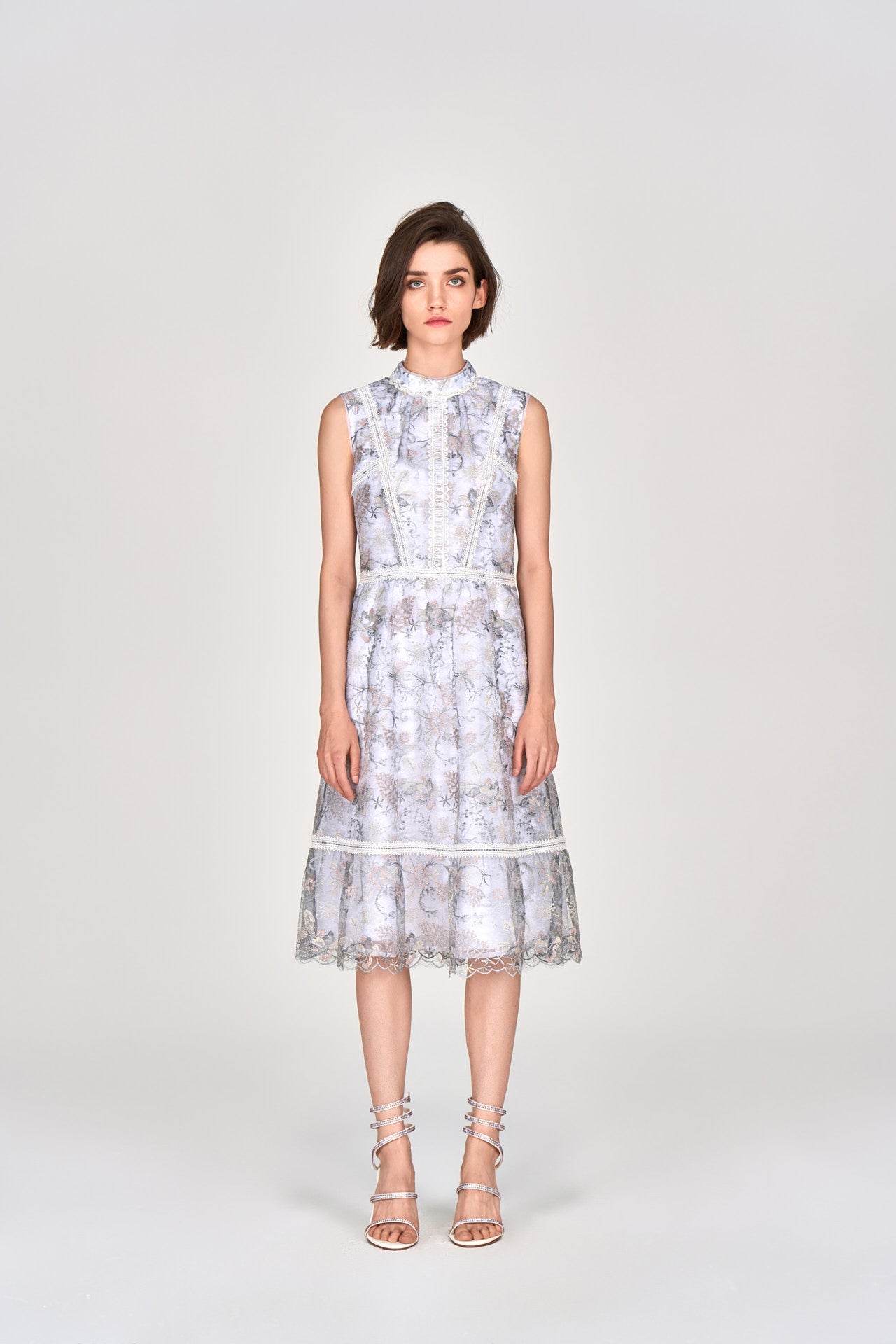 "Unique" and "graceful" are the best adjective to describe this item. Light grey and dull pastel tone encounter in harmony. Embroidery flowers gracefully overlaid. Silhouette highlighted with white lace. Sleeveless. Own it to make heads turn for your feminine charisma.