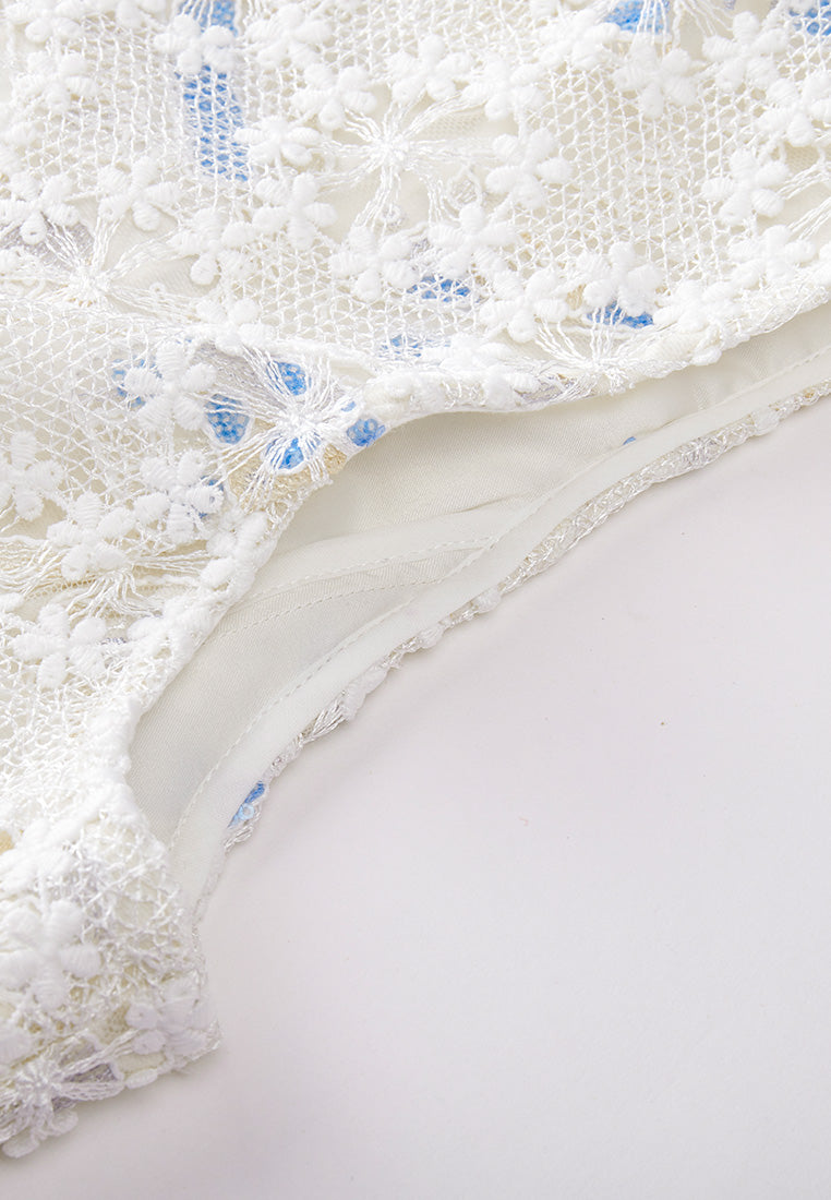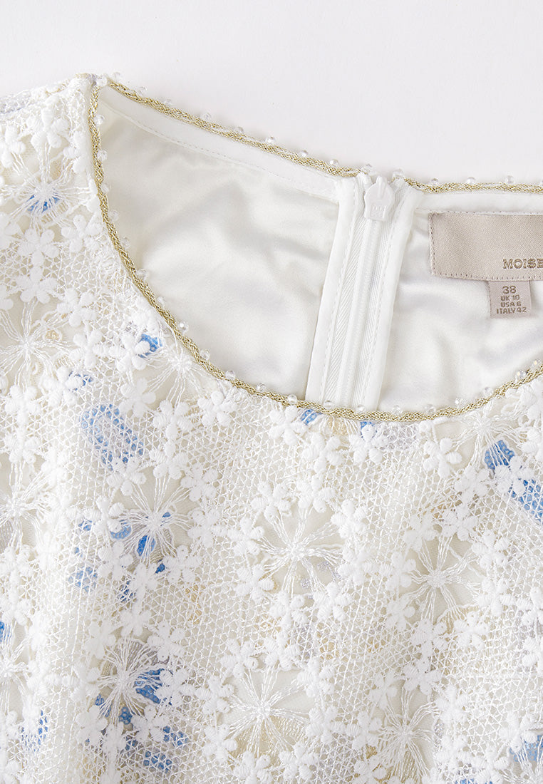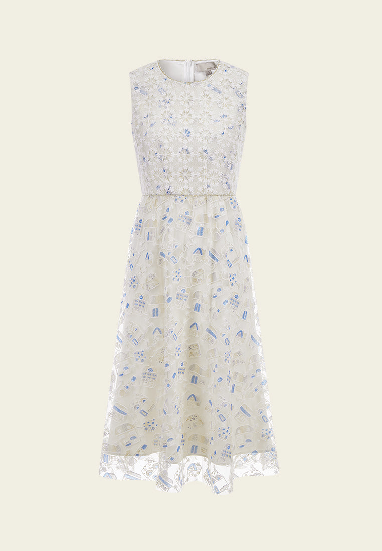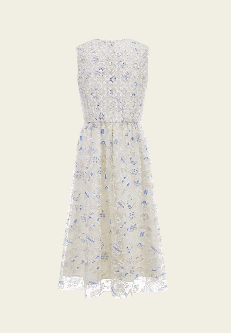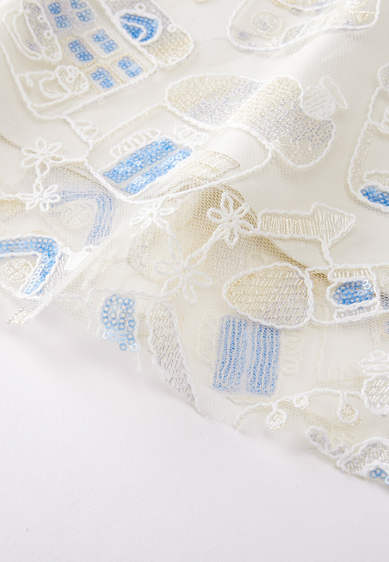 Live a dreamy fantasy with this ethereal item. Translucent mesh overlaid with cute houses and buildings, details made with sequins delightfully flickers by reflection. Upper body covered up with floral lace, round neck and waistline decorated with golden lace and pearls.