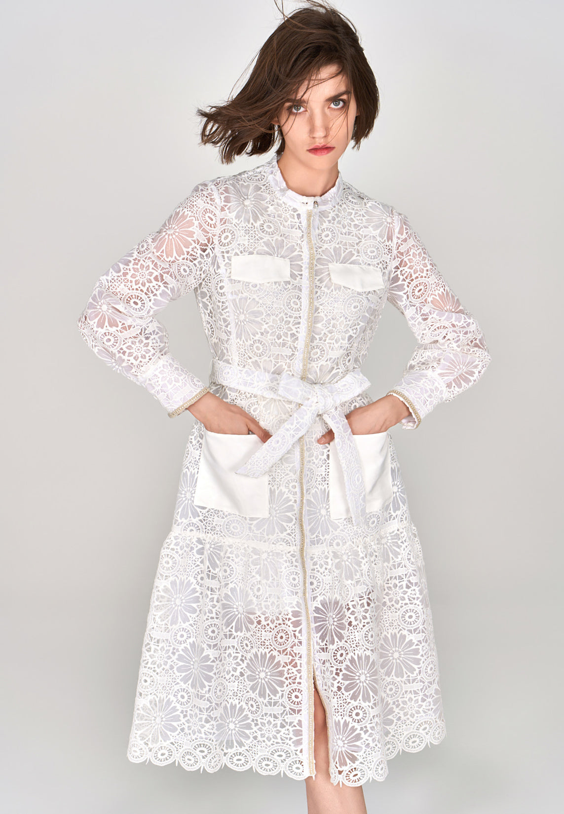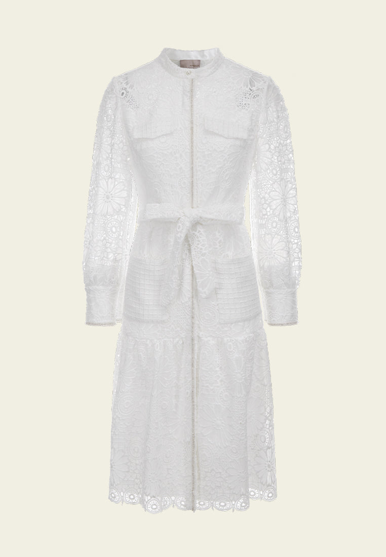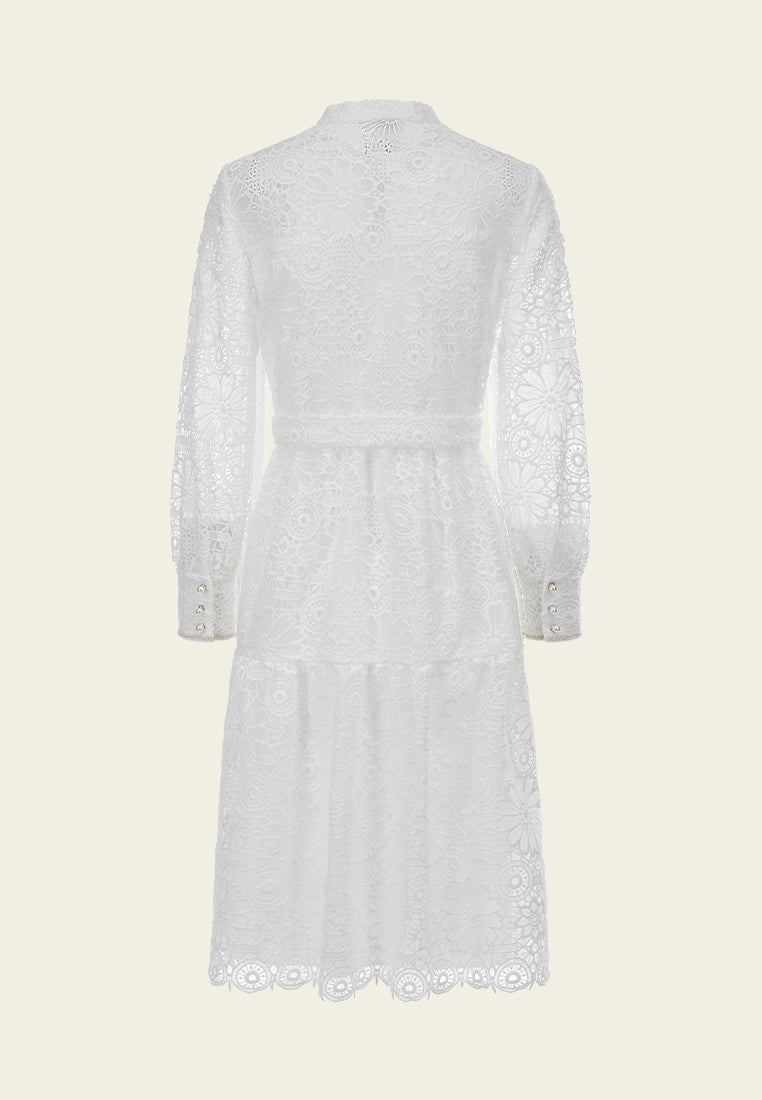 White Lace Stand Collar Tie Waist Dress