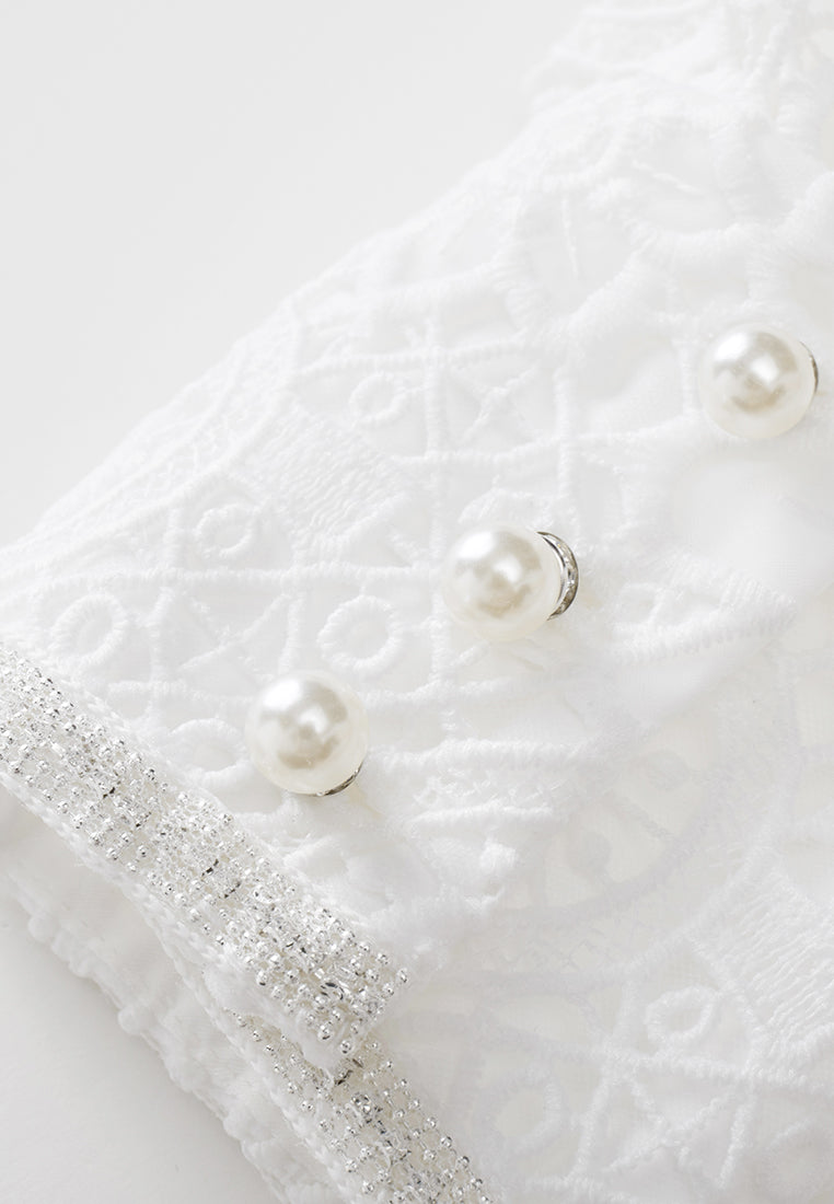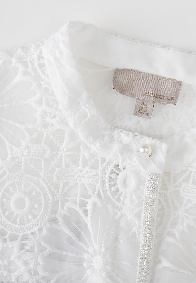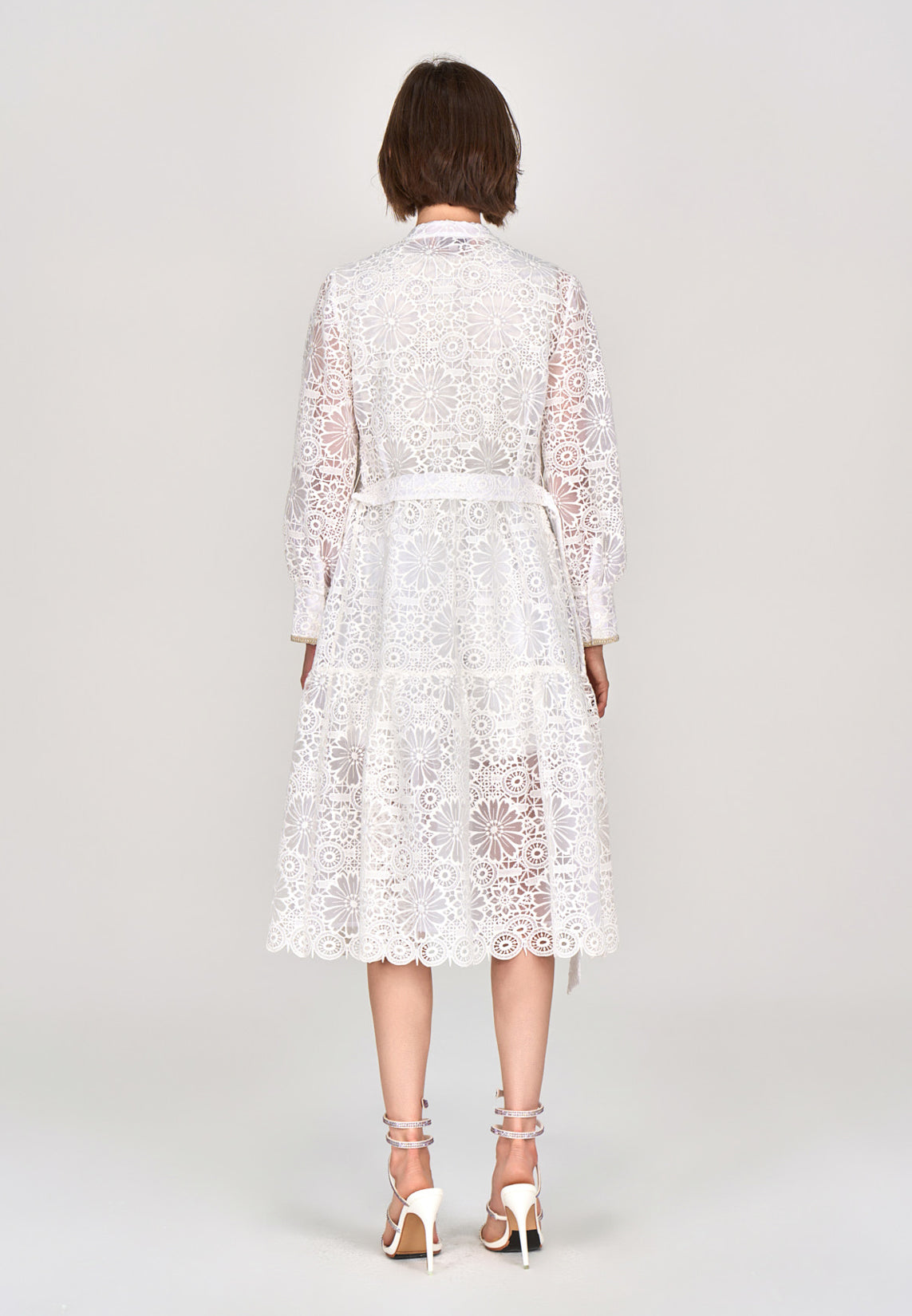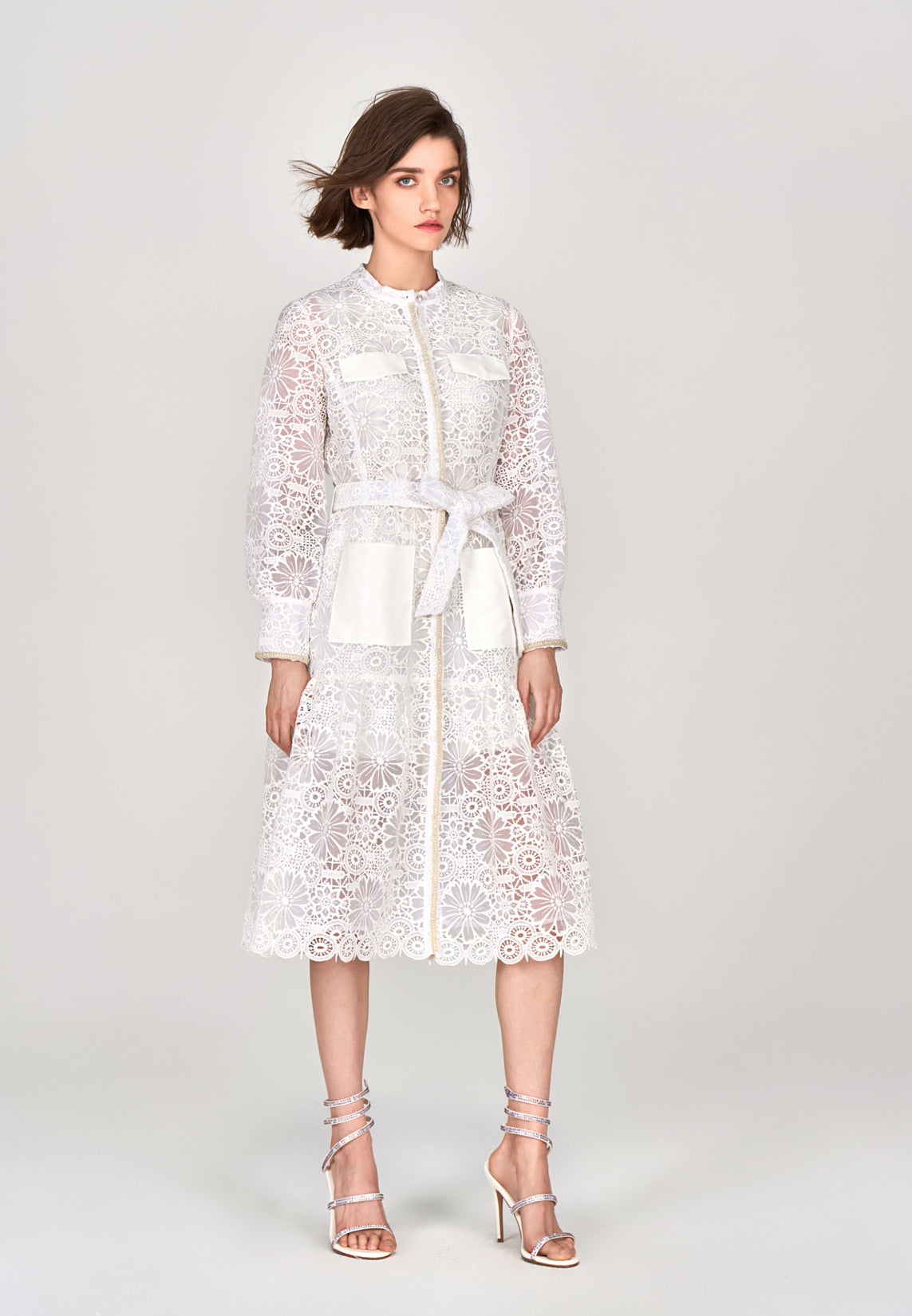 White Lace Stand Collar Tie Waist Dress