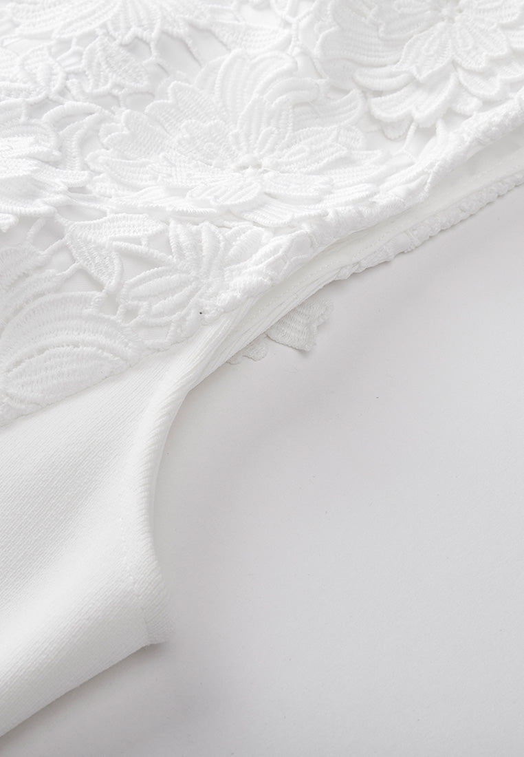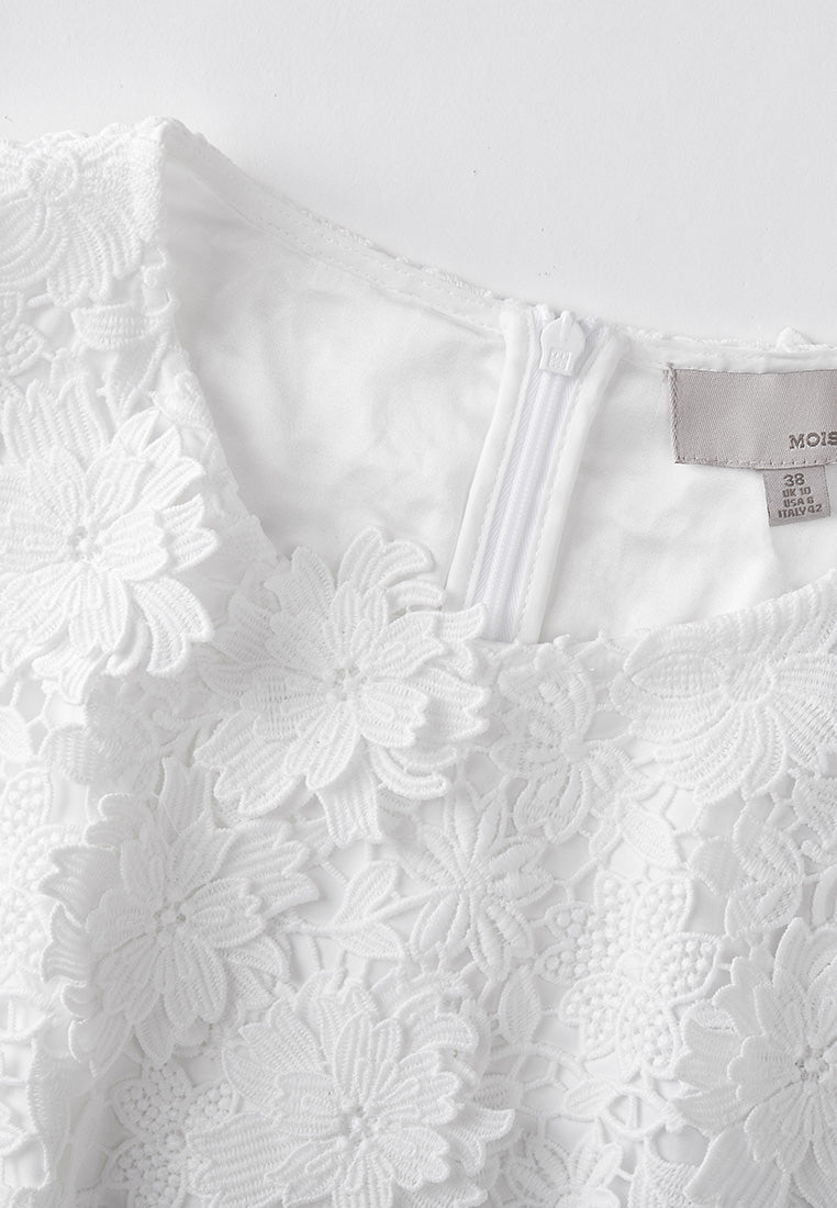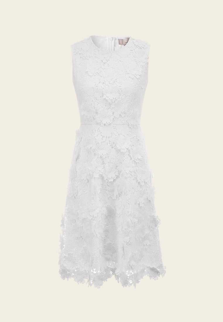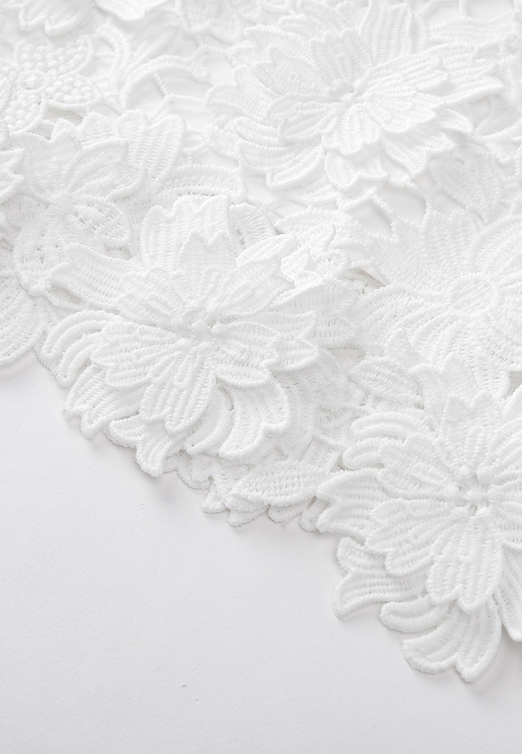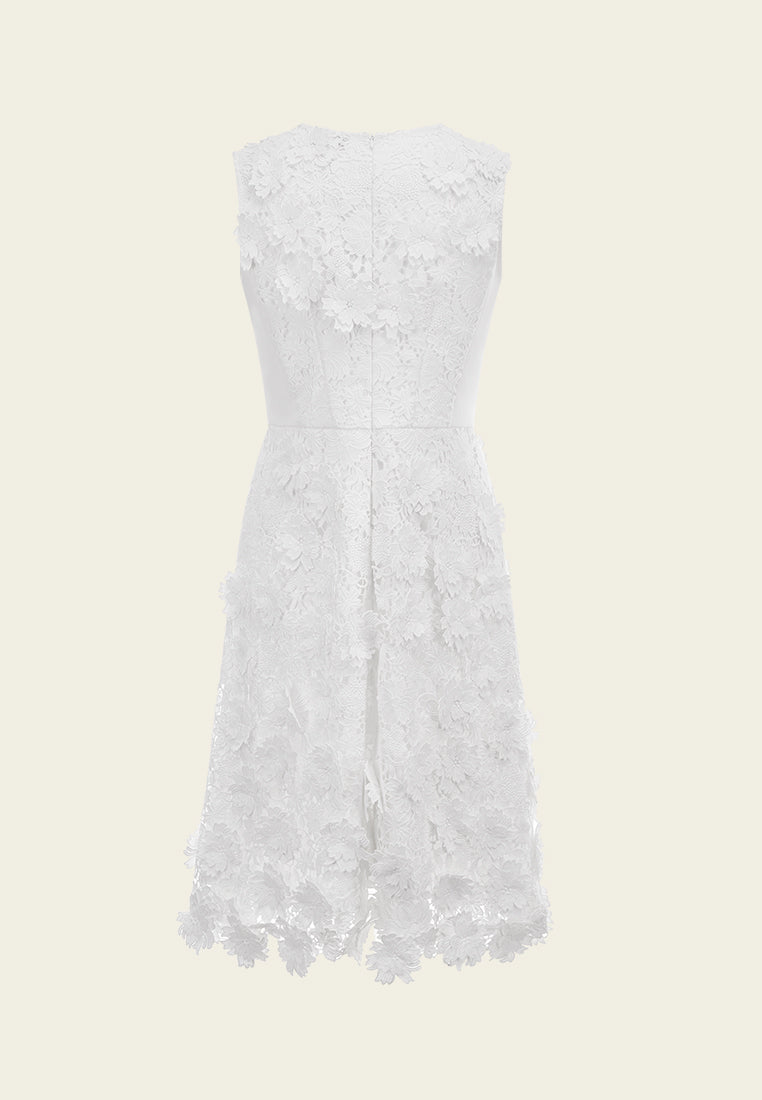 Your best summer ethereal outfit. White lace dress intricately filled with floral pattern, gracefully layer up to enrich the item. Sleeveless, keeps you cool and refined. Your new go-to outfit for cocktail parties, gatherings and dignified occasions.