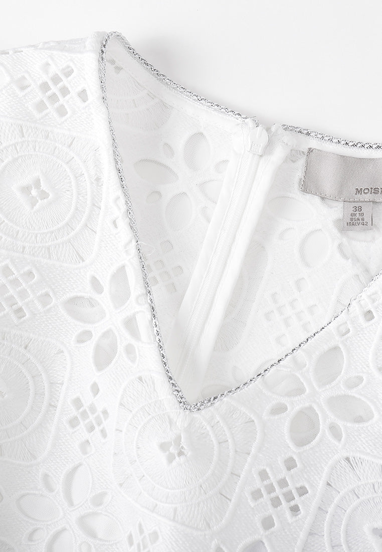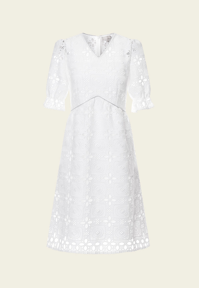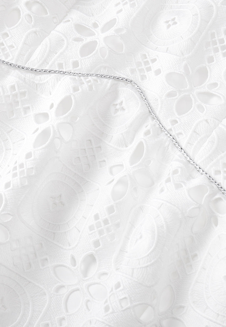 Make heads turn for your classy charisma with this airy lace dress. White colorway represent pureness. Graceful lace encrusted with nostalgic hollow carved pattern. Puff sleeves. Finish up with a hint of shimmering silver at the collar and the waistline. Embedded lining, makes it your to-go feminine holiday wear.