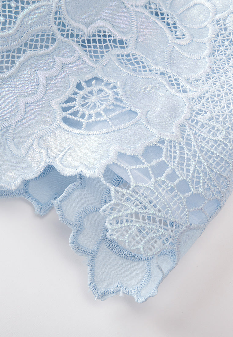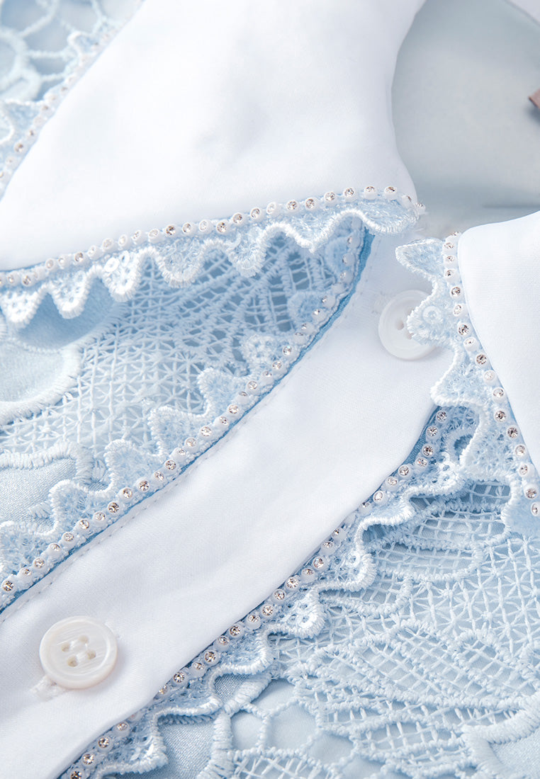 Revitalize your summer wardrobe with this splash of serenity. The delicate light blue and white hues balance harmoniously, creating a feeling of lightness and grace. Adorn yourself with a statement floral lace, whose embellishments glimmer along the lapel and front of the bust.