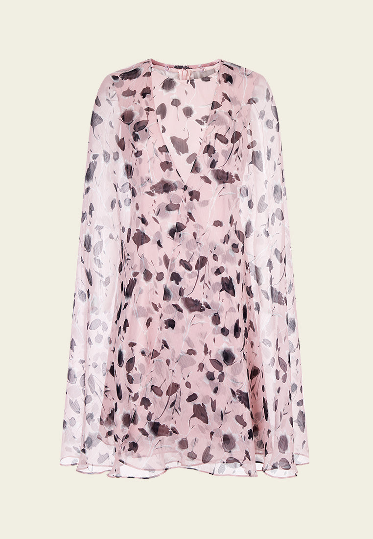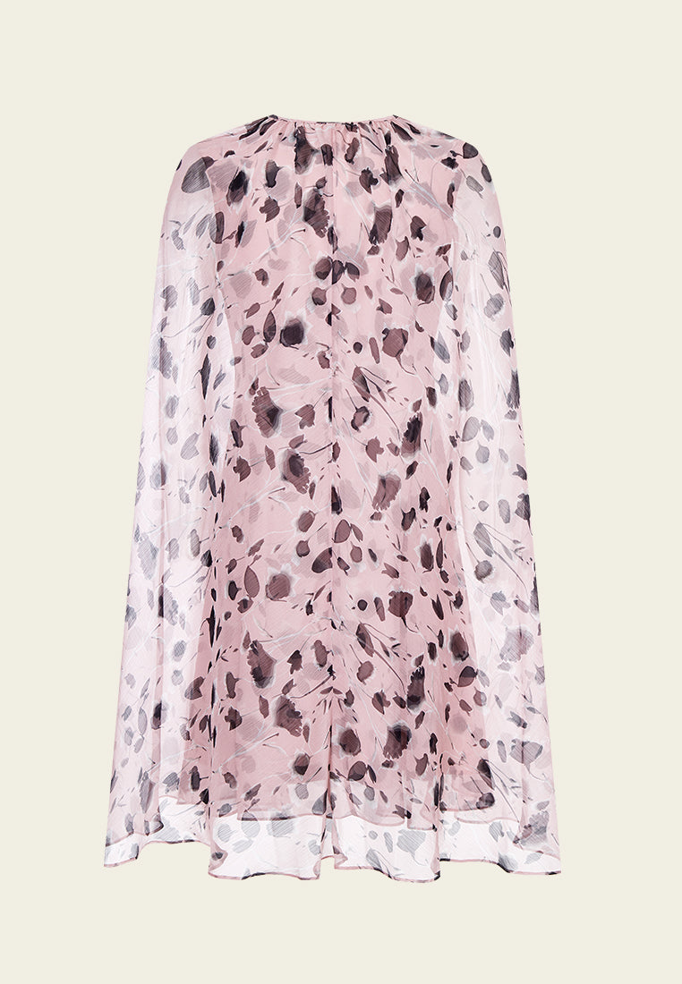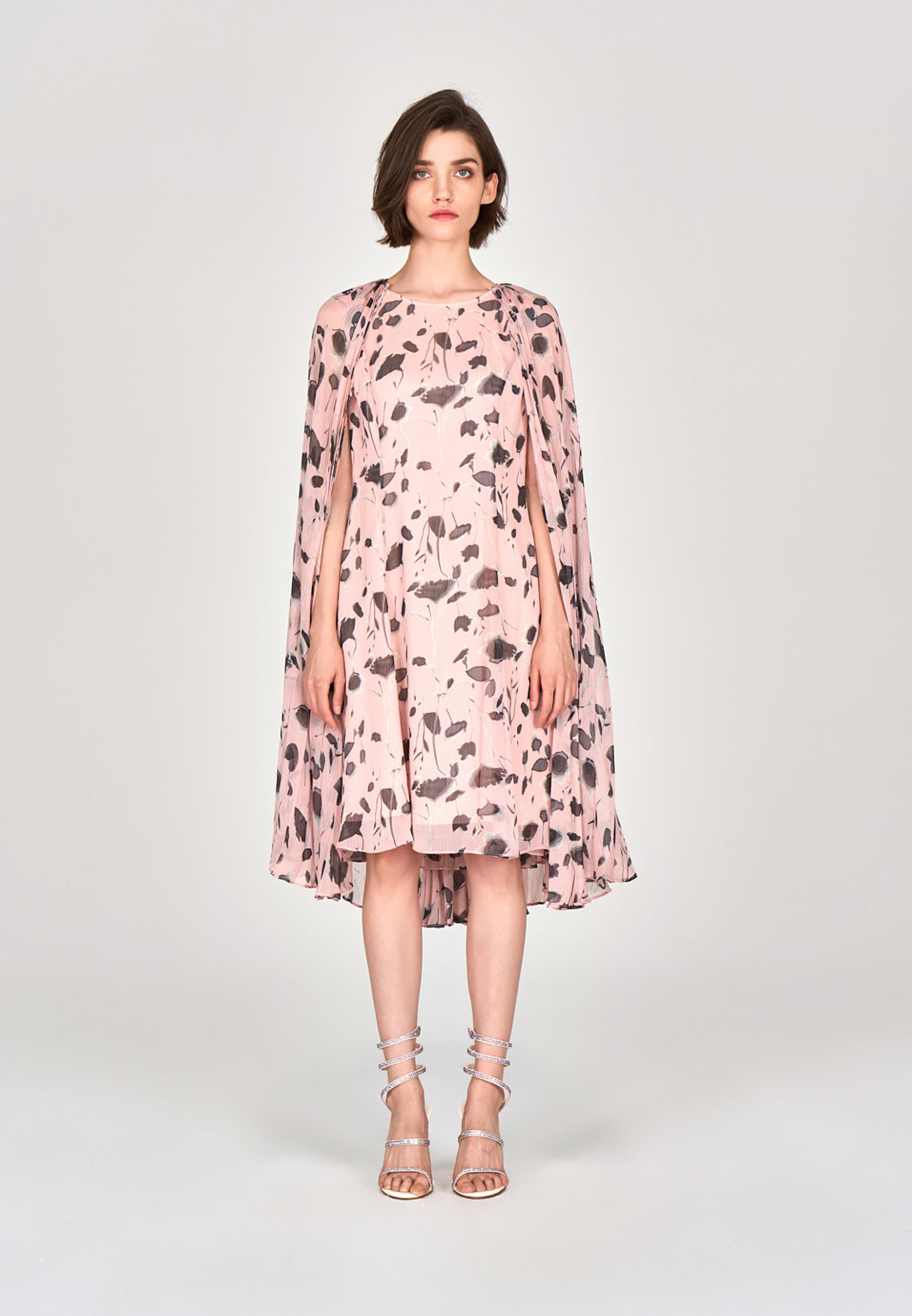 One-and-only cape dress. Put it on and overlay yourself with lithe and gracefulness. Chiffon overlaid with white flowers fall on pink colorway. Own it to make heads turn in commercial and social occasions with your feminine charisma.