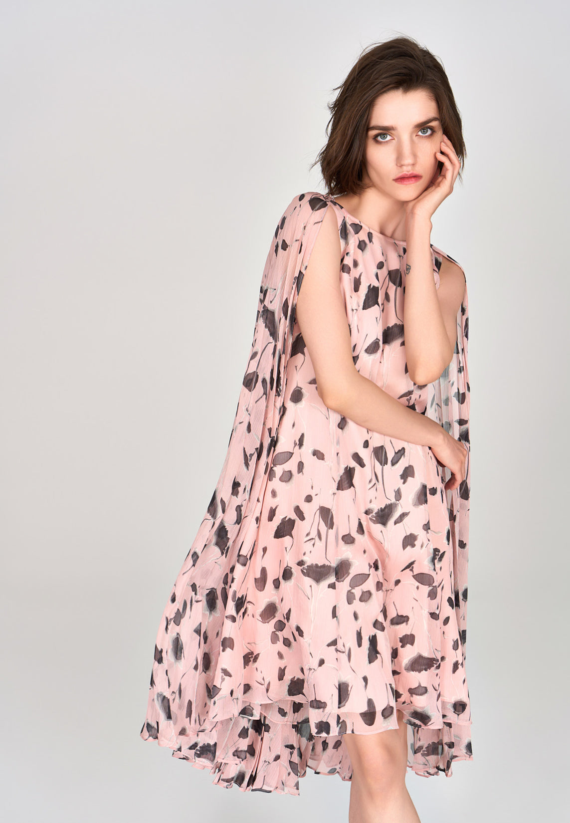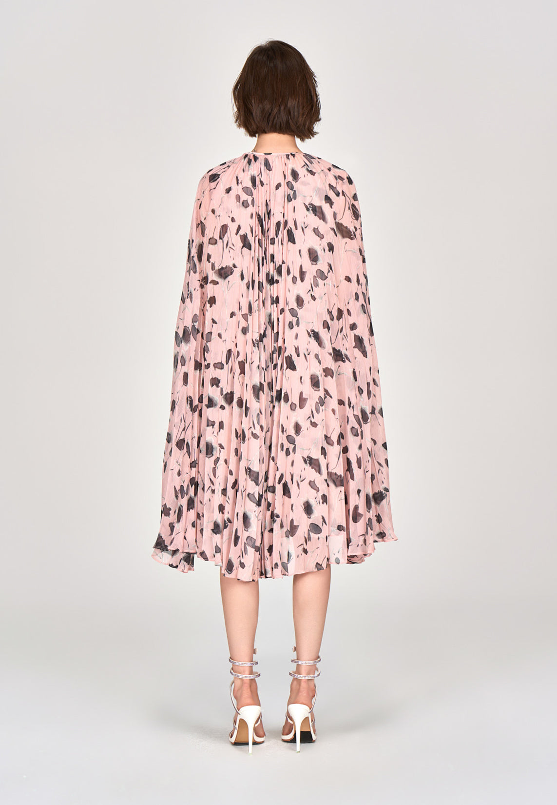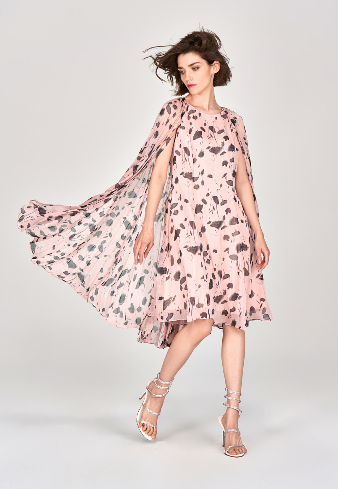 One-and-only cape dress. Put it on and overlay yourself with lithe and gracefulness. Chiffon overlaid with white flowers fall on pink colorway. Own it to make heads turn in commercial and social occasions with your feminine charisma.