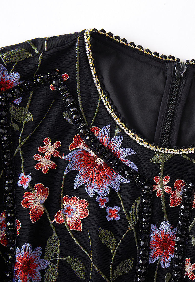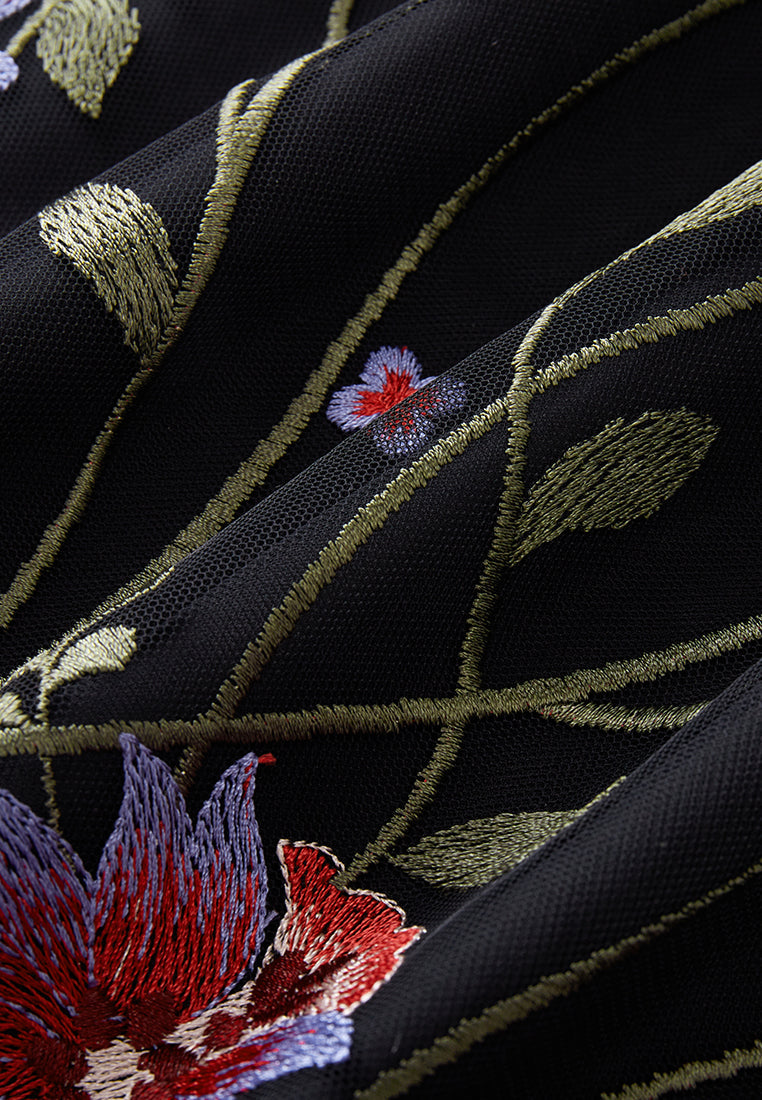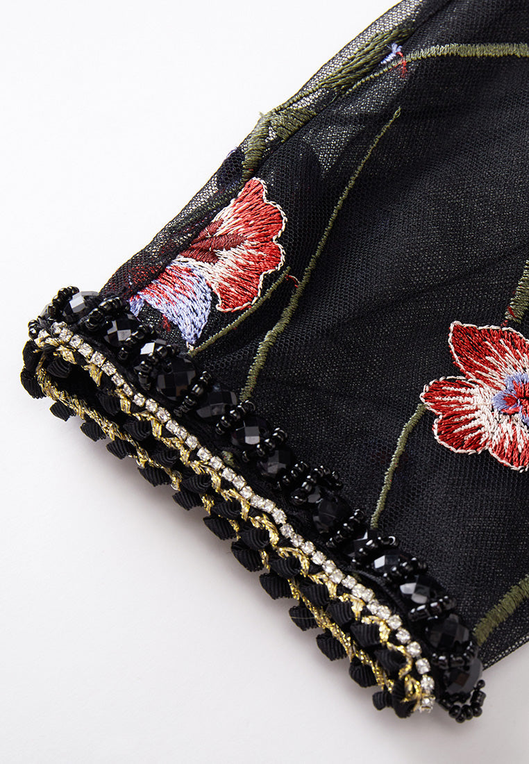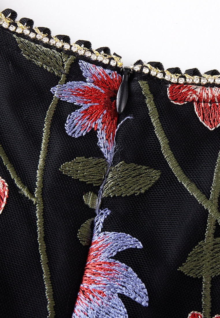A mature, delicate one piece, showcasing your status and temperament. Bright colorway floral embroideries overlay on contrasting black, reminicent of top class craftsmanship of oriental tribe costumes. Black Beaded embellishment mimic the vest part of tribal costume.