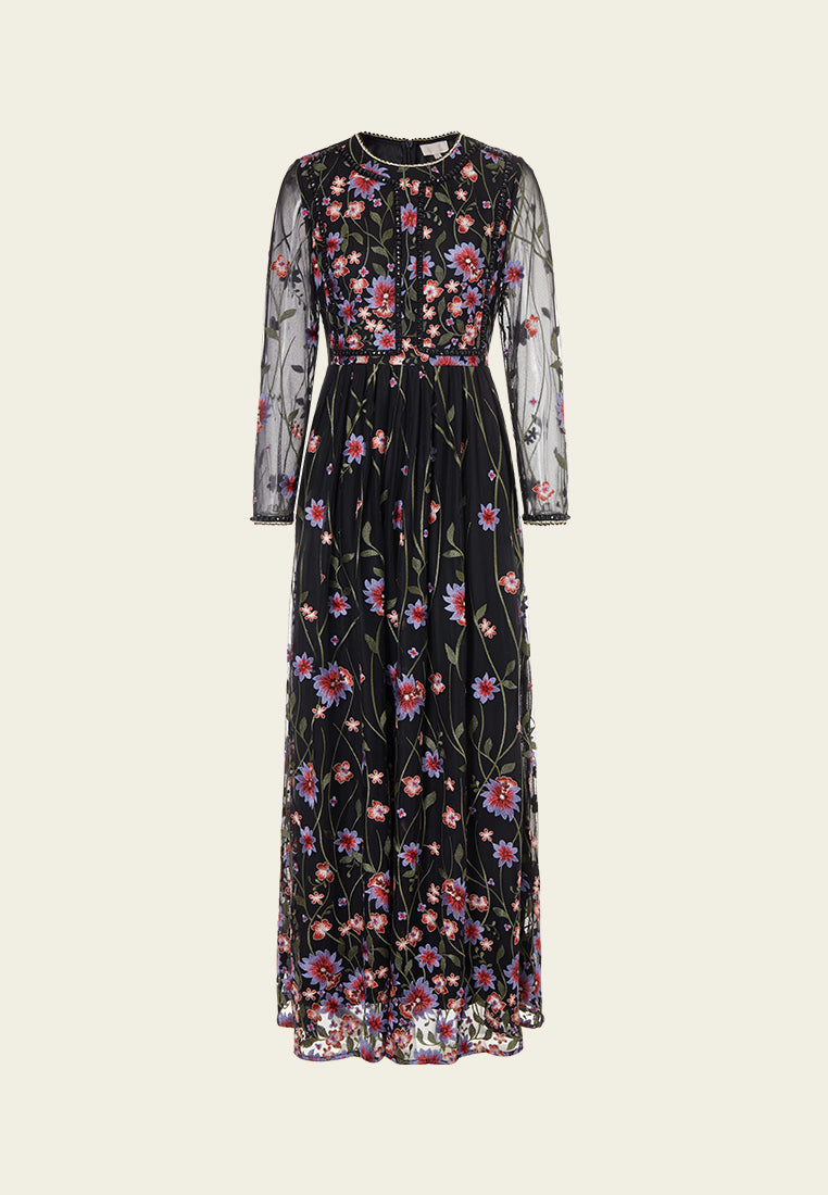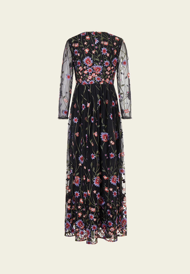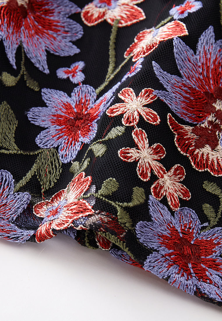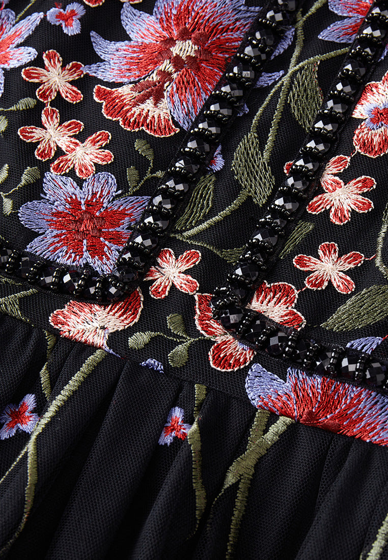 A mature, delicate one piece, showcasing your status and temperament. Bright colorway floral embroideries overlay on contrasting black, reminicent of top class craftsmanship of oriental tribe costumes. Black Beaded embellishment mimic the vest part of tribal costume.