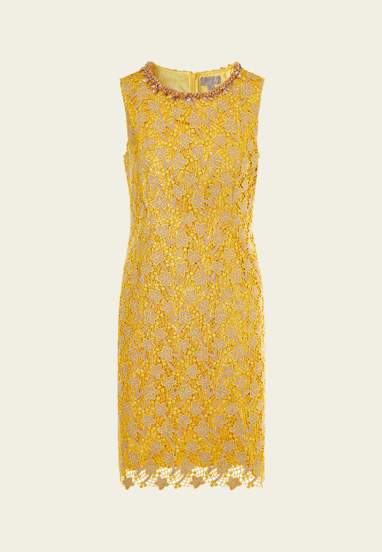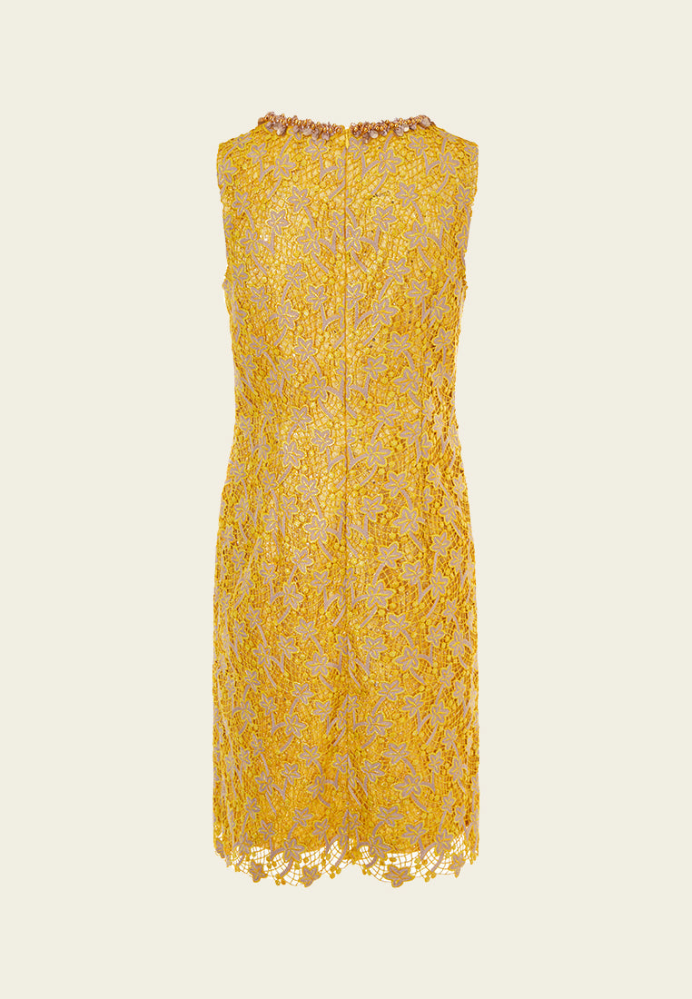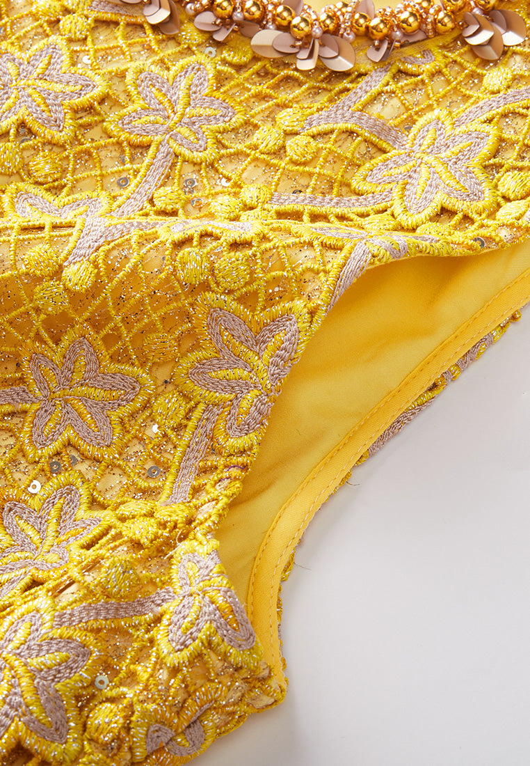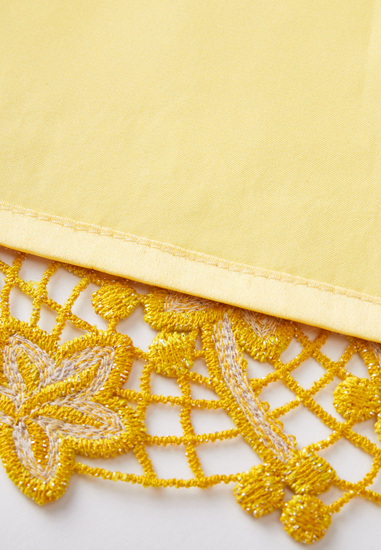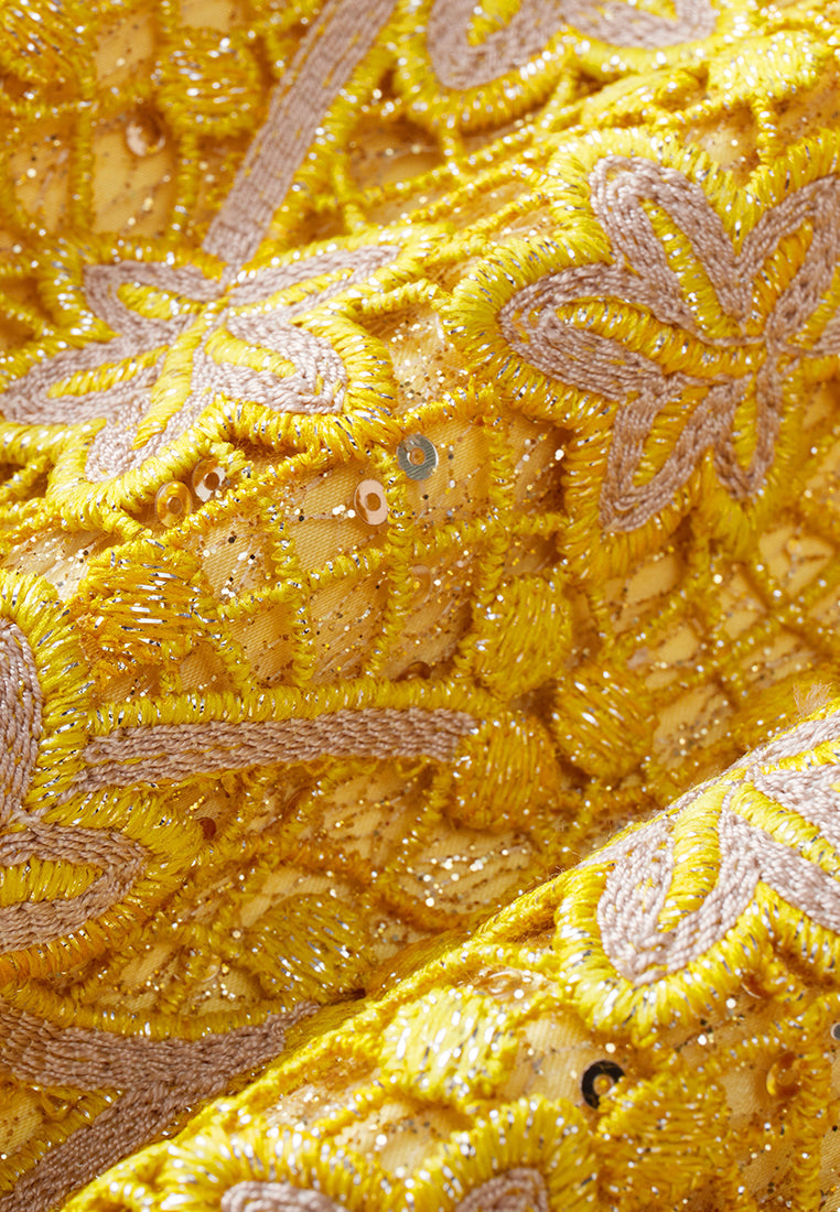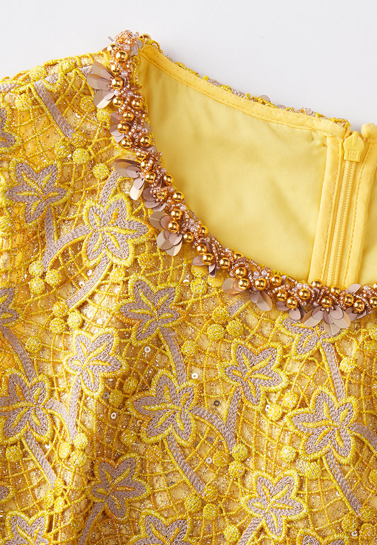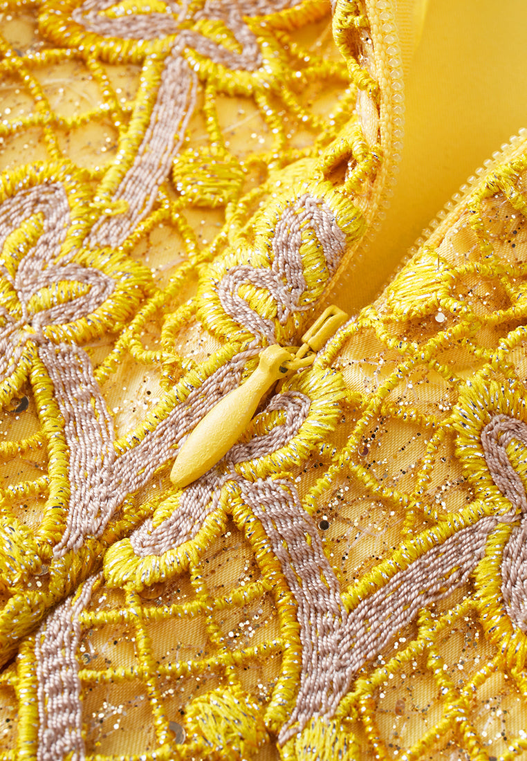A prestige dress filled with opulent details. Golden and yellow tone sets the luxurious, noble feeling. Golden lurex lace overlaid with a delicate layer of hollow carved embroidery, with autumn leaves fall all over. Finish up with bold trims highlighting the collar.