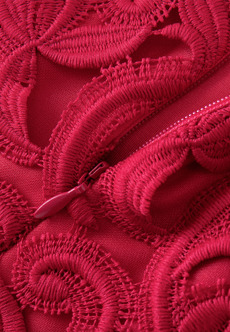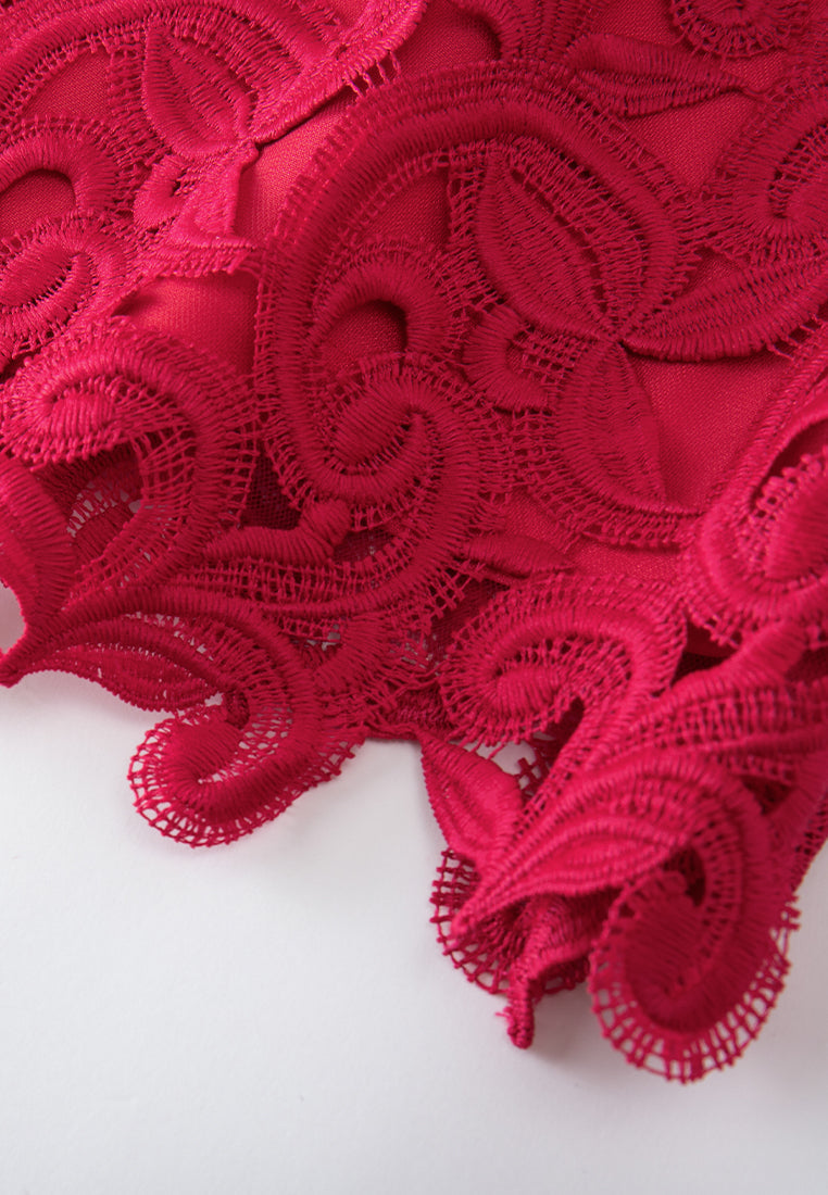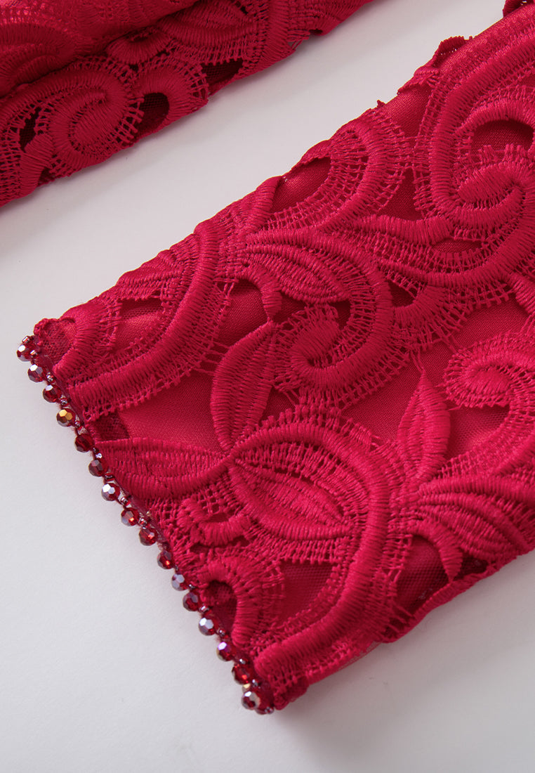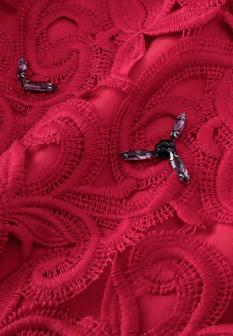 A bold and confident item, showcase one's ambitious and passionate character on what she loves. Red colorway sets the feeling. Statment and bold hollow carved lace echoes the approach. Upper body and round collar embellished with shimmering beads. Accentuated waistline.