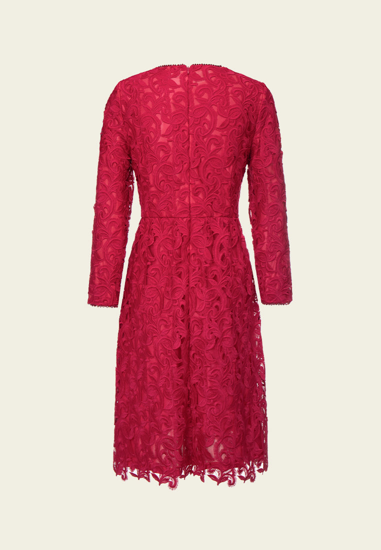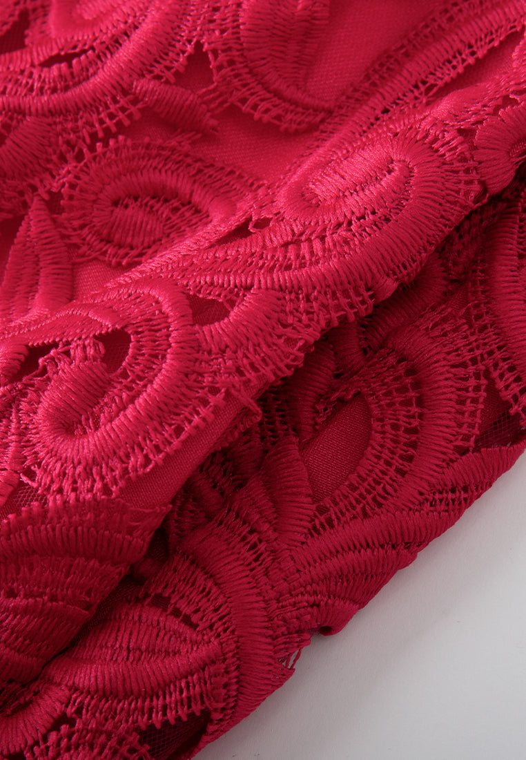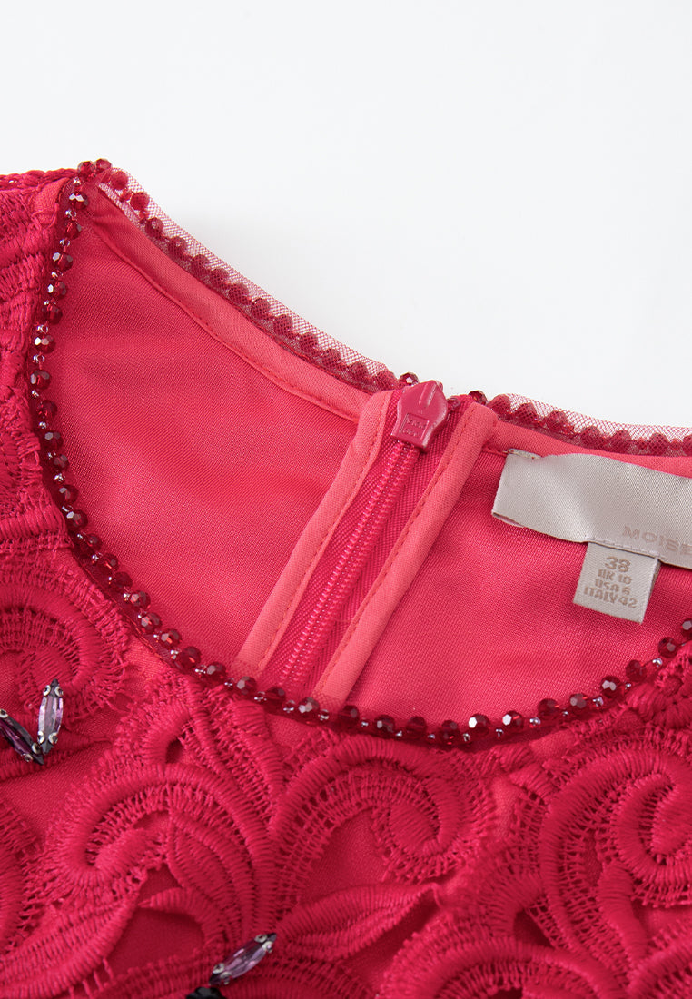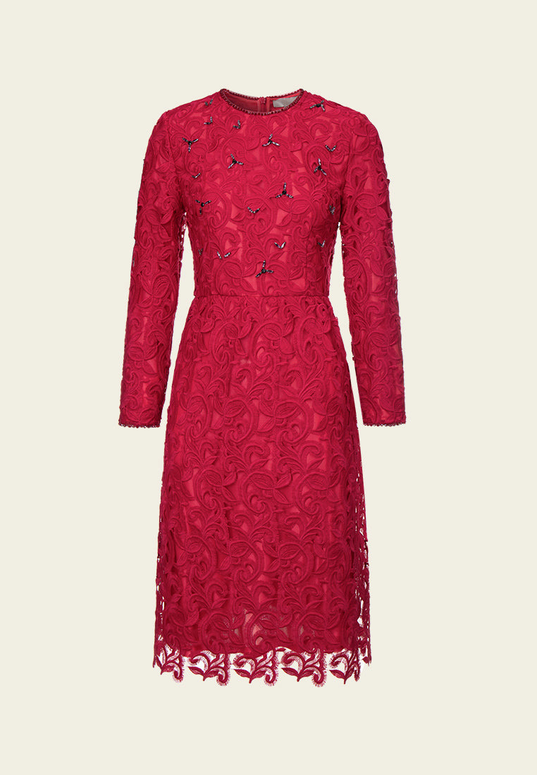 A bold and confident item, showcase one's ambitious and passionate character on what she loves. Red colorway sets the feeling. Statment and bold hollow carved lace echoes the approach. Upper body and round collar embellished with shimmering beads. Accentuated waistline.
