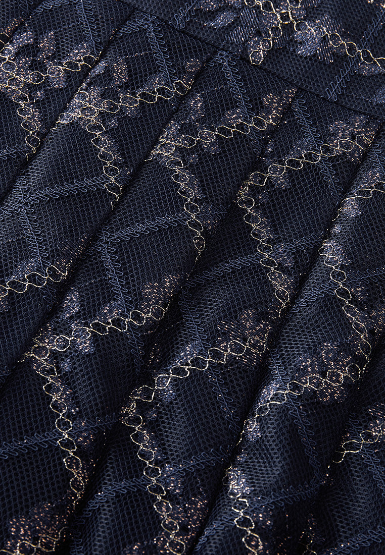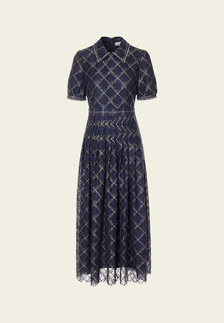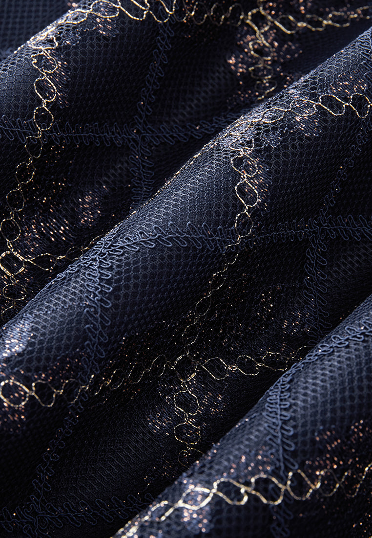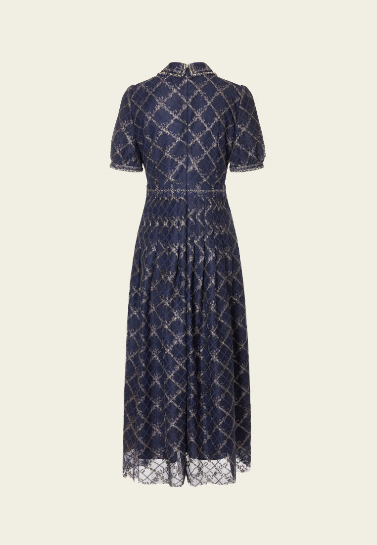 Neat and cultured, impress people with your temperament, and a hint of cuteness in this dress. Dark blue mesh overlaid with checked pattern, highlighted with golden lurex details and check pattern. Puff sleeves, pleated detail below waistline.