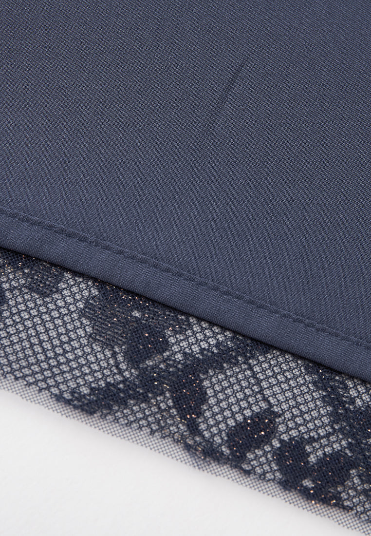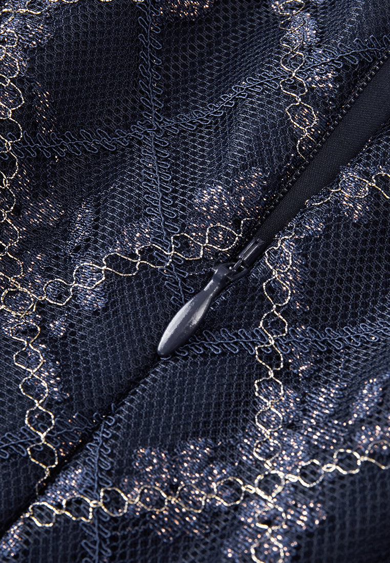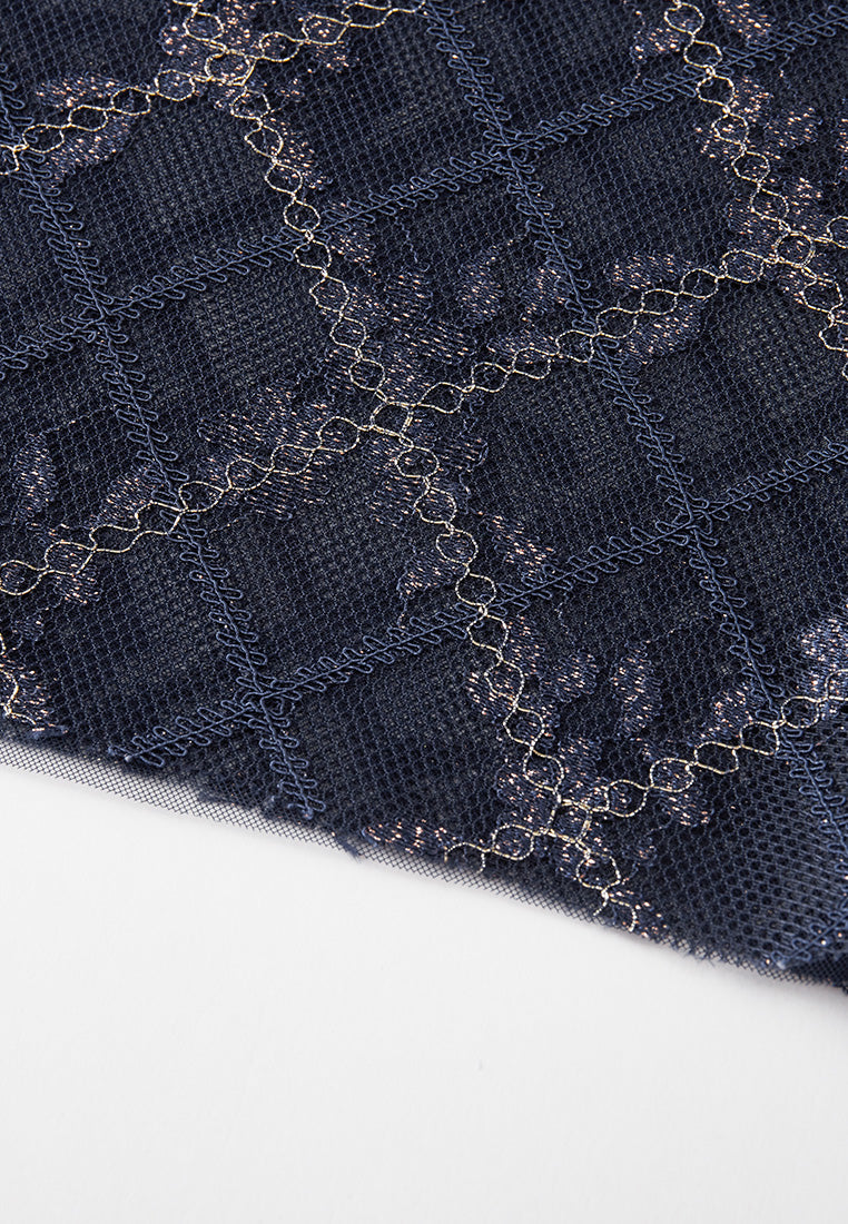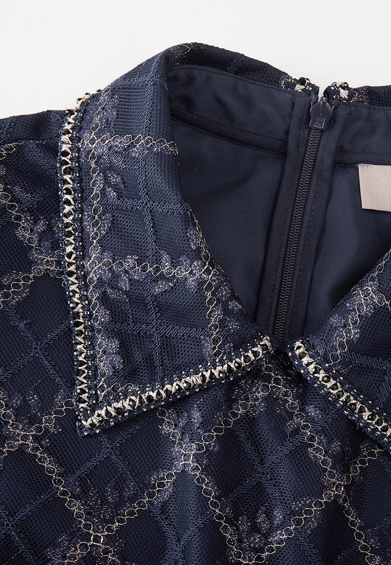 Neat and cultured, impress people with your temperament, and a hint of cuteness in this dress. Dark blue mesh overlaid with checked pattern, highlighted with golden lurex details and check pattern. Puff sleeves, pleated detail below waistline.