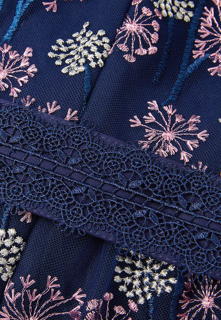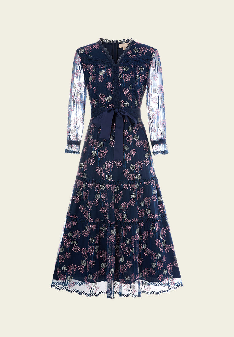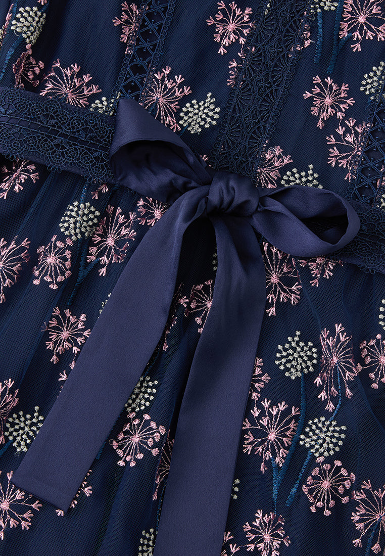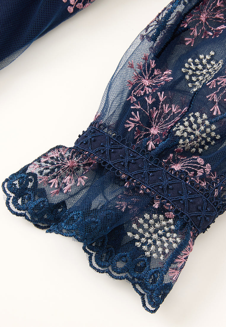 A mesh dress overlayed with delicate details: Contrasting light-colored dandelion embroidery pattern falls allover dark blue mesh. Arm skin lurks through puff sleeves. Lace trim outline the structure and panelles. Round up by a waist-accentuating tie belt.